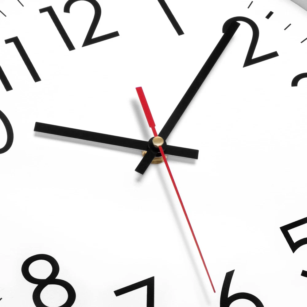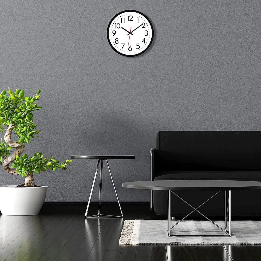 Easy to Read - 12”Large black numerals and red second hand with a non-reflective white clock face that enables you to read it from a distance across the room. The glass lens makes it easy to clean and keeps dust out of the dial Keeps accurate time - The battery operated wall clock tells you the time all day long and is suitable for daily use Silent wall clock - No ticking and buzzing sound, can ensure you work and sleep quietly Simple design - The plastic case of the wall clock is high quality and very sturdy, durable enough for gyms, living rooms, offices, offices, schools Easy to install by oneself - Come with a hook, wide slot in back for easy hanging. Battery powered, requires AA carbon battery (not included). (Alkaline battery or rechargeable battery which may have influence on the life span of clock movement, as well as the accuracy of the time).
