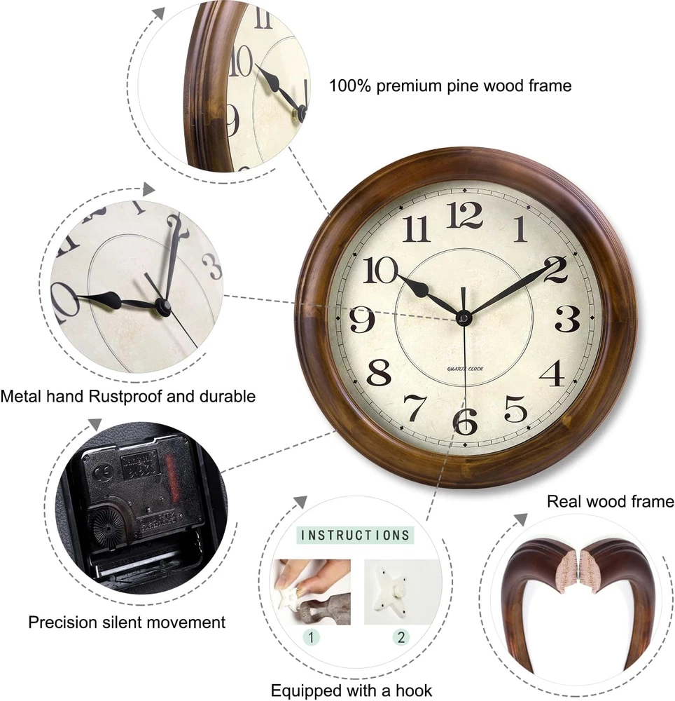 Large digital wall clock: Large wall clock with large black arabic numbers, super silent & non-ticking second hand easy to read. Retro Wall Clock: Perfect decorative wall clock for indoor, living rooms, kitchen, office, bedroom,dining room, study room, family rooms or conference room. Wood wall clock: This solid wood frame is handcraft, showing unique attractive wood grain color. With an elegant dial and high definition glass. Battery operated quartz movement (requires 1 AA battery - not included) (Note:For longer life please use Ordinary Carbon Battery instead of high duty alkaline batteries!). Come with a hook, wide slot in back for easy hanging. 365 days warranty,If any problems please feel free to contact us and we will provide friendly after-sale service for you. Product Description Description: Elegant, delicate, stylish retro wall clock made of high quality pine. Real solid wooden frame made from 100% genuine pine wood. Perfect color degree for Living Room, Bedroom, Kitchen, Dining room, Office, Library, Cafe, guest room etc. Packing List : 1 x Wall Clock 1 x Hook Please note : Because each piece of natural wood has different texture,irregular knots,and minor imperfections caused by handwork.So No two clocks are exactly the same.Also there are slight difference between the picture displayed and the real item caused by light brightness and different display.