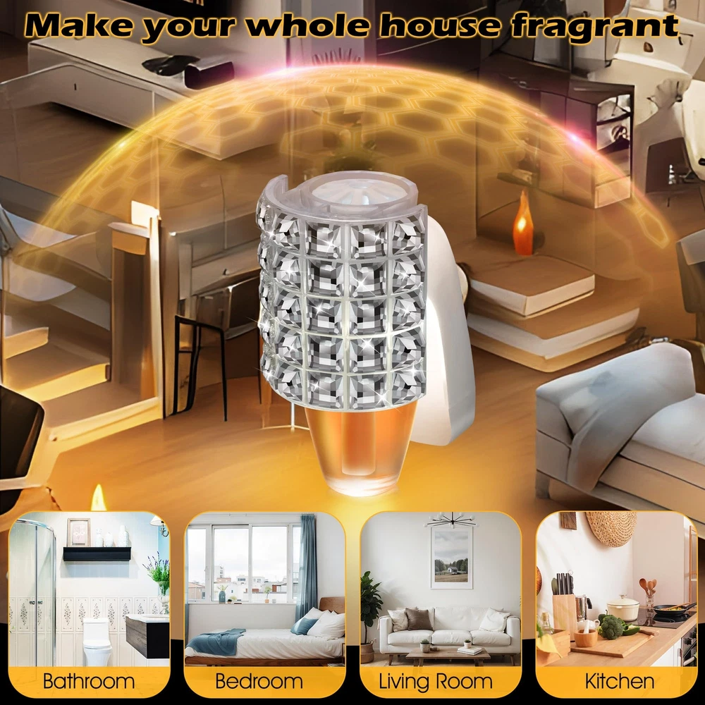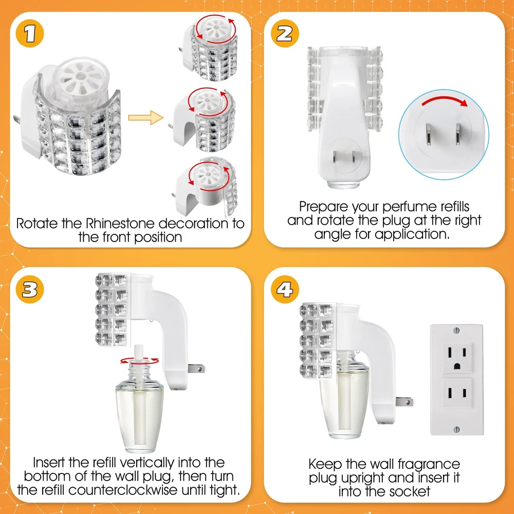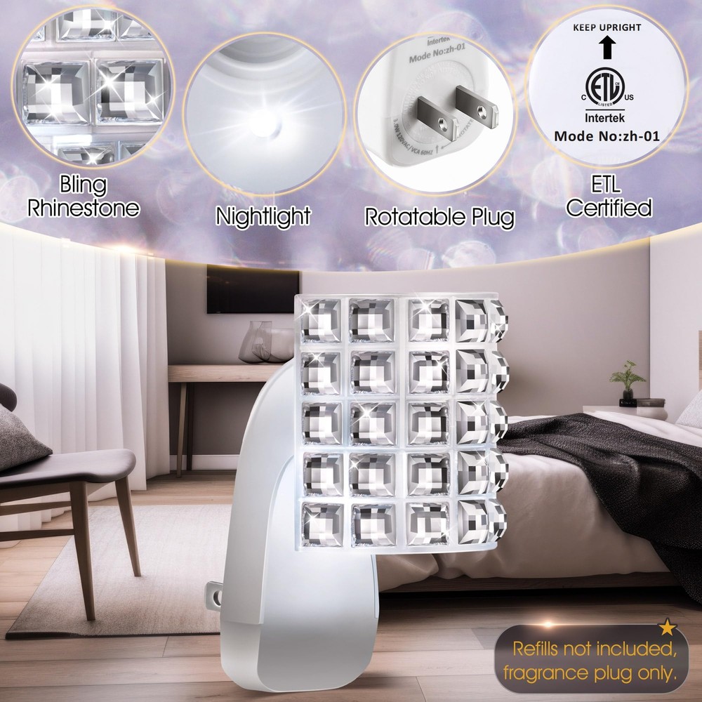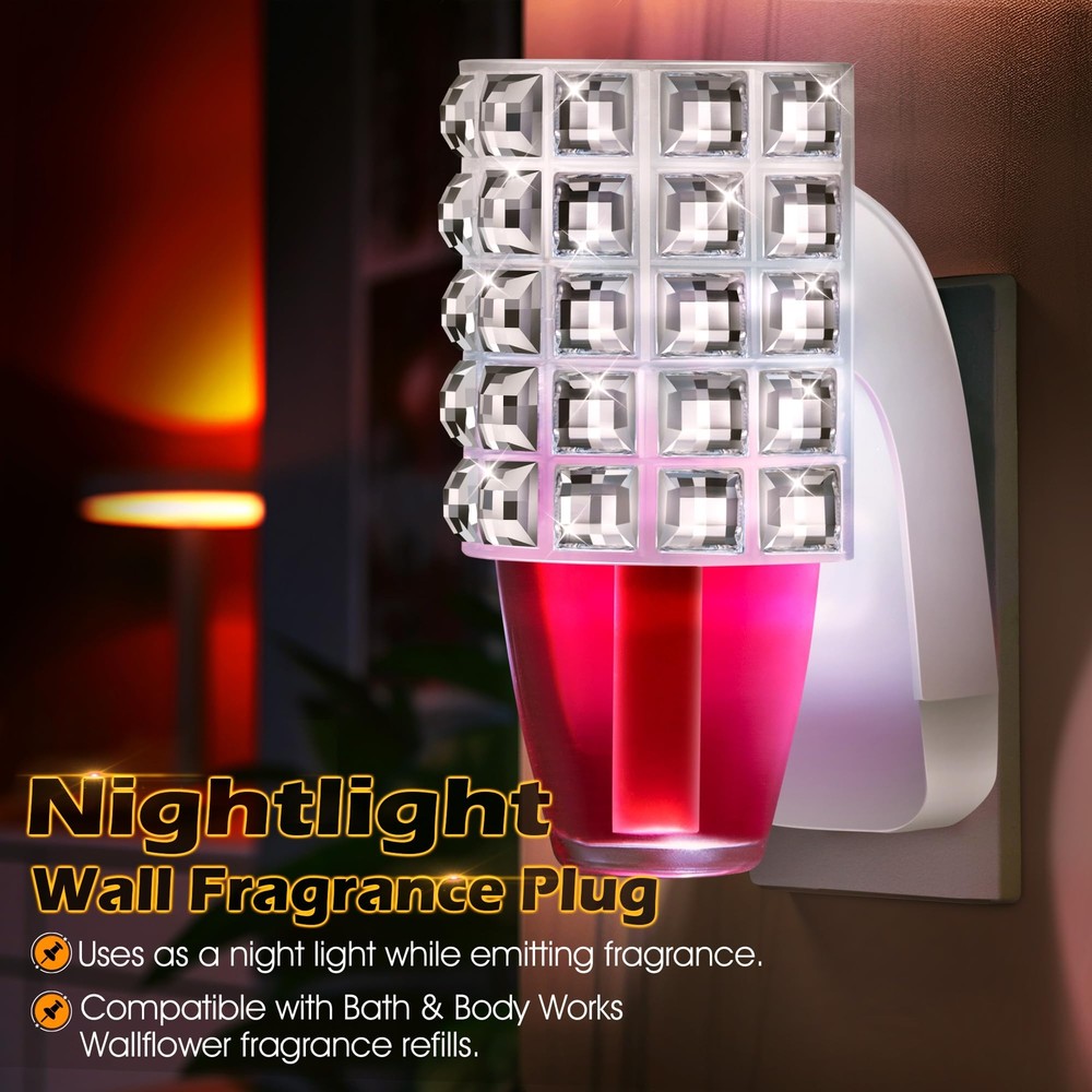 Wall Fragrance Plug In with Rhinestone Night Light (2 Pack) Specifications: Color: white Materials: plastic Shape: square rhinestone Features: This diffuser plug is with Bath & Body Works WallFlower fragrance refills. Not only does it give off an attractive scent, but it can also be applied as a night light. Decorated with square rhinestones, this fragrance plug is very beautiful and delicate. Safe and easy to use, just hold the plug in essential oil diffuser upright, attach the perfume bottle refill to the plug, then plug it in and enjoy the scent. Ideal for use in the home and office. Package includes: 2x Wall Fragrance Plug in Note: Refills not included, fragrance plug only. Easy to Plug In: this fragrance plug is with Bath & Body Works WallFlower fragrance refills, ensuring full compatibility so you can get the most out of your product's scent, creating a fresh and inviting atmosphere in your home Wall Fragrance Plug with Nightlight: decorated with beautiful square rhinestones, this plug in diffuser looks especially nice in bathrooms and bedrooms; It can also be applied as a night light, while emitting fragrance, allowing you to fall asleep with the fragrance, creating a pleasant and relaxing atmosphere and improving your sleep quality Always Keep It Upright: designed with a rotatable plug, it can be applied in both vertical and horizontal sockets with a quick twist of the rotating plug to ensure that the fragrance won't spill out Safe to Use: the rhinestone wall fragrance night light plug is ETL certified and meets strict safety standards, making it safer to use and ensuring your peace of mind during use; At the same time, this plug in diffuser operates efficiently at 3 watts, 120V and 60Hz, ensuring long lasting scent enjoyment while reducing energy consumption Wide Range of Uses: this wall fragrance plug works well for bedrooms, kitchens, living rooms, bathrooms, offices or anywhere else you want to be, easily removing odors and purifying the air so you can enjoy a constant fresh scent in your living space