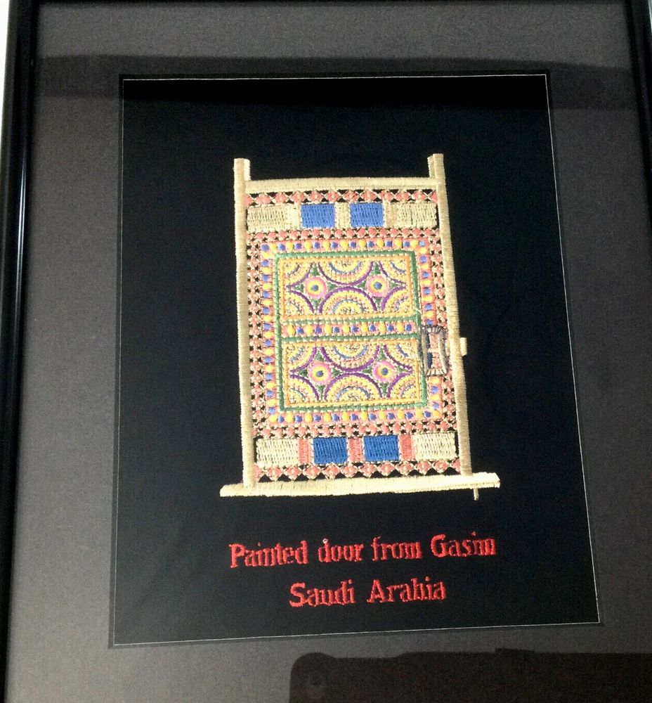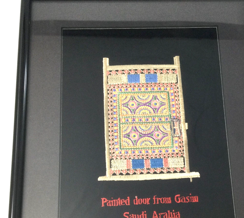 Wall Hanging Embroidered Picture Saudi Arabia Painted Door from Gasim Framed 9.5" x 8", outside measurements. Image measurements 6 3/4" x5". Very good condition, no damage. InvN/ES/5