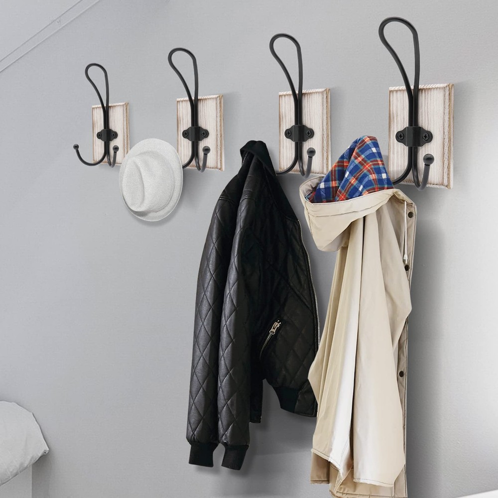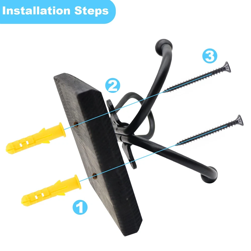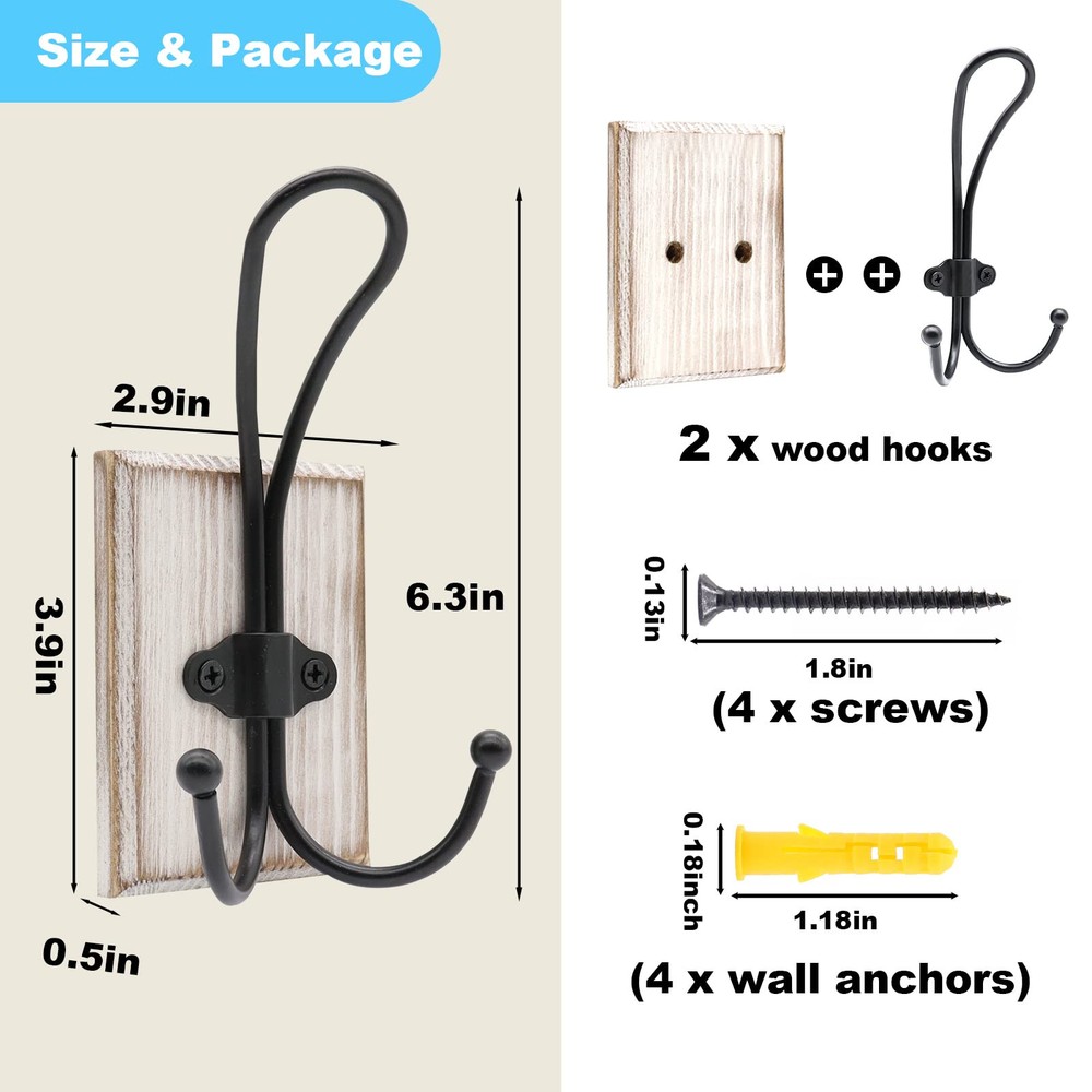 【Double Coat Hooks】Double big wall hooks design, can hang more clothes, such as coats, towels, robes, hats, winter clothes, jackets, scarves, wallets, belts, umbrellas, keys and so on. Our wall hanging hooks can save your space and keeps your home tidy 【Quality Material】Our big towel hooks for bathroom is made of carefully selected solid wood and heavy duty metal hooks, strong and durable. One towel robe hook can hold up to 50 pounds of weight 【Easy to Install】Wall mounted coat hooks. Just drill two holes on the wall, then fix the wood board and towel hooks on the wall with screws (For installation steps, please refer to the installation manual) 【Applicable Occasions】This coat towel wall rack can meet the decorative needs of different styles. Perfect decoration to install in the living room, bedroom, bathroom, hall, closet, kitchen, entryway, office, laundry room, etc 【Package included】2 pack of black metal robe hooks and wooden board, 4 screws, 4 wall anchors and 1 package box. (Note: Purely handcrafted wood blocks, each batch of wooden bases will vary slightly in color and texture)