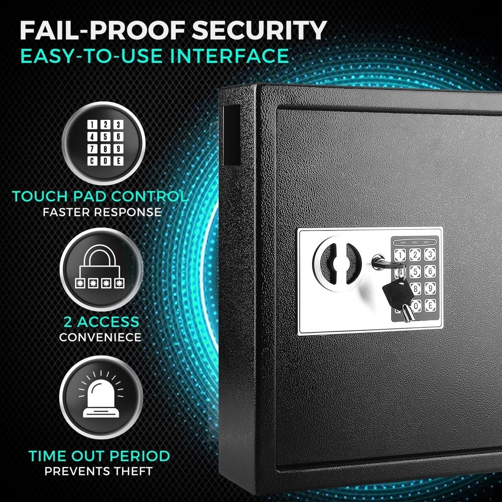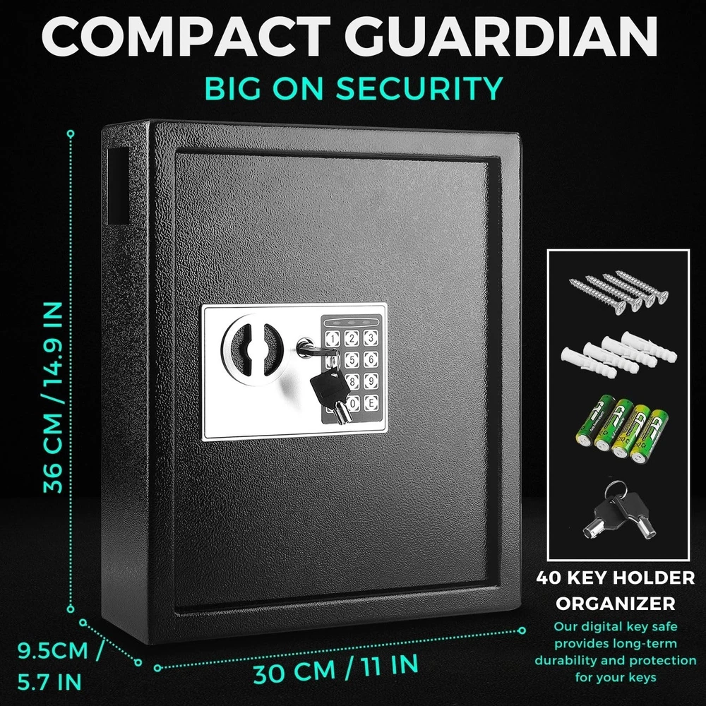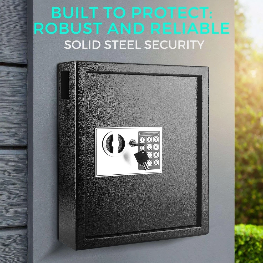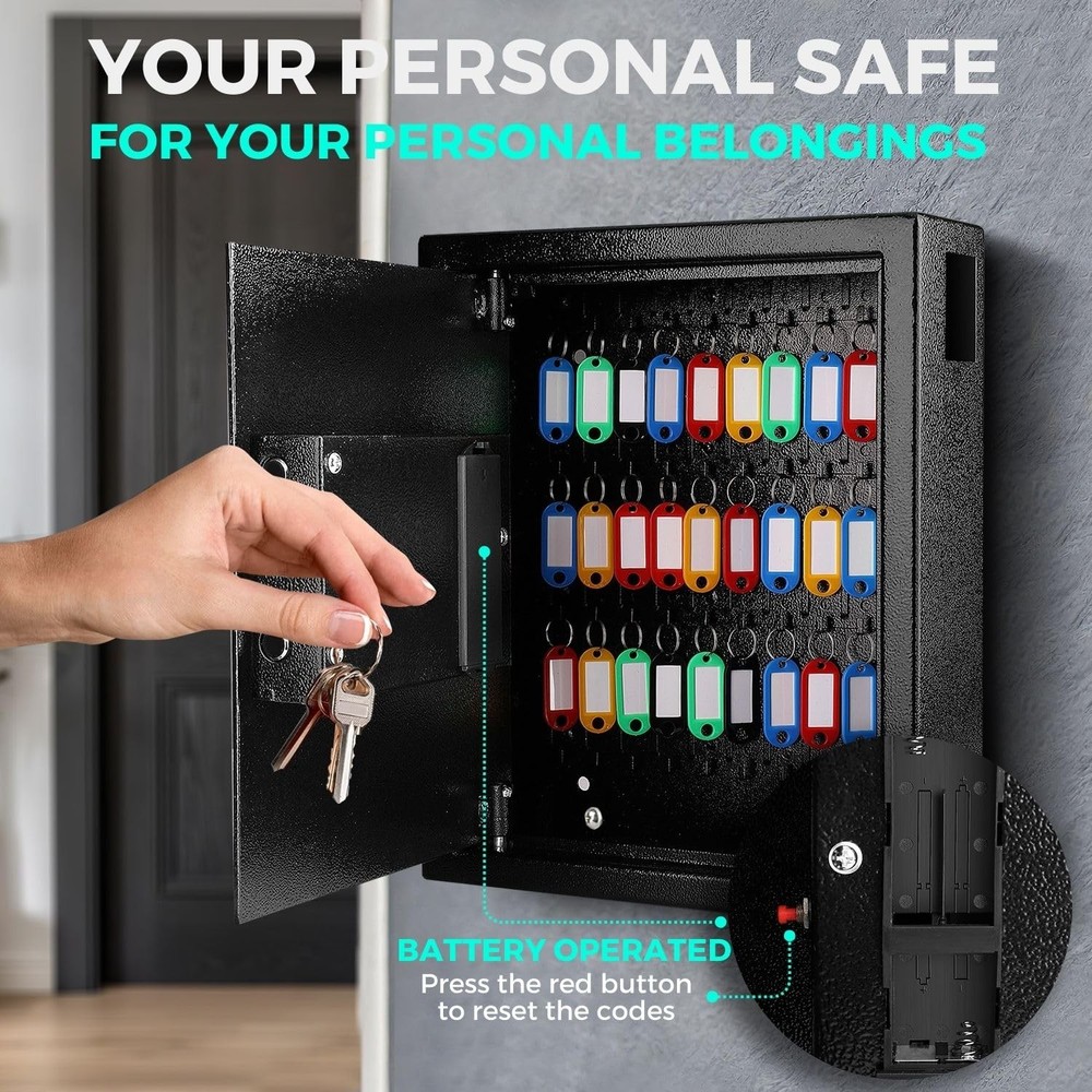 Constructed of 16 gauge steel and scratch-resistant powder coating - Our digital key safe provides long-term durability and protection for your keys. The continuous hinges keep the heavy-duty metal door in line with the cabinet, ensuring a smooth opening Key Cabinet With A Key Deposit Slot - Key drop slot on the side allows you to deposit the keys without opening the safe. Ideal for home, office, property management, real estate investors, rental car agencies, apartment complex, body shops, and much more Includes 40 Sets Of Color Coated Tags And Key Rings - Whether you���re a small business or a multi-national corporation with several worksites, a key box wall mount is designed to store all the keys in an organized key locker Features programmable electronic lock. The 3 to 8 digit secret pin code and the two override keys offer uncompromised security Wall-mounted Key Cabinet Design - Interior mounting holes and wall anchors provided for safe easy wall placement and setup; theft-resistant Locking Mechanism, Packing included screws and wall anchors for easy and stable installation onto the wall