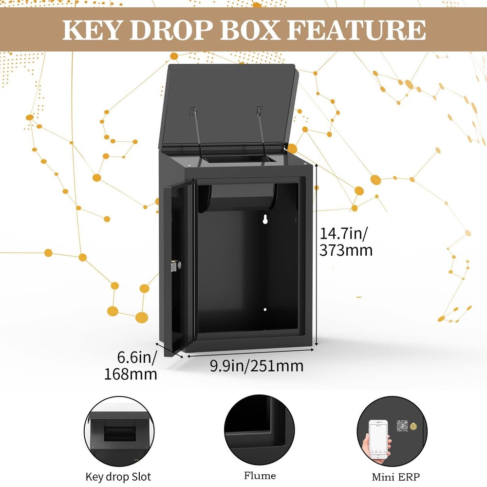 Well Made: The key drop box is 100% made of 0.6 mm cold rolled steel. When the lid is lifted, the circular roller underneath the drop slot will follow, and when the gap in the circular roller is exposed we can drop the key Waterproof Design: The key drop box door has a drain slot that allows it to be mounted on an unobstructed outdoor wall where water will not enter the box Wdie Scenarios: Ideal for after hours office, apartment complex, boat dealers, rental car agencies, car lots, body shops and more After-Sales Service: Please contact us by e-mail, the e-mail address in the APP--Account--about us to view