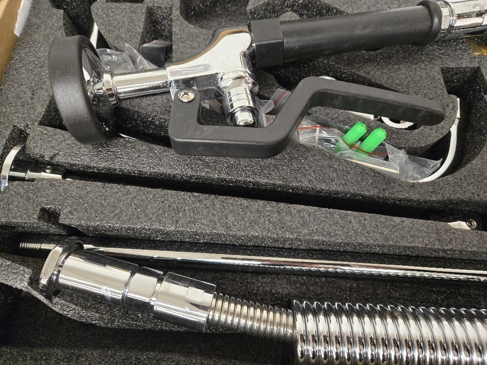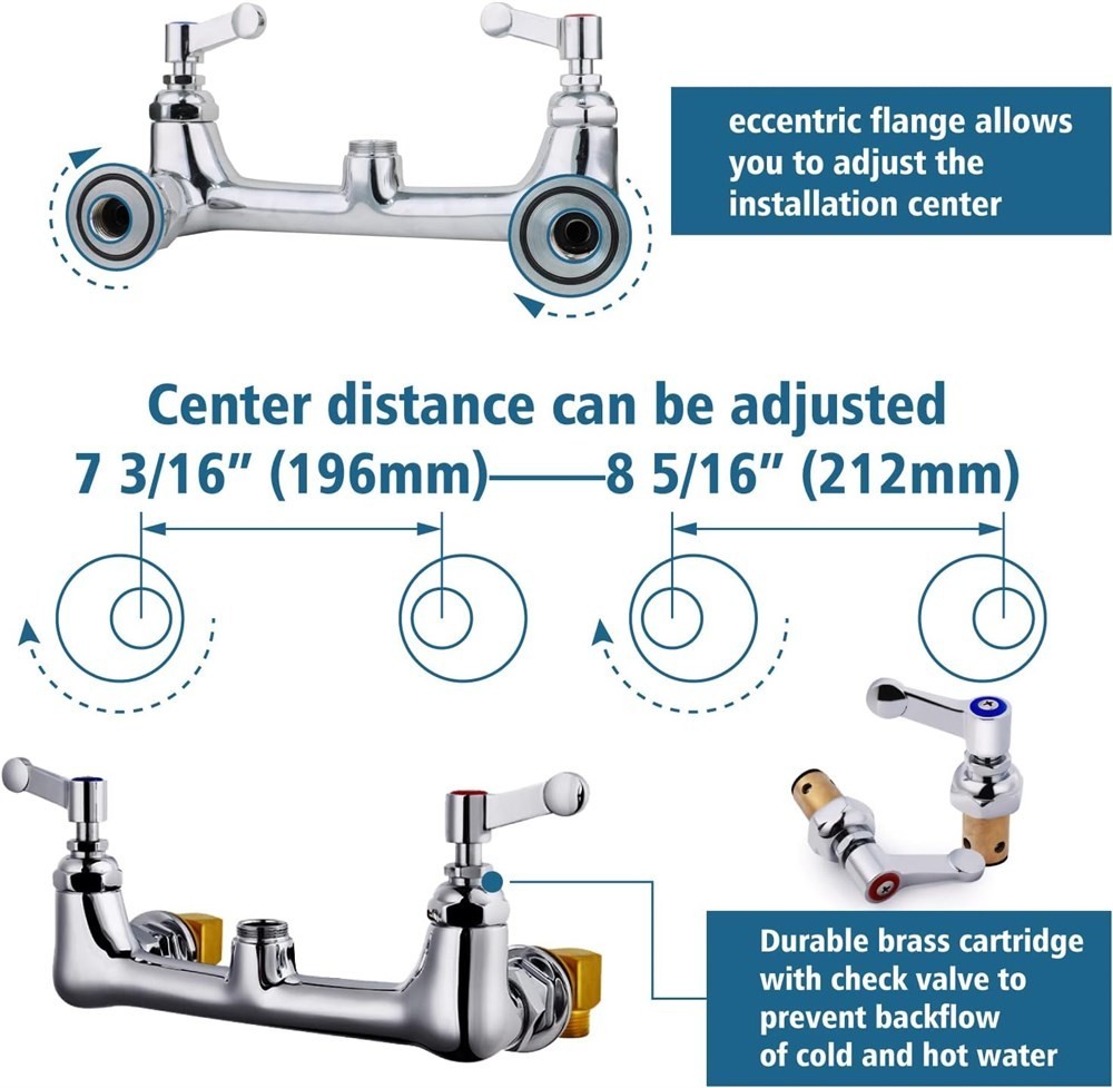 Has some water stains and some marks* 8 Inch center commercial faucet with pull down sprayer. This faucet features a 5-layers chrome plated casting brass construction that looks great in any setting and is easy to keep clean.It is the smart choice to install the faucet on a 2 or 3 utility compartment sink of your restaurant kitchen. Multi-functional commercial sink faucet with sprayer meets every need.