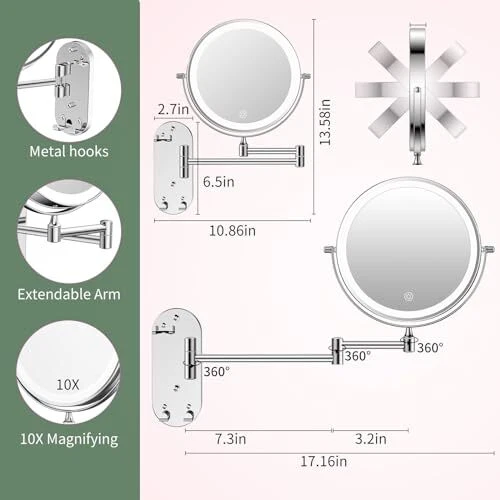 Menu 1. We require immediate payment. 2. We currently accept payment via eBay managed payments only. 3. Once payment is cleared, we will dispatch your shipment within 1-3 business days. Please refer to the "Shipping" tab for more information regarding shipping speed to your destination. Wall Mounted Lighted Makeup Mirror, Rechargeable 8" Double-Sided LED Make up Mirror 1X/10X Magnification, 3 Color Lights Dimmable 360° Rotation Wall Mount Mirror with Extension Arm and Hooks Product description ⭐【Upgraded Wall Mounted Makeup Mirror with Hooks Design】This wall mount makeup mirror has an upgraded multifunctional hook on the base, ideal for hanging towels, razors, shower sponges, and other lightweight bathroom items, ???????? ???????????, ????????? ???????? ????????, ??? ????? ?????.The makeup mirror's frame, column, and base are crafted from expensive pearl nickel and feature a multi-layer electroplating and polishing process, providing durability, moisture resistance, and rust resistance, This ensures suitability for use in bathroom environments. ?【Rechargeable Makeup Mirror with Lights】This makeup mirror features a built-in 2000mAh lithium battery and Type-C charging port for quick recharging. Once fully charged, it provides up to 8 days of usage (30 minutes per day). When the battery is low, you can use the included Type-C charging cable and plug for continuous use. This mirror eliminates the hassle of constantly replacing batteries and offers both wired and wireless power options.( Accessories:A Typr C chrging cable is included, charger not included ) ?【1X/10X Double-Sided Mirror with Magnification】1X/10X can provide the most suitable makeup experience. 10X magnifying makeup mirror can clearly focus on details when applying eyeliner, mascara, grooming eyebrows, or lipstick, making it ideal for creating a flawless and intricate makeup look. Maintain the optimal viewing distance of 4 inches, with a 10X magnification ensuring maximum clarity, providing an ideal solution for precise, intricate makeup application. Enjoy high-definition quality, with no pixel loss and distortion-free zoom. ?【3 Color Lighting & Dimmable wall mounted mirror】This wall mounted vanity mirror provides 3 color lighting options (Cool, Natural, Warm) to simulate makeup for different occasions. White light is used for daily office or home makeup, warm light is used for party or club makeup, and natural light is used for dating or outdoor makeup. A short press on the sensor switch changes the light color, and a long press adjusts the brightness from 0 to 2000Lux, 30% brighter than others, to meet your needs in various environments. ?【360° Swivel Extendable Mirror & Easy to Install】This vanity mirror with lights features a 360° rotation and a foldable arm design, providing a comfortable viewing angle for makeup application, shaving, or wearing contact lenses. The wall mounted mirror can be folded against the wall to save space when not in use. Is very easy to install. You can find all installation information in the pictures or in our packaging. ?【Widely Use & Ideal Gift Choice】This bathroom magnifying mirror can be used in a variety of environments such as bedrooms, bathrooms, hotels, spas and beauty, also be the perfect gift for your family, friends or sisters on birthdays, Christmas, Halloween, Thanksgiving, Mother's Day and Valentine's Day. has a strict quality control system, and we are confident that we offer a 24-month replacement . If any questions about the this wall-mounted cosmetic mirror, please feel free to contact us and we will reply you within 12 hours! PLEASE MESSAGE US IF YOU HAVE ANY OTHER QUESTIONS, AND MANY THANKS FOR READING ALL OF THIS. Copyright ©#. All Rights Reserved.