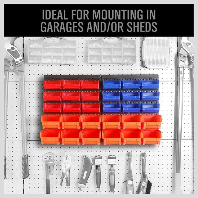 Features: Labelling Spot sticker or marker pen, Keep work area neat and tidy Structural Stability Heavy duty storage material,Upgraded mounting slot design for extra stability Ultra Durable Peg Board They are manufactured from high-quality base materials. 100% Brand new, The color is bright, completely different from the inferior product Great for the handyman.Ideal for mounting in garages and/or sheds.With removable. Bins which are conveniently and easily accessible Including: 9 small red bins(cm): 9.7 X 9.2 X 5 9 small blue bins(cm): 9.7 X 9.2 X 5 12 large orange bins(cm): 10.1 X 16.3 X 7 Overall Dimensions(cm): 64 X 38 X 18.5 Wall Mounted Storage Bins Small Parts Organizer Garage Tool Rack 30 Bins Features: Labelling Spot sticker or marker pen, Keep work area neat and tidy Structural Stability Heavy duty storage material,Upgraded mounting slot design for extra stability Ultra Durable Peg Board They are manufactured from high-quality base materials. 100% Brand new, The color is bright, completely different from the inferior product Great for the handyman.Ideal for mounting in garages and/or sheds.With removable. Bins which are conveniently and easily accessible Including: 9 small red bins(cm): 9.7 X 9.2 X 5 9 small blue bins(cm): 9.7 X 9.2 X 5 12 large orange bins(cm): 10.1 X 16.3 X 7 Overall Dimensions(cm): 64 X 38 X 18.5 Payment Shipping Return Contact us About us Payment 1.Paypal, Credit Card, G Pay etc, many payment way is accepted. 2.Please be sure your shipping address is correct before make a payment. Shipping 1.We are shipping from multiple warehouses (Houston, Texas/ Corona, California) , please note before placing an order 2.We will ship out the item within 1-3 business days after comfirming the payment, appreciate your patience. 3.If the items are broken on the way( we will check the orders clearly before we sent them ),please contact us in 3 days you received it. We will send you a new one or refund your payment. Return 1.We stand behind every buyer.Items can be returned for exchange or refund within 30 days. 2.Please contact us when you have any confusion of our item, we will solve the trouble for you as soon as possible. Contact us 1.This is professional Seller.We will reply your message within 24 hours. 2.Please contact us whenever you have any question about the item. We will deal with it as soon as possible. 3. If you are unhappy with the item or our service,please Contact Us before leave feedback,just give me a chance,thank you! About us 1. Unless specified otherwise, all our products are IN STOCK and are shipped from Local warehouse - Not Overseas! 2. We provide a 30 day Satisfaction Guarantee or your money back (provided items are in the same new and resaleable condition.) 3. We have a PayPal Verified Business Account, please buy with Confidence! 4. Every item will be tesrted before send.We know our products well and if we don't have the answers we will do our best to find them for you! 5. Our friendly team look forward to serving you! Your satisfaction is our No.1 Priority We will do our best to satisfacy you.