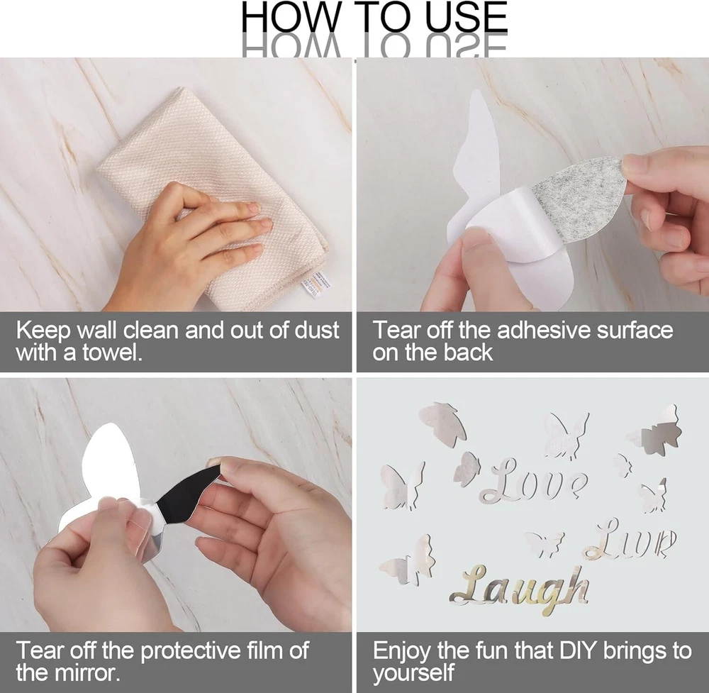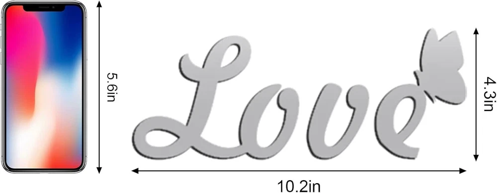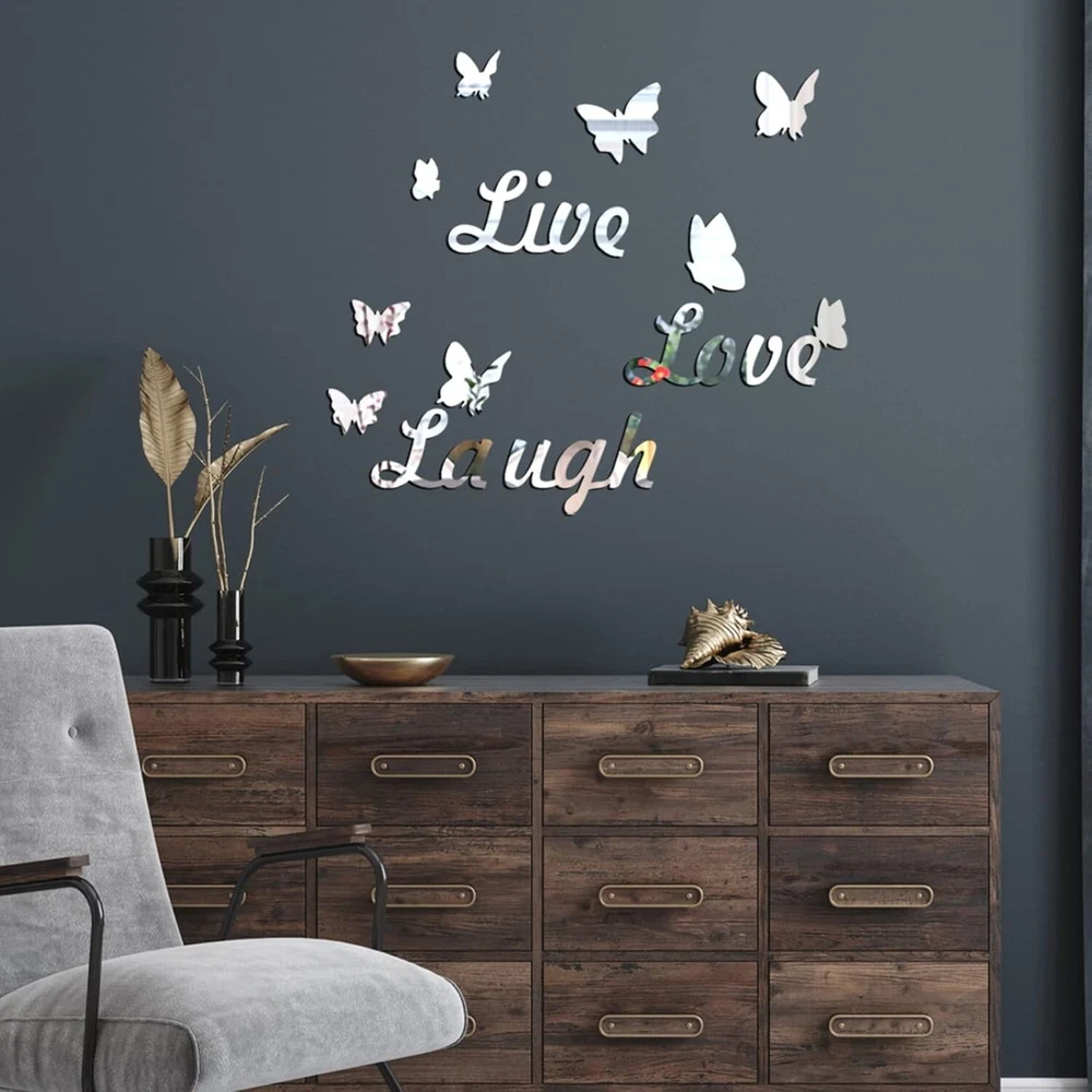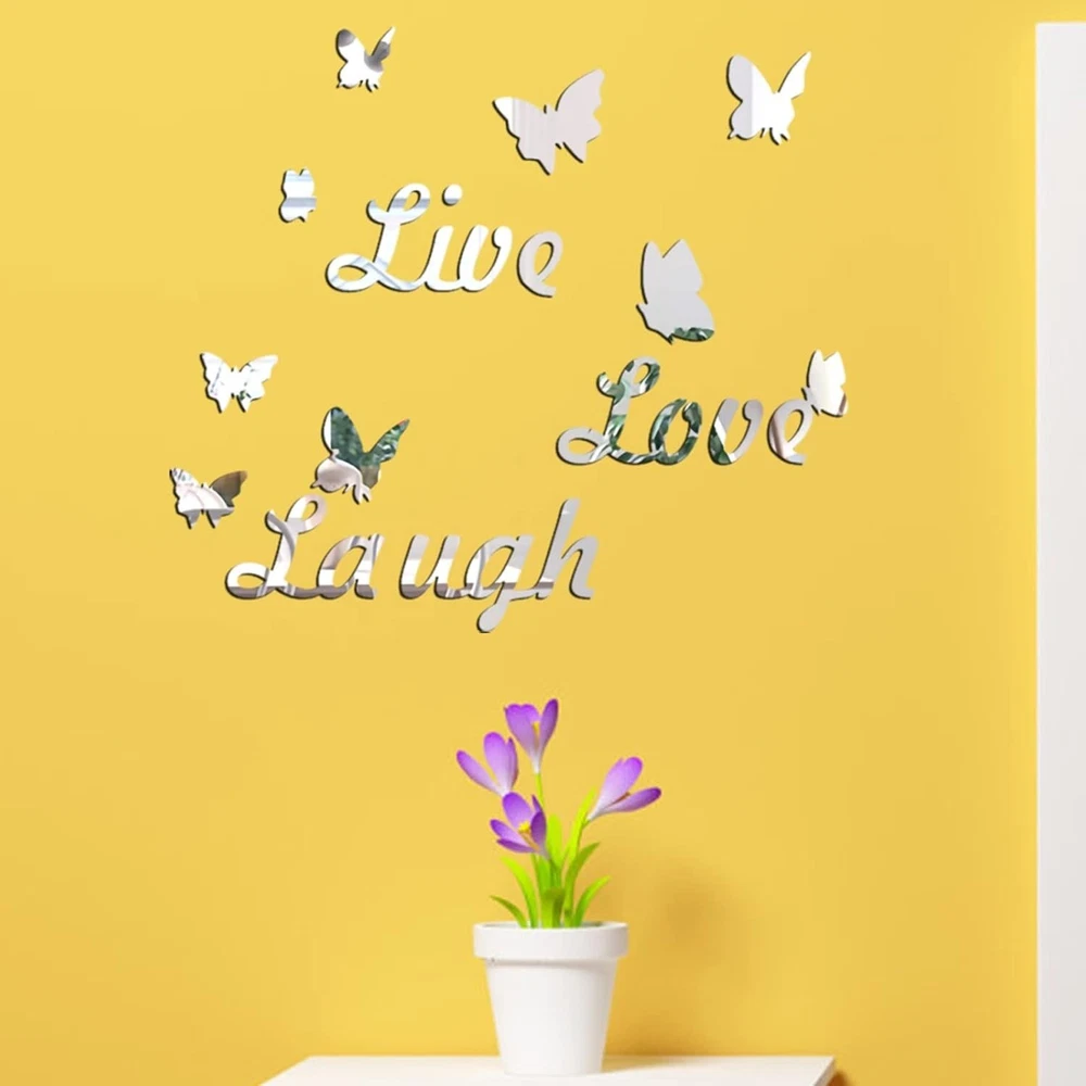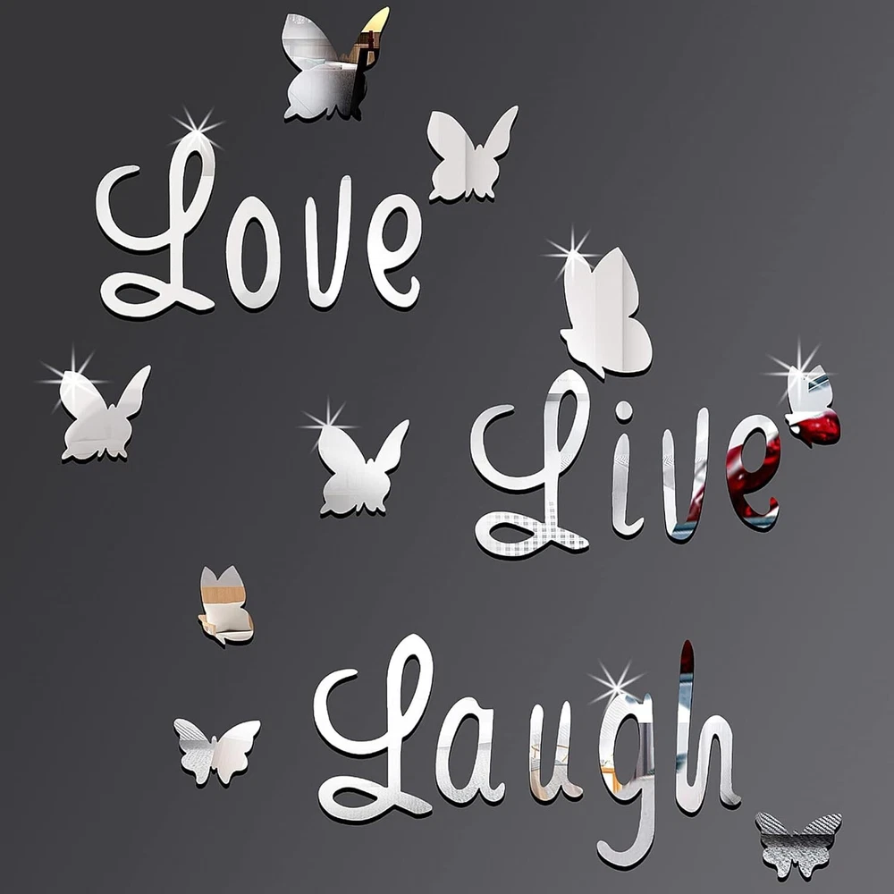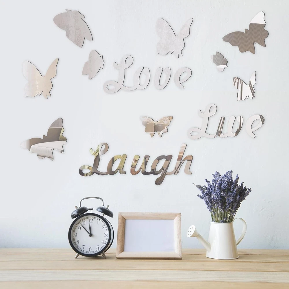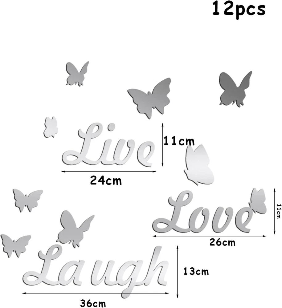 Product Description About this item √ 【Durable Material】- Live Love Laugh letters and Butterfly shaped mirror wall stickers use high-quality acrylic mirror materials, environmentally friendly, durable, easy to clean, crystal texture, clear images. The back of sticker has glue and the surface has a protective film on it. It is easy to paste and easily removable without damaging wall. √ 【Live Love Laugh Design】- Modern art mirror decorative wall stickers make your home brighter, circular patterns and home letters add warmth, affection and love atmosphere. √ 【Wide Range of Uses】- please stick the sticker on a smooth and flat wall without leaving a gap to prevent it from falling off. Suitable for TV background wall, living room, bedroom, children's playroom, dining room, etc. It is a great decoration for any special occasions such as weddings, birthdays, anniversaries, engagements, graduations, etc. √ 【Creative DIY Gift 】- The set contains the word HOME LOVE and 18 round mirror stickers. You can DIY these acrylic mirror wall stickers in different ways according to your own preferences. Let the warm atmosphere surround your family. Can be used as housewarming or anniversary gifts, can also be used to decorate birthday parties and weddings. DIY mirror butterfly stickers silver love live laugh butterfly wall letters butterfly 3d mirror wall stickers home decoration decal DIY stickers: There are 23 pieces stickers in total, each sticker is divided, so people can make random arrangement according to their needs, without much spatial and furniture requirement. Self-adhesive: 3D mirror decals are easily pasted on even walls, there is no need for other tools while in pasting, because they are in self-adhesive design, convenient for people to use. Decorative function: The combination of silver butterflies and words decals can greatly attract people's attention and make your room look different, stickers suit to smooth and clean places like living room, playroom, dining room, kitchen, office, hallway, classroom and other places. Specification: Material: plastic Color: silver Quantity: 23 pieces (letter "i" contains 2 pieces) Size: as shown in picture Package includes: 9 x Mirror butterfly 14 x Mirror letter Warm notice: Due to manual measurement, there might have slight differences on size. The protective film on the mirror surface is to prevent the mirror from being scratched, if you want stickers have a good look, please peel films off after sticker being pasted. The words painted on the product are not as trademarks, our trademark is Outus.