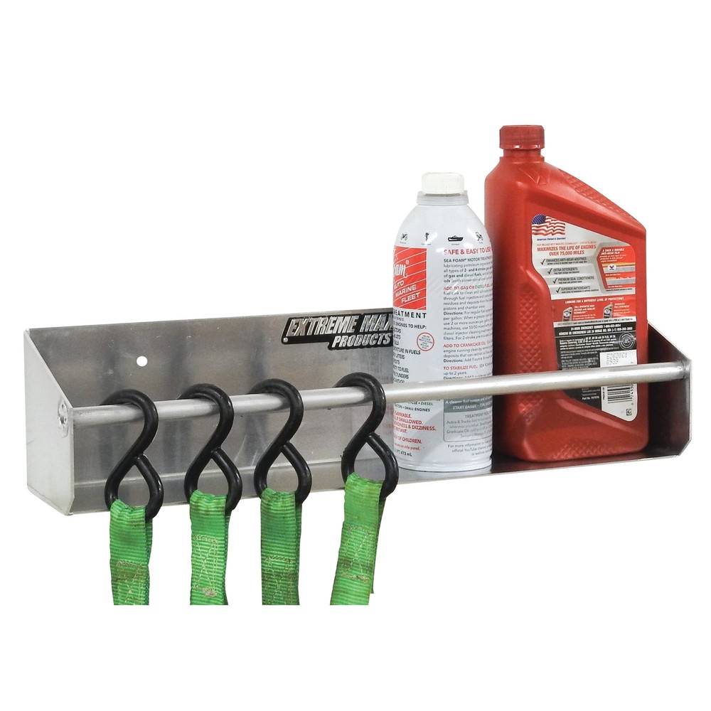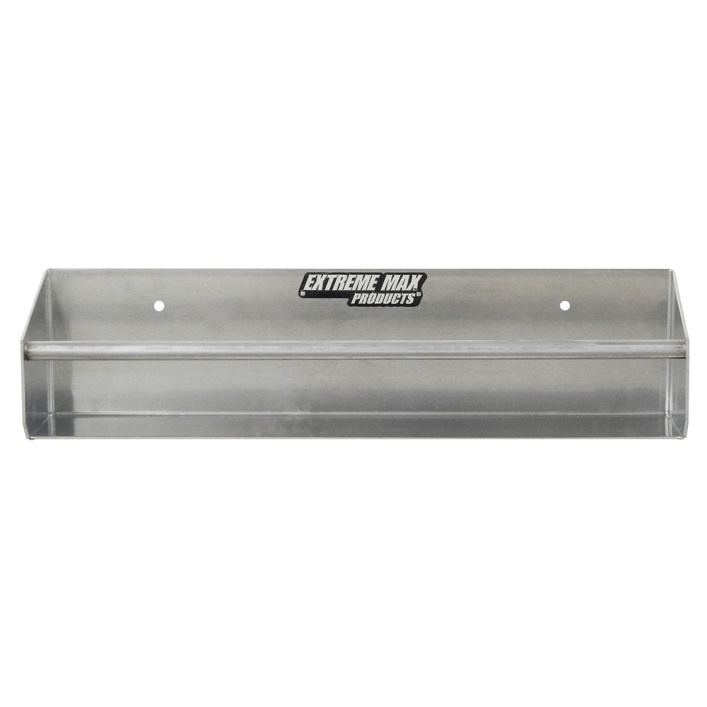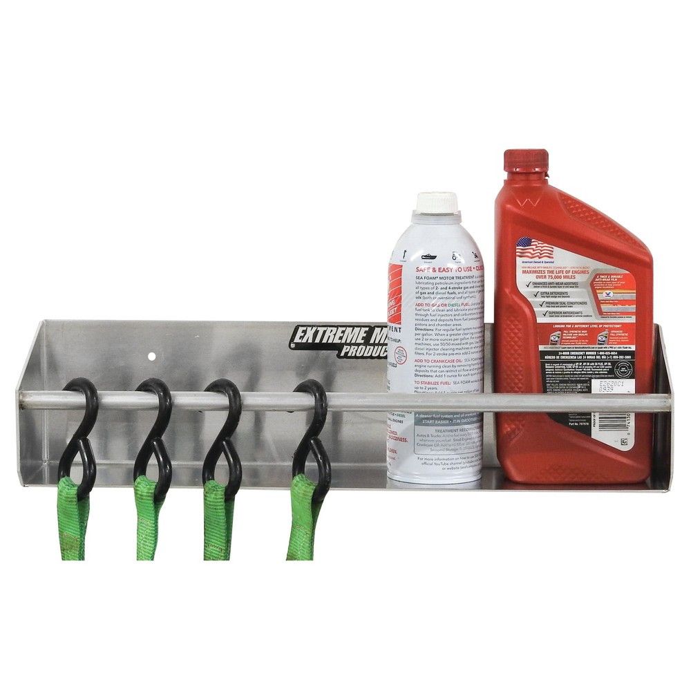 About this item Keeps your garage or enclosed trailer organized by providing a handy storage shelf and hanger Sidewalls and hanging rail hold items in place, even during travel Shelf is perfectly sized for storing aerosol cans, quart-sized liquid jugs, and more Use the hanger bar for keeping tie down straps neat, or hanging other items, such as clothing Heavy-duty aluminum construction with a clean, attractive finish