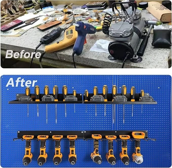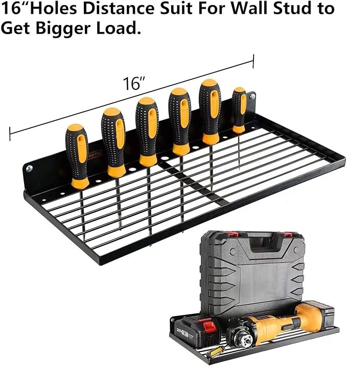 Organize Power Tools: This organizer holds power tools and drill accessories on the wall for easy access and organization. Solid Metal Construction: Made from heavy duty metal with a black finish for durability and style. Wall Mounted Design: Comes with a wall mount bracket for quick and easy installation. Multi-Tier Storage: Features two shelves and two tool racks for flexible storage options. Weight Capacity: Holds up to 50 pounds of tools and accessories for heavy-duty use.