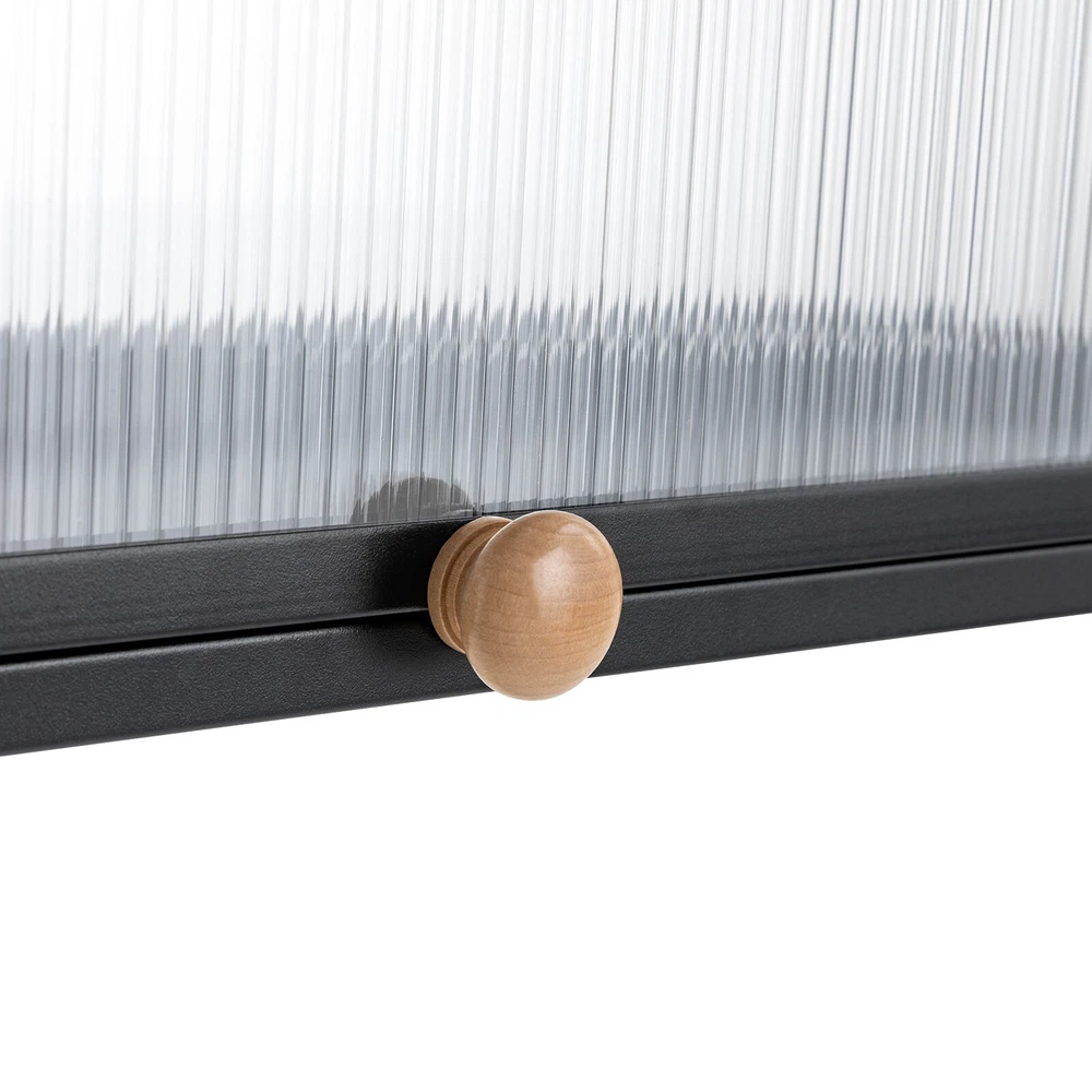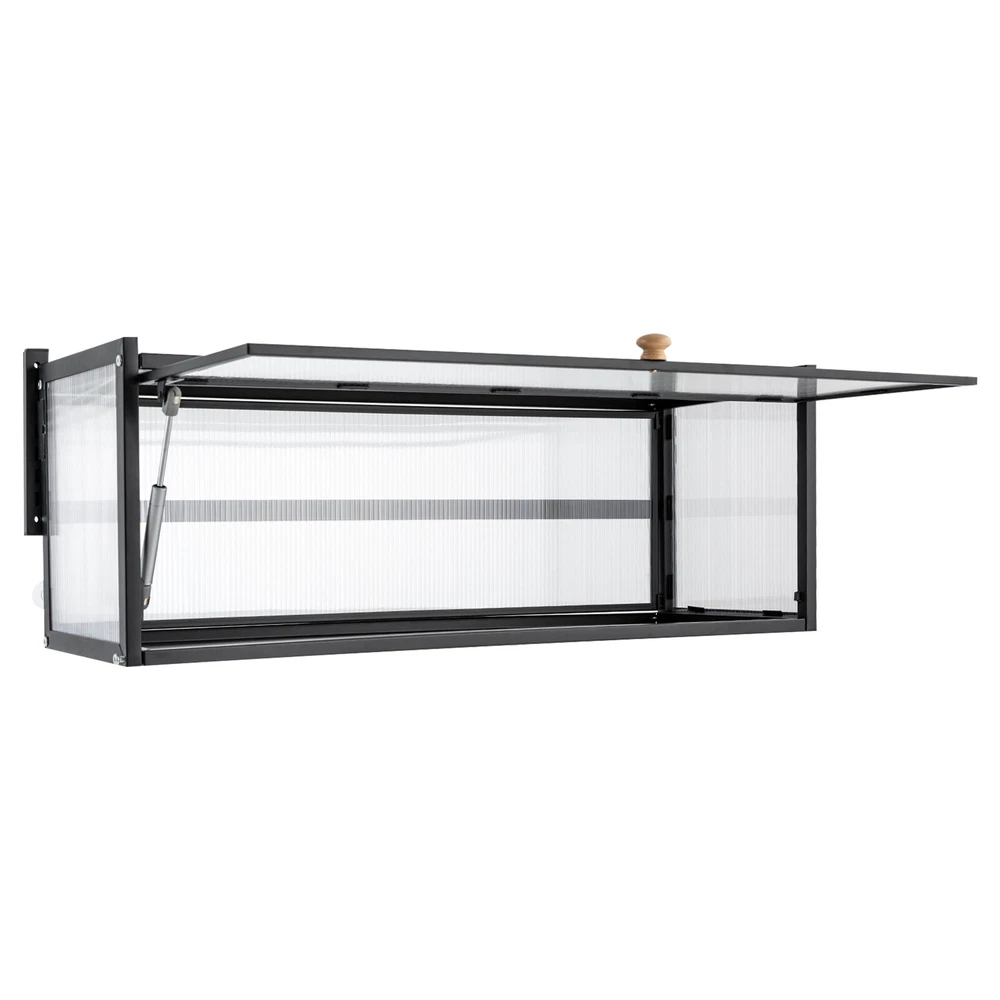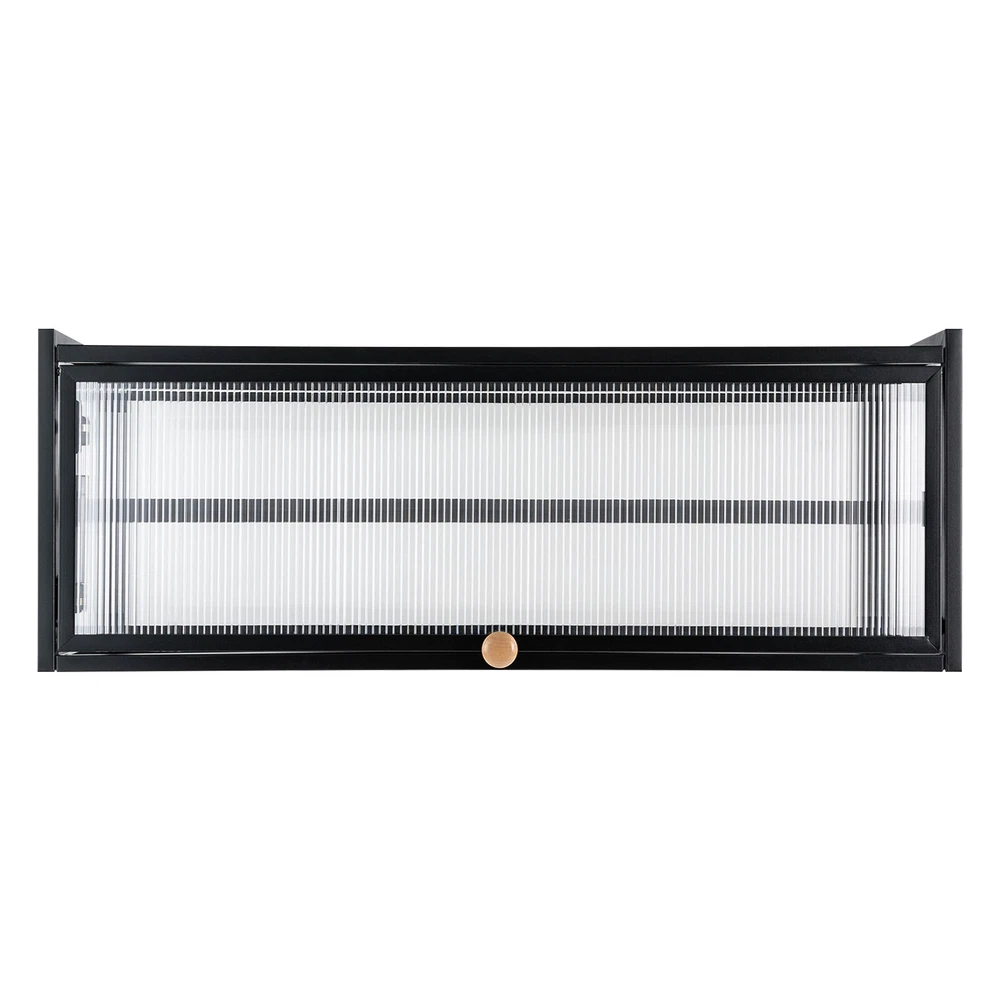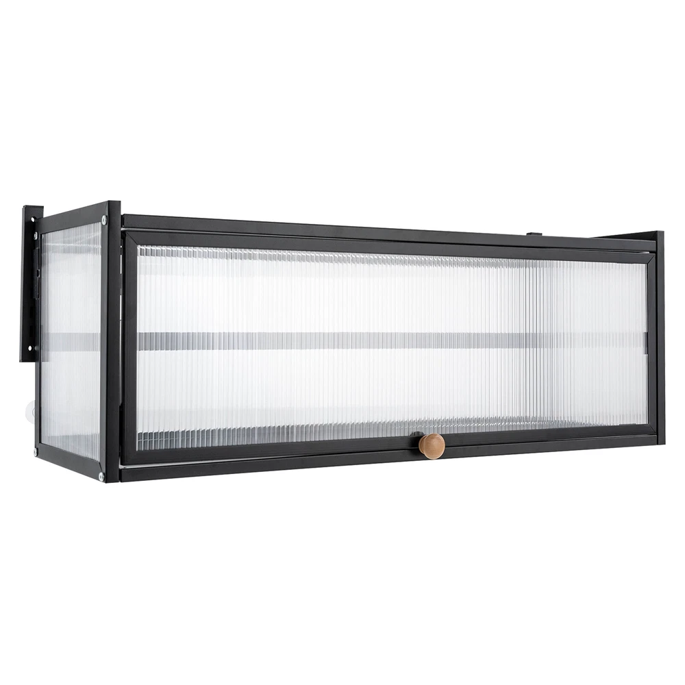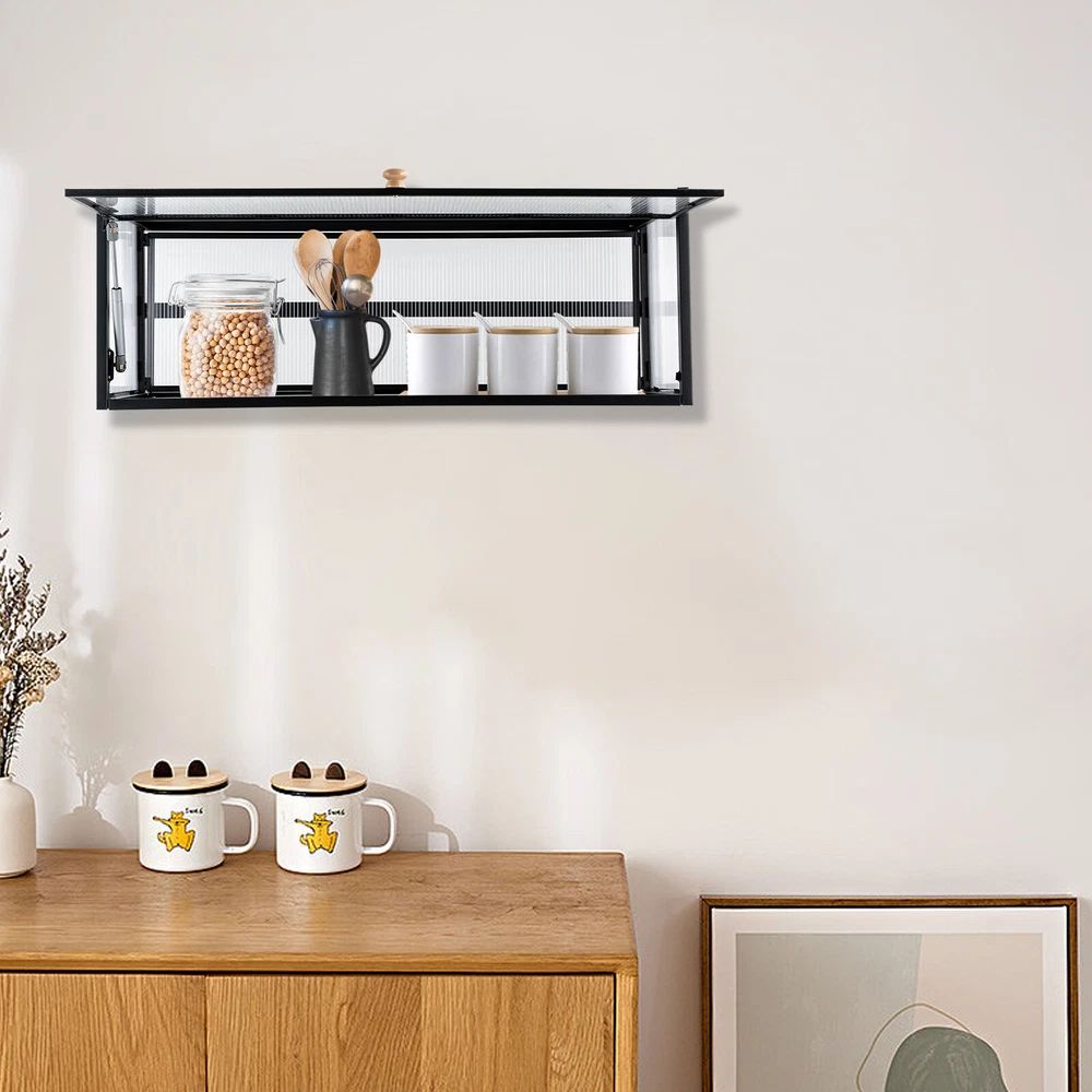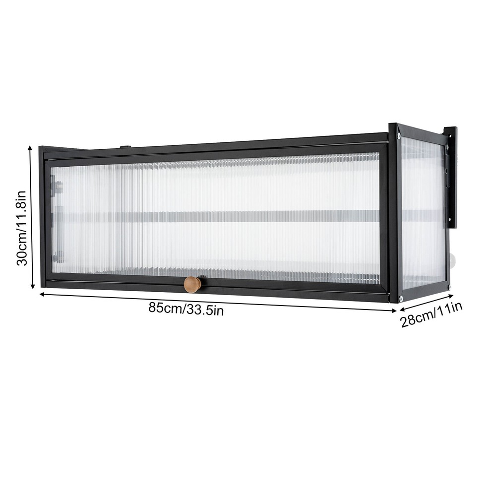 Key Features High-quality Selection: The high-quality carbon steel and polycarbonate hollow panels, combined with coating technology, make this product resistant to rust and scratches, suitable for long-term use. Wall-mount Design : The wall cabinet can make full use of wall space, especially suitable for small rooms and can be integrated with various occasions. You can install it at a suitable height for quick access to your items. Worry-free Installation : The equipped suction cups, auxiliary stickers, detailed Chinese& English instructions, and glues, ensure a stable installation without damaging the wall. Flip-up Design : The hydraulic support rod allows the opening and closing angle to reach 90 °, making it easier to take items, achieving silent closing and reducing the risk of hitting heads. Maximize Your Storage : Large capacity allows easy storage of kitchen spices, and the flat top can also be used to store items to save space. High Load-bearing Capacity: This cabinet not only looks good but also has a big load-bearing capacity of about 55lbs, so you can place items as you like without worrying about them collapsing. Beautiful Appearance: The unique textured cabinet door plus the wooden handle demonstrate a unique texture. Meanwhile, the semi-transparent visual effect presents a hazy aesthetic of storage. Easy to Clean : The cabinet door can play a dustproof and antifouling role while the smooth surface of the product also enables easy and fast cleaning, and you only need to wipe away the stains with a towel. Specification Material: Carbon Steel, Polycarbonate Hollow Sheet, Wood Surface Treatment: Painting Color: Black, Translucent Special Feature: Flip-up Load Capacity: 25kg/55lbs Product Size: 85*28*30cm/33.5*11*11.8in Details Solid Back Plate : Enlarged and thickened back plate provides stronger support, so you can use this item with peace of mind. Rounded Edges : The edges of this product have been polished smooth to avoid damage caused by bumping, making it safe and comfortable. Application This wall cabinet is an all-around item and is suitable for the kitchen, living room, office, etc. Package Included 1x Wall-mounted Cabinet 1x Chinese&English Installation Diagram All Accessories for Assembly Notes: For firmness and safety, hollow walls, gypsum walls, and other walls that cannot withstand gravity cannot be installed with the wall cabinet. Please allow the slight color difference caused by the shooting light and the 1-3 cm error due to manual measurement, and make sure you do not mind before ordering.