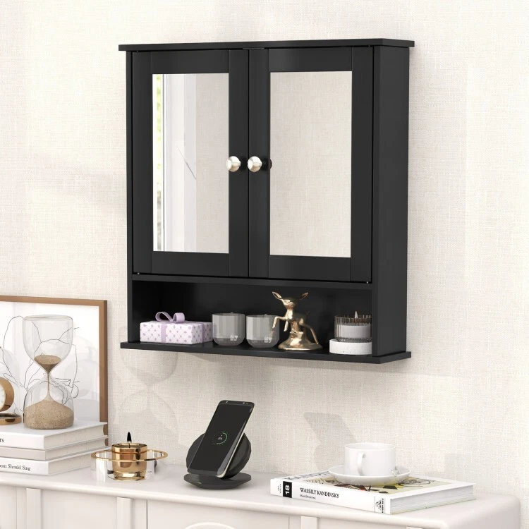 Double Door Wall-Mounted Medicine Cabinet Bathroom Organizer w/Adjustable Shelf ● Adjustable Large Storage Space: Layered design allows you to organize your items and keeps your room clean and tidy. The interior comes with a height adjustable shelf to fit larger items as needed. The lower shelf provides an open space for easier access to items. ● Double Doors with Mirrors: This cabinet comes with 2 doors which adopt magnetic door catch, keeping the door closed tightly and safely when not in use. High-definition mirrors on both doors offer convenience for your daily makeup or shaving. ● Durable and Sturdy Cabinet: Made of environmental-friendly MDF, our wall cabinet has solid texture and not easy to crack and deform even in a damp room. It can be firmly fixed on the wall and has large load bearing capacity, which is enough for your daily need to place items. ● Stylish Design and Multiple Use: Simple and stylish appearance integrates into your home decoration perfectly and not stand out. This wall cabinet is suitable for multiple places, such as bathroom, bedroom, corridor and so on, to create additional storage space. ● Easy to Assemble and Clean: Every panel and small part is numbered for easy distinction. With detailed instruction, assembly is quick and effortless. Since the surface is smooth and waterproof, it's easy to maintain cleaning only by gentle wiping with a damp cloth. Overview -Large open shelf and inner space to store your various daily items -Adjustable shelf with 3 heights to meet different storage needs -Comes with a mirror on both doors for your everyday makeup -Wall mounted design saves floor space and ensure the versatility -High quality MDF ensures strong stability and long-lasting use -Exquisite and humanized knob allows you to easily open the door -Magnetic door holder help close the door with low noise and tightly -Elegant and simple appearance fits well with any home decor -Ideal for various places, like bathroom, living room, entryway, etc Color (as Picture Show) Material MDF, Galss Product dimension 22" x 5" x 23"(L x W x H) Weight capacity of each shelf 11 lbs Net weight 15 lbs