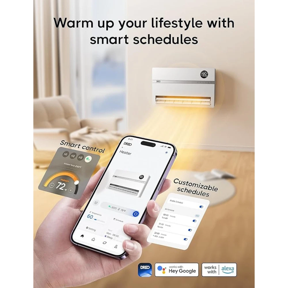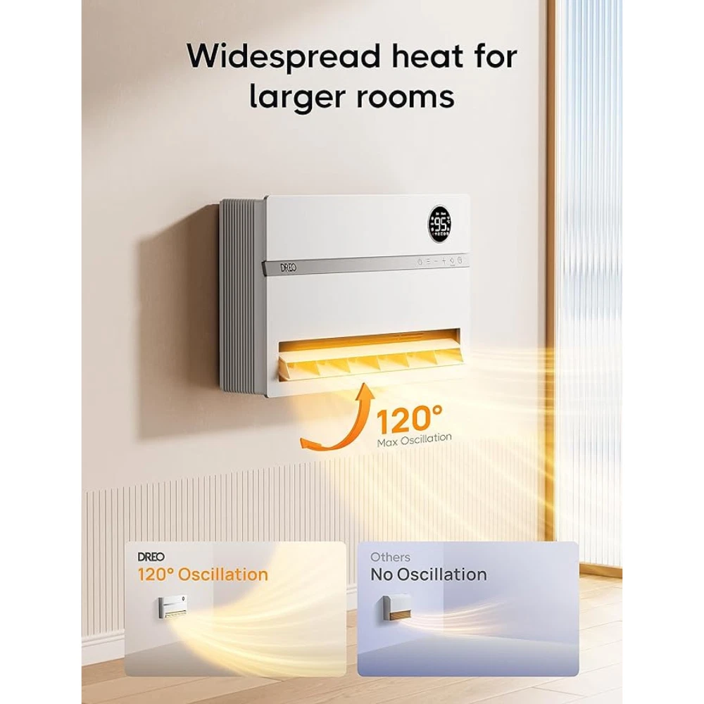 {Title} {Storehook1} Dreo Smart Wall Heater, Electric Space Heater for Bedroom 1500W, 120° Vertical Oscillation, Item Description The Dreo Smart Wall Heater (Model WH719S) is an innovative and energy-efficient electric space heater designed to provide optimal warmth and comfort in your home. With a 1500W heating capacity and 120° vertical oscillation, this wall-mounted heater ensures that warm air is evenly distributed across your room, reaching every corner more efficiently than traditional space heaters. It is perfect for rooms up to 215 sq. ft., making it ideal for bedrooms, living rooms, home offices, and more. This smart heater is equipped with advanced features to enhance your experience. You can control the temperature with incredible accuracy, choosing from a range of 41°F to 95°F, with a 1°F precision. It uses PTC ceramic heating technology, which provides fast, steady heat for exceptional comfort. The integrated adjustable thermostat helps maintain your desired temperature without the need for constant manual adjustments. The Dreo Smart Wall Heater is designed for convenience and ease of use. You can manage the heater remotely through the Dreo app or with voice commands via Alexa or Google Home, allowing you to adjust settings from anywhere in the house. The 24-hour timer and customizable scheduling options make it easy to align the heater's operation with your daily routine. For a more restful sleep, this heater has a low-noise operation and automatically adjusts the brightness of its LED display to minimize disruption during the night. Installation is hassle-free, as the package includes a drilling guide and all the necessary accessories. The unit also features a reusable filter and detachable design, making maintenance easy. Whether you're seeking a primary or supplementary heat source, the Dreo Smart Wall Heater offers a reliable, efficient, and smart solution to keep your indoor spaces warm and comfortable. Payment ALL METHODS ACCEPTED BY EBAY Shipping within 6 days of payment maximum usually we ship and deliver within 3 days. Return 30 day return policy Feedback Copyright , {storeHook1} | All rights reserved.