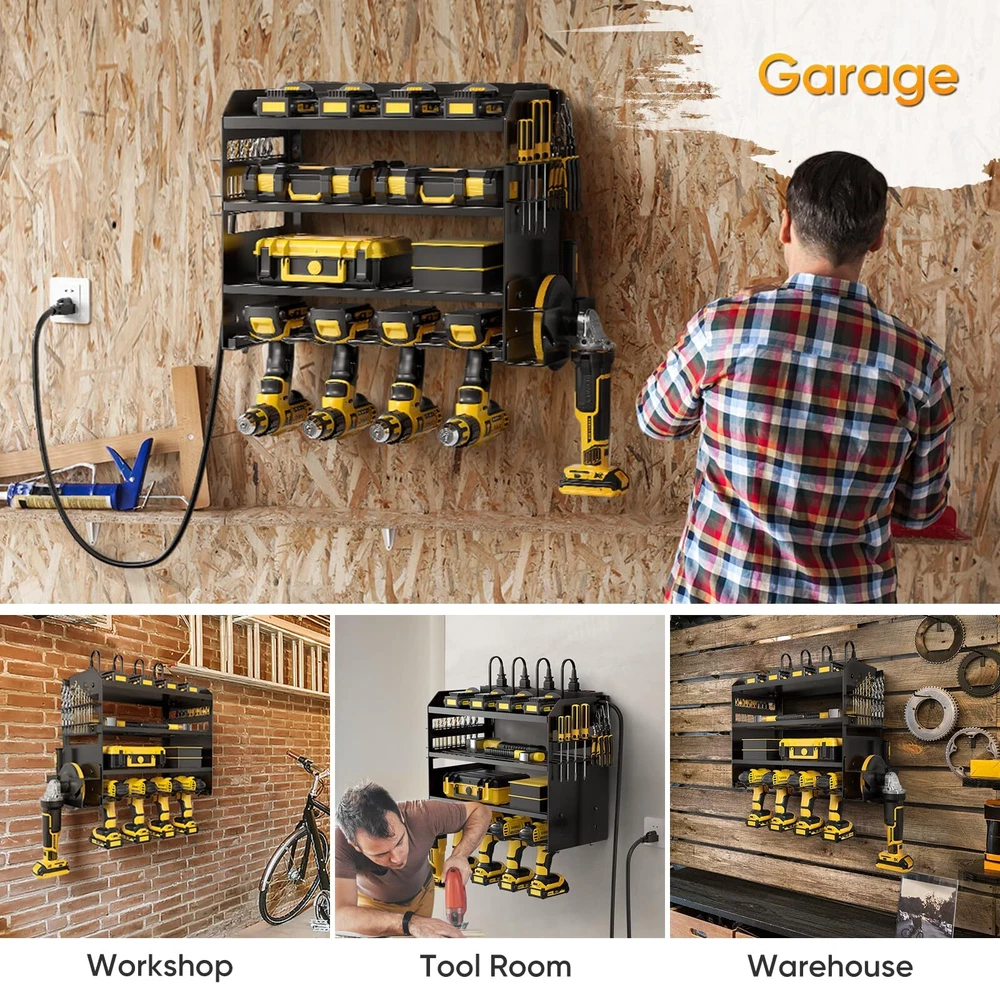 Power Tool Organizer Wall Mount with Charging Station,Tool Storage Rack with 8 Outlet Power Strip,Heavy Duty Metal Battery Utility Rack with 4 Cordless Drill Holder 6.56 Ft Cord for Garage High-Quality Metal Bearing Capacity of 300 Lbs:Our power tool organizer wall mount with charging station is constructed from high-quality and heavy-duty metal materials. The industrial metal has undergone extensive load-bearing tests, allowing it to support up to 330 lbs. You no longer need to worry about the shelf breaking or falling off the wall. Our power tool holders can accommodate power tools of any weight. Power Tool Organizer with 8-Outlet Power Strips: Our garage shelf wall mount is designed to charge your tools, eliminating the need to search for an outlet. You can easily charge your tools on the shelf, which not only resolves your storage issues but also offers a convenient solution for charging tool batteries. Please note that the product includes a 6-foot (2-meter) power cord. 4-Tier Tool Rack Accommodates Most Tools:The wall-mounted tool storage rack with power strip features 2 Side Drill Bit Rack,4 Hooks, Two Shelves,8 Slots For Drills, and 8 outlets power strip. It can accommodate all your tools, including your charging station, batteries, toolbox, drill, hammer, Screwdriver, and other garage equipment, without any additional hassle. This organizer enhances your storage space significantly. Quick Installation:We offer professional manuals and high-quality installation accessories, allowing you to assemble a perfect garage cordless drill holder in just a few minutes. Whether you mount it on a wooden wall, concrete surface, or pegboard, this tool rack wall hanger fits seamlessly! Feel free to use it to store your tools! Save Space and Keep Your Space Clean:Are you still struggling with a cluttered tool area? Our upgraded power tool battery shelf measures 16.5 inches in length, 8.7 inches in width, and 12 inches in height. It is designed to accommodate a variety of tools, helping to keep your tools organized and your workbench space tidy. This shelf is perfect for use in a warehouse, tool room, garage, workshop, and more. Our garage wall organizer maximizes storage space effectively. TOOL STORAGE EXPERT: The tool organizer can turn your messy workbench or wasted wall space into a tidy and efficient workplace. The additional angle grinder holder allows you to organize more things such as storing polishers and angle grinders, etc. You will definitely get a satisfactory solution. Shipping We offer FREE shipping on all orders! We ship within Three business days of payment, usually sooner. We use a selection of shipping services such as UPS, FedEx, USPS etc. We only ship to the lower 48 states, no APO/FPO addresses or PO Boxes allowed. Local pickups and combined shipping options are not provided at this time. Return You can return a product for up to 30 days from the date you purchased it. Any product you return must be in the same condition you received it and in the original packaging. Please keep the receipt. Payment We accept payment by any of the following methods: PayPal Please pay as soon as possible after winning an auction, as that will allow us to post your item to you sooner! Feedback Customer satisfaction is very important to us. If you have any problem with your order, please contact us and we will do our best to make you satisfied. Contact Us If you have any queries, please contact us via ebay. We usually respond within 24 hours on weekdays. Please visit our eBay store to check out other items for sale! Thank you for shopping at our store.