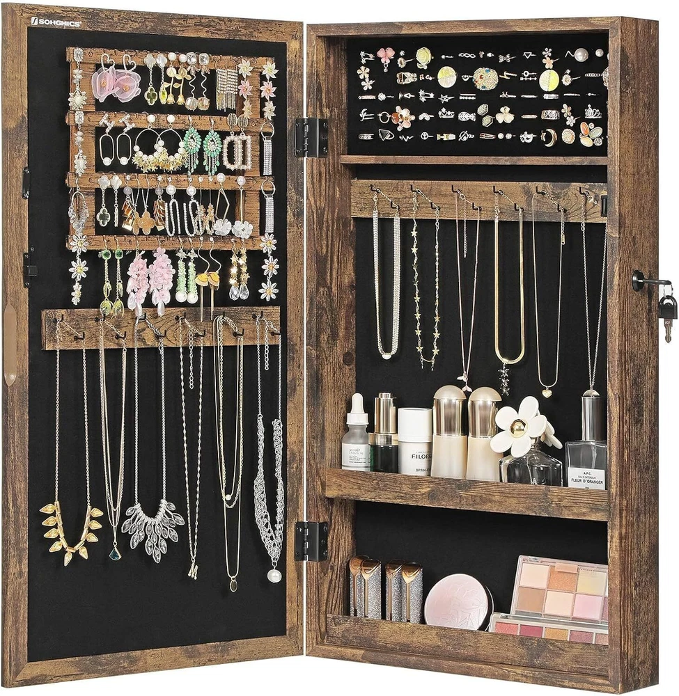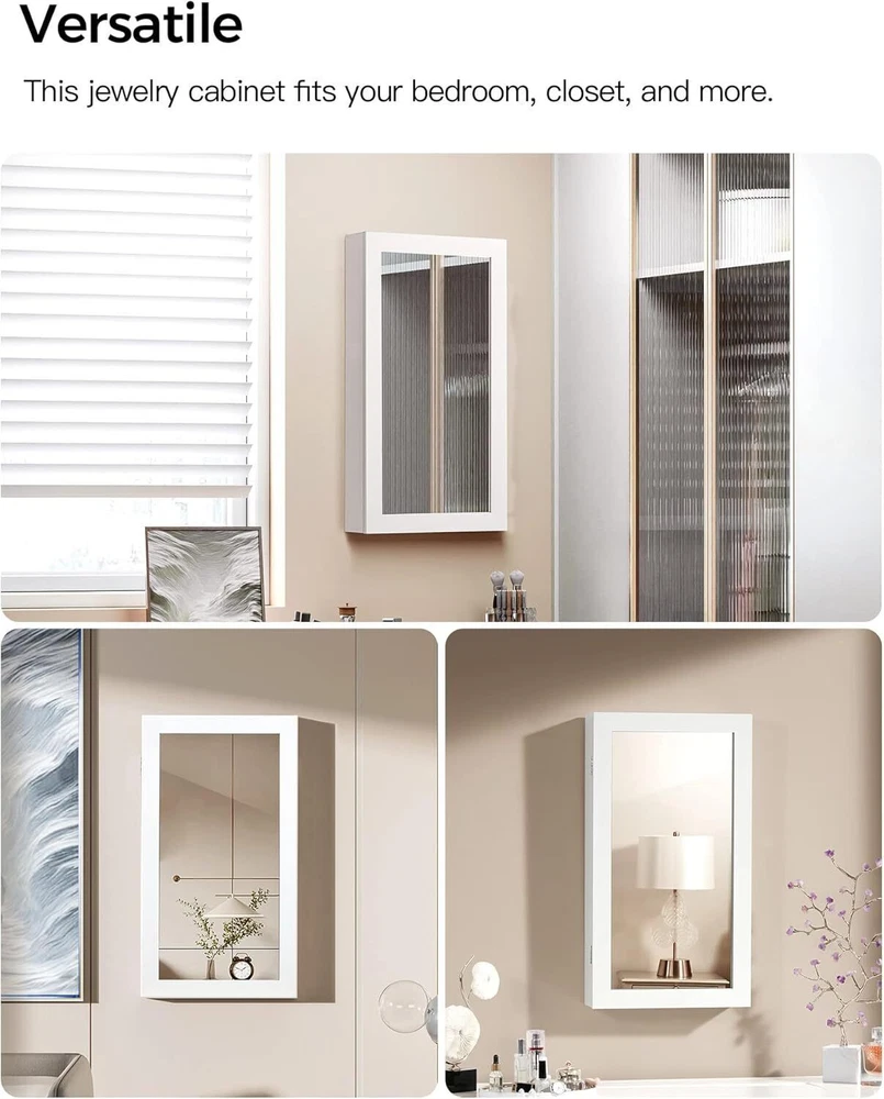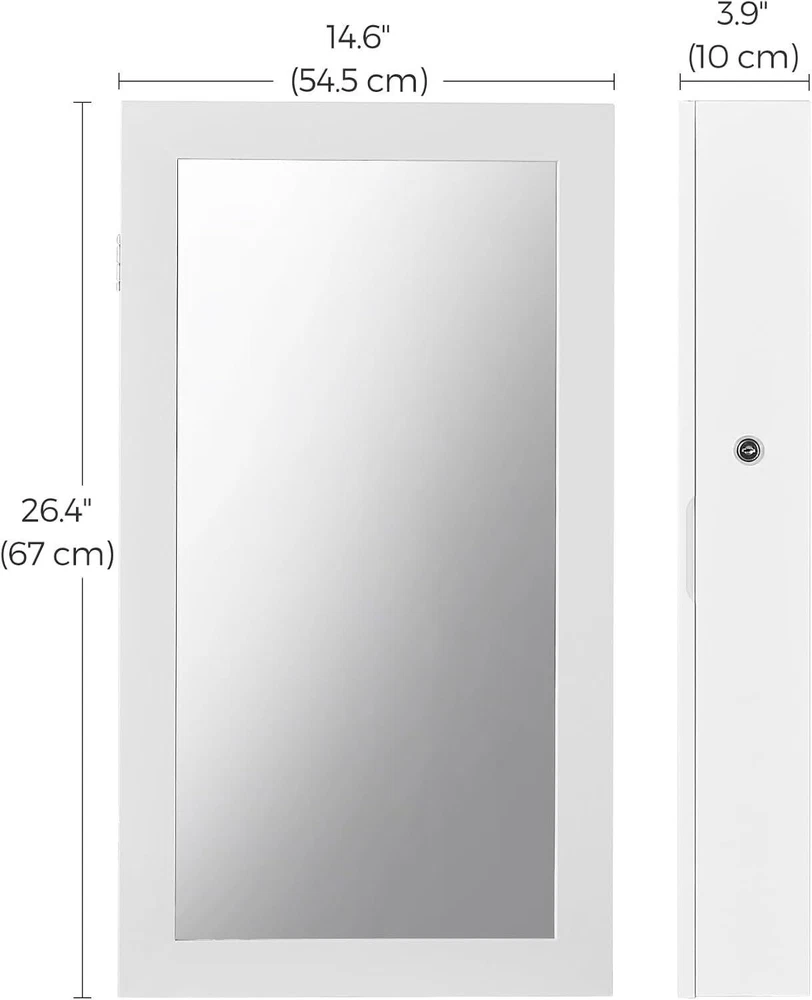 Product Description Earring Storage Keep your earrings and studs in pairs and in order for you to fetch them easily. Sturdy and Durable This jewelry cabinet crafted with MDF will serve your beauty routine for years. Lockable The lockable cabinet with two keys allows you to store your accessories safely. Installation Holes They help you easily hang the jewelry cabinet with mirror on the wall. A Must-Have for Your Beauty Routine: Before work or a fun night out, isn't it great to have a place where you can get ready? Stylish and practical, this SONGMICS jewelry armoire is perfect for you! Small Jewelry Cabinet for Flexibility: With the size of 3.9''D x 14.6''W x 26.4''H, the small jewelry cabinet takes up a little space. It can be mounted anywhere in your home, hallway, bathroom, and bedroom, etc. Organize Your Jewelry in One Place: Open the mirrored door to reveal a spacious area for your gems and jewels. Clear partition enables you to see your frequently used items at a glance, making daily dressing up a quick process. Specifications: Color: White Material: MDF (Medium Density Fiberboard), Glass Mirror, Velvet Lining Product Size: 3.9''D x 14.6''W x 26.4''H (10 x 37 x 67 cm) Product Weight: 11.5 lb (5.2 kg)