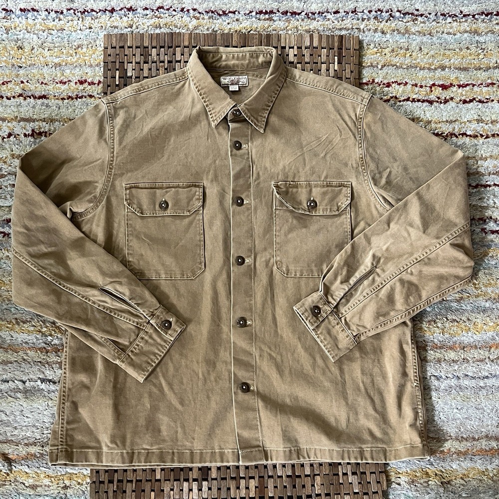 This Wallace & Barnes J.CREW button-down military jacket is a versatile addition to any wardrobe. Made from high-quality cotton, it features a solid beige color, button closure, and a button-down collar. The jacket is perfect for a variety of occasions, including travel, casual wear, work, and business. With its XL size, the jacket is designed to fit comfortably and features a range of pockets for storage. The jacket is suitable for a range of activities, including walking and hiking, and is perfect for both fall, winter, and spring seasons. The jacket is a great choice for any man who wants to add a touch of American style to their wardrobe.