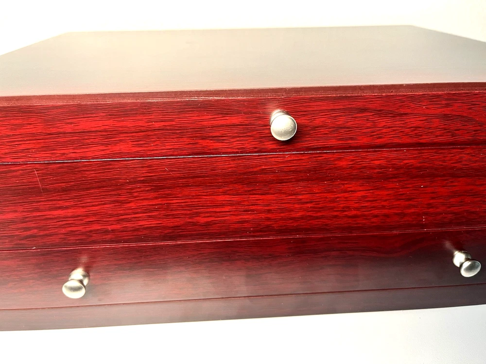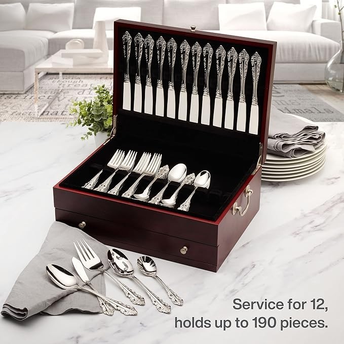 Store and protect your flatware in style with this Wallace Dark Walnut Flatware Storage Chest with Drawer . Crafted with a rich walnut finish and a soft felt-lined interior, it keeps your utensils neatly organized, protected, and easily accessible. Ideal for stainless steel or silverware collections. Key Features: Dark walnut wood finish with elegant silver-tone knob Felt-lined interior helps prevent scratches and tarnish Upper compartment + pull-out drawer for expanded storage Holds service for 12–16 (flatware not included) Approx. dimensions: 14.7" W × 10.8" D × 5.7" H Durable, stylish, and perfect for countertop or cabinet storage Condition: Brand new, unused, in original packaging. A premium, timeless solution for organizing and displaying your flatware collection.
