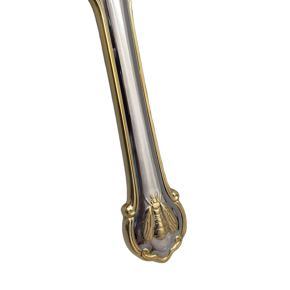 Offered is One Steak Knife in the Napoleon Bee Gold Accent pattern by Wallace. This Steak Knife measures 9-3/8" in length. Crafted of High Quality 18/10 Stainless. Dishwasher Safe. One Steak Knife This steak knife measures 9-3/8" in length. Crafted of High Quality 18/10 Stainless Steel Features a 24k Gold Accent Dishwasher Safe