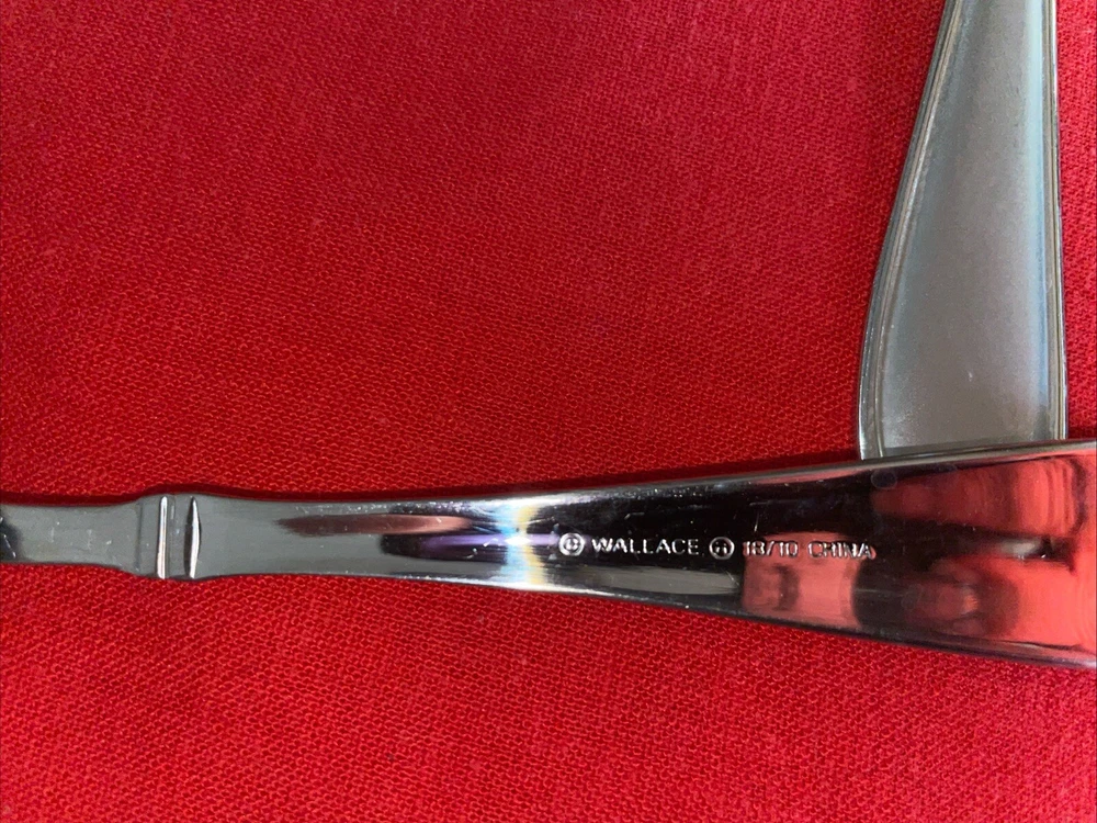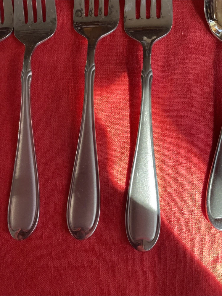 * missing one soup spoon Elevate your dining experience with the Wallace Summerset Frost 18/10 Stainless Steel Flatware Set. Crafted from premium stainless steel, this 24-piece set includes forks, knives, spoons, and a serving set, all designed with a sleek silver finish that complements any table setting. The durable handle material ensures a comfortable and secure grip, perfect for everyday use or special occasions.
