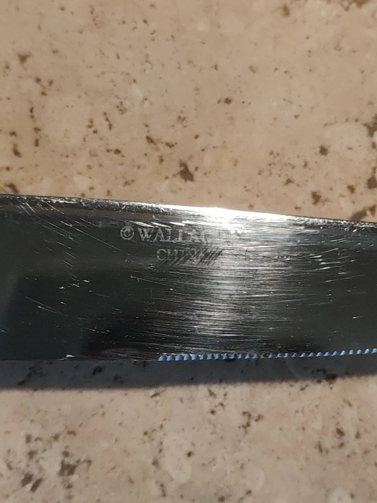 The Wallace ZENITH Glossy Dinner Knife is a sleek and modern 9.5" replacement piece of flatware to complete or expand your set. This is preowned and shows typical signs of wear from age and use including scratches and buffs.