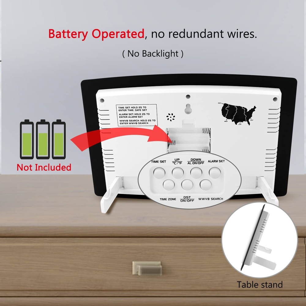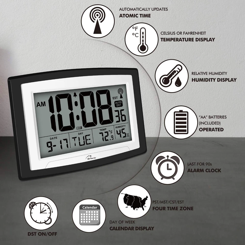 WallarGe Atomic Clock with Indoor Temperature and Humidity, 12.5 Inch Self-Setting Digital Wall Clock or Desk Clock, Battery Operated Digital Clock Large Display for Seniors, Auto DST Product Details Size: 12.5 inch Brand: WallarGe UPC: 700355110859 EAN: 0700355110859 MPN: Does not apply Brand: WallarGe Color: Black, White Display Type: Digital Special Feature: Atomic Product Dimensions: 10.6"W x 7"H Power Source: Battery Powered Age Range (Description): Adult Room Type: Living Room Shape: Rectangular Indoor/Outdoor Usage: Indoor Brand: WallarGe Color: Black, White Display Type: Digital Special Feature: Atomic Product Dimensions: 10.6"W x 7"H Power Source: Battery Powered Age Range (Description): Adult Room Type: Living Room Shape: Rectangular Indoor/Outdoor Usage: Indoor Theme: Plain Frame Material: Acrylonitrile Butadiene Styrene Are Batteries Included: Yes Mounting Type: Desk Clock,Wall Mount Item Weight: 1.3 Pounds Number of Batteries: 3 AA batteries required. (included) Alarm Clock: Yes Watch Movement: Automatic Number of Items: 1 Operation Mode: Atomic Size: 12.5 inch Manufacturer: WallarGe UPC: 700355110859 Item Weight: 1.3 pounds Country of Origin: China Batteries: 3 AA batteries required. (included) Date First Available: November 11, 2019 Atomic Digital Clock Auto Set (No back light) - Using radio frequencies broadcast from NISTs Colorado , the clock will automatically set to the correct time. Automatically adjusts to Daylight Savings Time while set the DST on. Atomic Wall Clocks Battery Operated with Alarm - This digital calendar alarm day clock required 3 AA long life batteries (Not included) for operation, no redundant wires, easy to use. Turn on the alarm clock before going to bed, it will wake you up in the morning. Clock with Temperature and Humidity - Excellent wall clocks for living room, office, bathroom decor,etc. Help you monitor indoor temperature and humidity to avoid cold. 12/24 hours formats with clear Hours, Minutes and Seconds display; 4 Time Zone to choose. Atomic Clock Large Display for seniors - WallarGe atomic clock has been designed with absolute simplicity in mind, you can also set it manually without any more ado. Wall clock or desk clock, large and clear digital display, easy to read. Digital Wall Clock with Accurate Date and Time - This digital calendar alarm day clock can help you keep track of dates, days of the week and times to avoid missing any important meetings, appointments or anniversaries, work well for work, study or travel schedule.