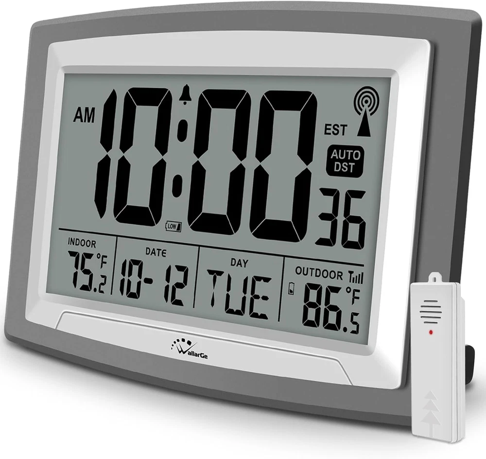 Store New Arrivals Add to Favorite View Feedback Wallarge Atomic Clock with Outdoor and Indoor Temperature - 12.5 Inch Self-Setting Digital Clock Large Display, Battery Operated Wall Clocks or Desk Clocks for Bedroom, Livingroom, Office Description Style digital Number of Items 1 Power Source Battery Powered Dial Color black Country of Origin China Theme Plain Are Batteries Included No Product Dimensions 10.6"W x 7"H Operation Mode Atomic Frame Material Acrylonitrile Butadiene Styrene Age Range (Description) Seniors, Elderly, Adults, Youth, Teens, Kids Alarm Clock Yes Number of Batteries 5 AA batteries required. Watch Movement Automatic Manufacturer WallarGe Indoor/Outdoor Usage Outdoor, Indoor Item Weight 1.26 pounds Special Feature Daylight, Temperature Display, Alarm, Radio Display Type Digital Mounting Type Wall Mount Color Silver, Metallic Grey Shape Rectangular Batteries 5 AA batteries required. Brand WallarGe Size 12.5INCH Accurate Atomic Clock – Never Need Setting. Atomic clock has a built-in receiver that automatically synchronizes itself with the WWVB radio broadcast by the US Government’s National Institute (NIST) in Fort Collins, Colorado. The Atomic Clock will always be accurate to within one second as it receives daily WWVB updates. Wireless Outdoor Temperature Sensor - The Wireless outdoor sensor transmits the outdoor temperature to the atomic clock. The sensor should be placed within 100ft of the clock. Also, clock has a built-in high-quality indoor temperature sensor so that you can read the temperature both indoor and outdoor. Digital Wall Clock or Desk Clock - Jumbo 2.5" Height Time Digital Display - Use as either a wall clock or as a desk clock, it is easy to read, easy to Use and easy to set up. This atomic clock has been designed with absolute simplicity in mind, you can also set it manually. They are excellent clocks for seniors, perfect for anyplace in your home or office. Multiple Display Modes – 12/24 Hour time formats with accurate and clear second minute and hour display; 4 time zone to choose (PST, MST, CST, EST); auto daylight saving time; temperature display units in Celsius (℃) or Fahrenheit (℉). Battery Operated Atomic Wall Clock – Both clock and outdoor sensor are supported by batteries only, no need to plug or charge(Batteries not included). The existed alarm features can wake you up in the morning or help you keep track of dates and days of the week to avoid missing any important meetings or appointments. Product Description WallarGe Atomic Clock About RCC Atomic Clock. As Radio Controlled atomic clock, it can receive the time signal transmitted by the National Institute of Standards and Technology (NIST), which is regulated by 3 atomic clocks and deviates less than 1 second within 3,000 years. The NIST broadcasts the time signal (WWVB,60KHz) continuously from Fort Collins, Colorado. This signal can be received anywhere in the continental USA and Canada that long wave (AM) radio reception is possible with a portable radio. It is expected that the signal can reach a distance of over 2,000 miles from the transmitter. Therefore, your clock will receive the signal within the broadcast range anywhere an AM signal can be received; generally, the time signal cannot be picked up in massive metal and concrete structures unless near a window. In addition, some environmental effects (see below) may affect the transmitting distance and reception. For more information, please refer to the WWVB web page of NIST. Self-setting Every Midnight. This digital wall clock will automatically receive the time signal every day at midnight and makes any required adjustments to the time setting. That is to say, it updates the time every night automatically, so it is more accurate than any other ordinary electronic clock. Therefore, it is very suitable for those friends who have high requirements for time accuracy. Note 1: Frequent use of this feature may affect battery life. Note 2: After 48 hours, if the clock hasn't received the signal, or if you have any problems or do not understand any parts of these instructions please write to us freely. Note 3: If the RCC time signal is not received successfully and the time automatic setting fails, you can also cancel the radio reception and set the time manually. About Outdoor and Indoor Temperature Monitor. This digital clock's indoor temperature monitoring relies on a built-in Swiss high precision SHTC3 indoor temperature sensor, and its outdoor temperature monitoring is mainly through the radio frequency (RF) transmitter to collect the outdoor temperature and then send the temperature information to the receiver, and finally display the temperature on the clock.The maximum receiving distance of outdoor temperature is 330ft. Temperature Detection Range. 1.Operating temperature is from -40℉ to 158℉ (-40℃ to 70℃) 2. The indoor temperature display range is -40℉ to 158℉(-40℃ to 70℃). Indoor temperature is measured once every 10 seconds. 3. The outdoor temperature display range is -40℉to 158℉ (-40 ℃to 70℃).The outdoor transmitter temperature is measured once every 10 seconds but transmit RF signal every 32 seconds. 4.Temperature accuracy +/- 0.1℉(+/- 0.1℃) Who Needs Atomic Clocks More? This is an atomic alarm clock for anyone.However,since atomic clock will automatically receive the time signal every day at midnight and makes any required adjustments to the time setting.So it is more accurate than any other ordinary electronic clock. Therefore, it is very suitable for those industries and friends who have high requirements for time accuracy,such as scientists, stock traders, doctors, nurses, teachers, lawyers,etc. Tip : Since in the self-setting (RCC)mode, the clock will automatically turn on to receive radio signals every night, so the battery may consume quickly, or sometimes in extreme weather or weak signal or other disturbances appear nearby, the clock may also appear to receive the wrong time 