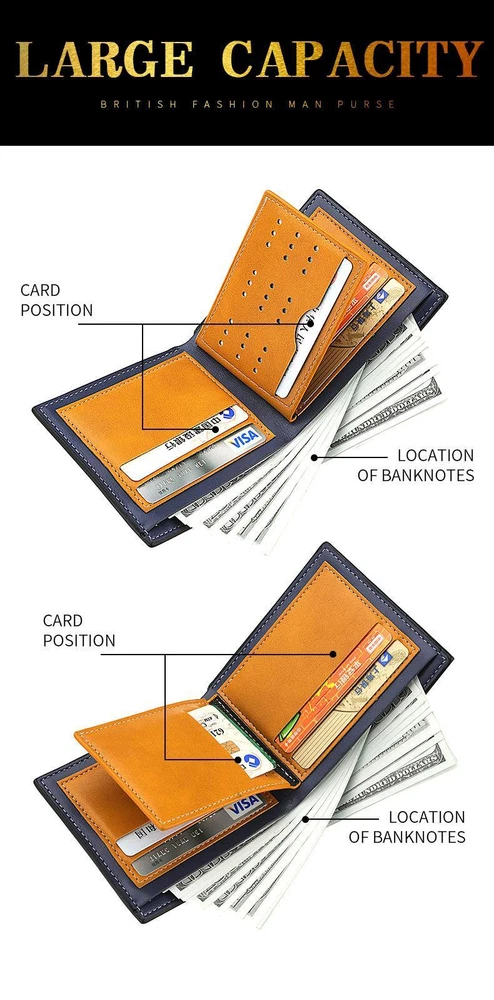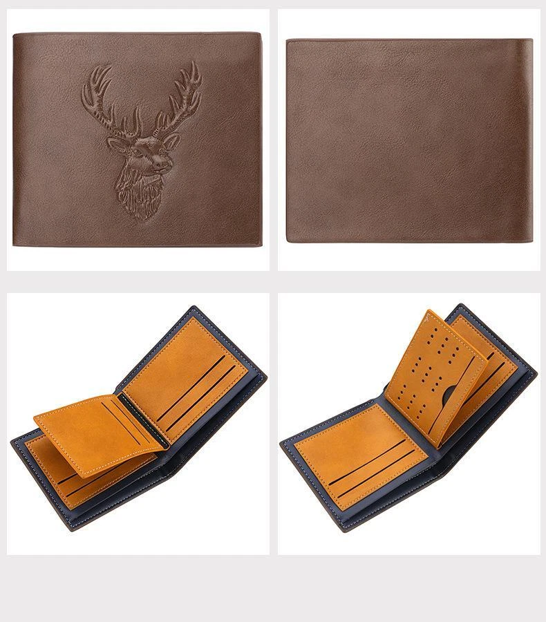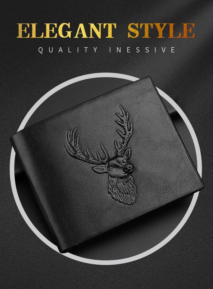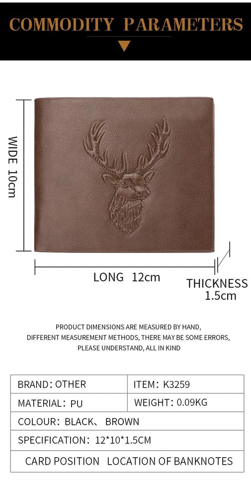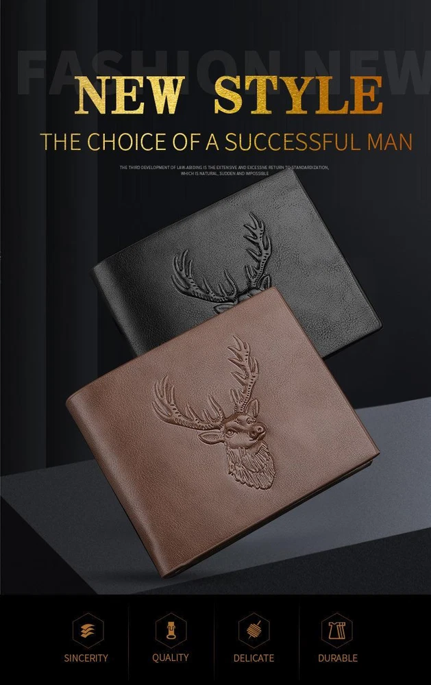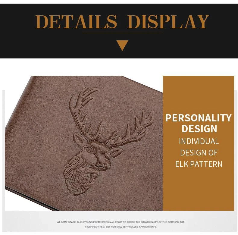 Free and fast shipping , shipping take up 1-7 Business Days 30 Day Return Accepted EASY PAYMENT via PayPal, Credit Card, PayPal Credit, Google Pay... Wallet Credit Card Holder Deer Leather Multicolor Modern Solid Small Slim Man Men's Deer Head Pattern Wallet Classic 3D Embossed Design Make Three-fold Multiple Card Slots Leather Wallet Features: 1. Stylish and Classic: Deer head pattern and 3D embossed design make this wallet a timeless accessory for any business occasion. 2. High-Quality Material: Made of premium PU leather, this wallet is durable and comfortable to touch. 3. Spacious and Organized: With multiple card slots, a clear ID window, and a large bill compartment, this wallet can hold all your essentials in an organized way. 4. Perfect Gift: This wallet is a perfect gift for any man who values style and functionality. REVIEWS The product came very well packaged. I'm very happy. thank you for everything. Seller strongly recommended. This is great! I definitely recommend! Product looks amazing Delivery was fast. Excellent seller, great communication. I advise everyone to buy it!