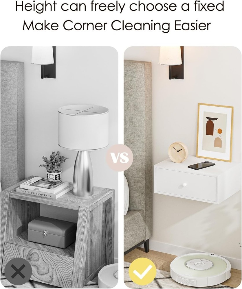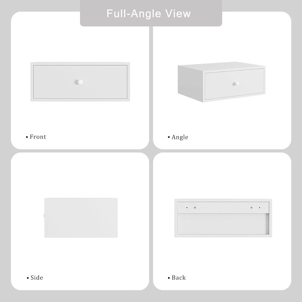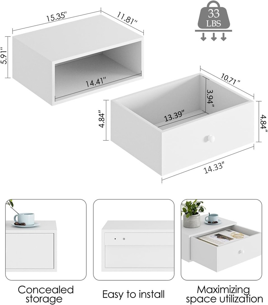 Floating nightstand, Shelf with Drawer, Wall Mounted White Product Details Brand: Aienvey Product Dimensions: 11.81"D x 15.75"W x 5.91"H Maximum Weight Recommendation: 33 Pounds Color: White Product Care Instructions: Wipe with Dry Cloth Item WeightFrame Material: 10.6 PoundsEngineered Wood Top Material TypeShape: Engineered WoodRectangular Floating nightstand: This wall mounted nightstand is the natural evolution of the traditional one, but new in terms of modernity. This beautiful sleek design would blend well as a modern nightstand in your home. Whether it be in the bedrooms, living room, office, study room, or any other room to make them look stylish Space utilization: The hanging shelf with drawer is adapt to create Minimalist rooms and gives his touch also to the most anonym one. You can arrange objects both on the surface and inside the retractable drawer. It allows a better usage of space, easier cleaning and more order in the room Flexible design: The floating bedside table is very adaptable, you can hang it on the wall and it will change your room's appearance, which can be for kids or adults. Try to place two of them one on or next to each other: You will discover new worlds Environmentally friendly: Made of engineered wood panels, it is environmentally friendly, has strong texture and is not easy to be deformed, the surface is made of matte pvc, easy to clean,scratch resistant. Maximum total capacity: 33 lb Easy installation: This wall shelf with drawer arrives already assembled, ready to be easily fixed on the wall, in a few minutes, thanks to the assembly kit included in the package. If you don’t understand floating nightstand installation, please contact us