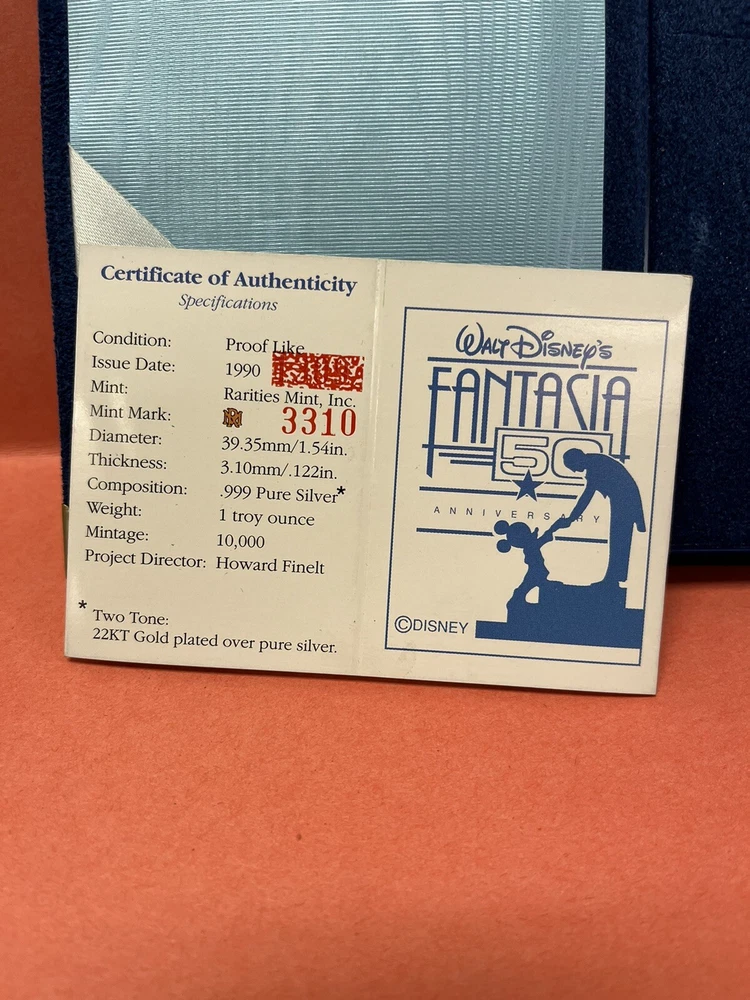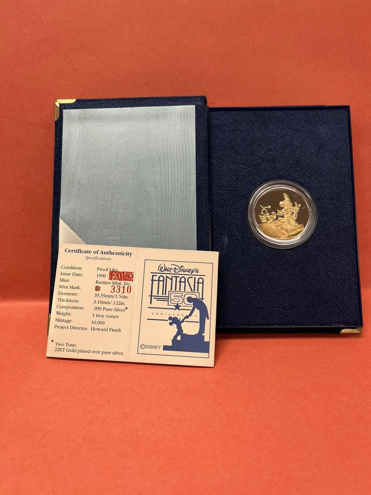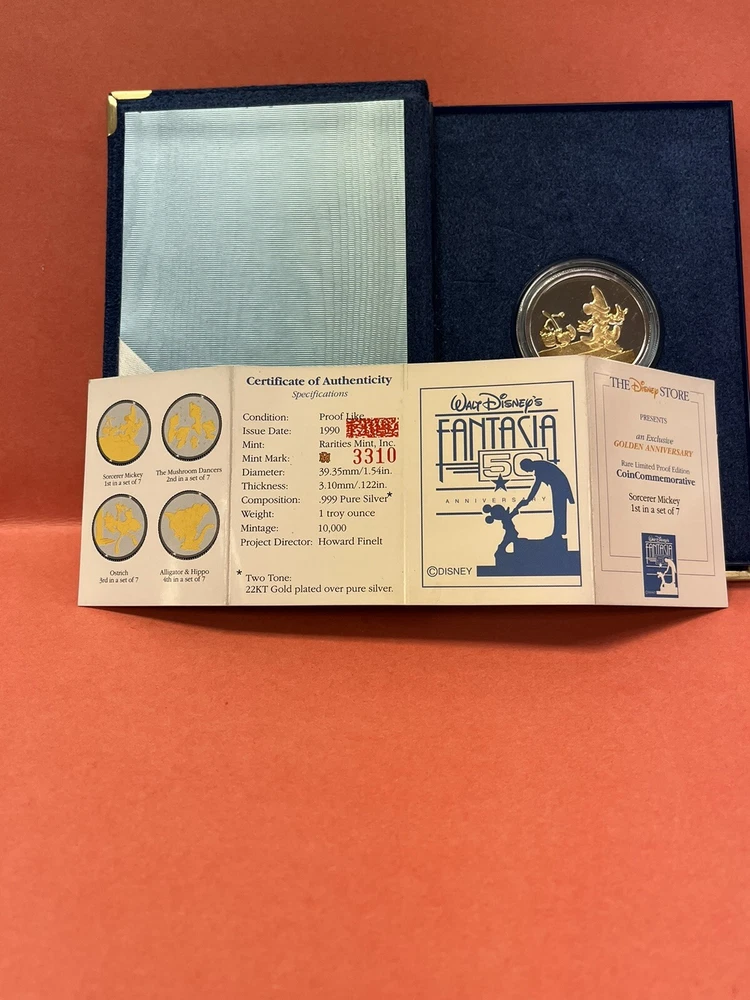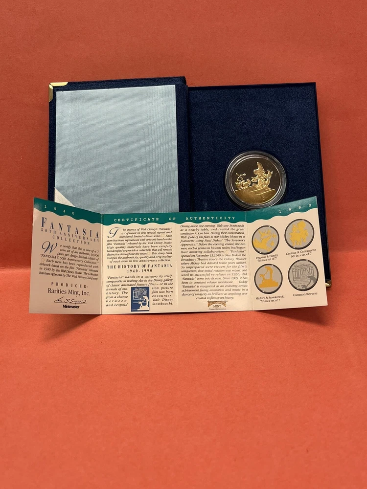Walt Disney Fantasia 50th Anniversary Collectors Coin Rarities Sorcerer Mickey 1990 In original case In great condition Certification inside Please look at pictures before purchasing to make sure you are happy. No returns thank you Enjoy looking at my other items in my store! Our History: From our family’s origins in Germany and South America and finally in our storefronts and clock repair shops for decades in the US, we’ve collected thousands of unique clocks, watches, parts and collectibles – 6 Generations of Merchandise Welcome to our long awaited presence on the web! All kinds of unique items for your pleasure! Check back often! We are constantly adding items and will be growing our online inventory slowly so come back. NOTE: ALL PICTURES ARE CONSIDERED PART OF THE ITEM’S DESCRIPTION – Please view them ALL prior to making your purchase General Store Policies: Please note that many of our listed items are antique, vintage and in general many years old. Therefore, please see ALL of the provided photos, as they are the most accurate description of what you are purchasing and are considered the item’s description! Paypal payment is expected within 48 hours of sale. Returns accepted only if we grossly misrepresented the item, or a 30% restocking fee applies. Buyer pays any return shipping. We are honest, hardworking people, and strive for your satisfaction. Please contact us to resolve any issues before leaving anything other than positive feedback. thanks for visiting!
