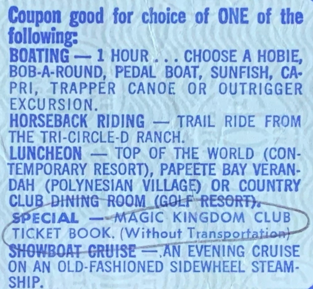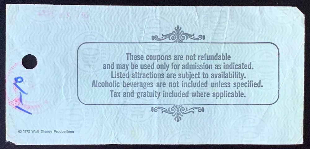 Walt Disney World - Coupon good for choice of ONE of the following: (USED) This is a Walt Disney World - Walt Disney's MAGIC KINGDOM CLUB This was for an adult 18 and over. The coupon is the large format ticket measuring 6" x 2½". Coupon is used and redeemed. It has stamped "Dec 28 1974" & For $5.75. Written in ink is "Written off to Income 12/28/74" Coupon good for choice of ONE of the following: BOATING – 1 Hour … CHOOSE A HOBIE, BOB-A-ROUND, PEDAL BOAT, SUNFISH, CAPRI, TRAPPER CANOE OR OUTRIGGER EXCURSION. HORSEBACK RIDING – TRAIL RIDE FROM THE TRI-CIRCLE D RANCH. LUNCHEON – TOP OF THE WORLD (CONTEMPORARY RESORT), PAPEETE BAY VERANDAH (POLYNESIAN VILLAGE) OR COUNTRY CLUB DINING ROOM (GOLF RESORT). SPECIAL – MAGIC KINGDOM CLUB TICKET BOOK. (Without Transportation) SHOWBOAT CRUISE – AN EVENING CRUISE ON AN OLD-FASHIONED SIDEWHEEL STEAMSHIP. ----------------------------------------------------------------------------------------------------------------------------------------- The back states: “These coupons are not refundable and may be used only for admission as indicated. Listed attractions are subject to availability. Alcoholic beverages are not included unless specified. Tax and gratuity included where applicable." Please ask questions before buying this item. To combine shipping with other items, contact me BEFORE buying it. Shipped USPS Ground Advantage with tracking.