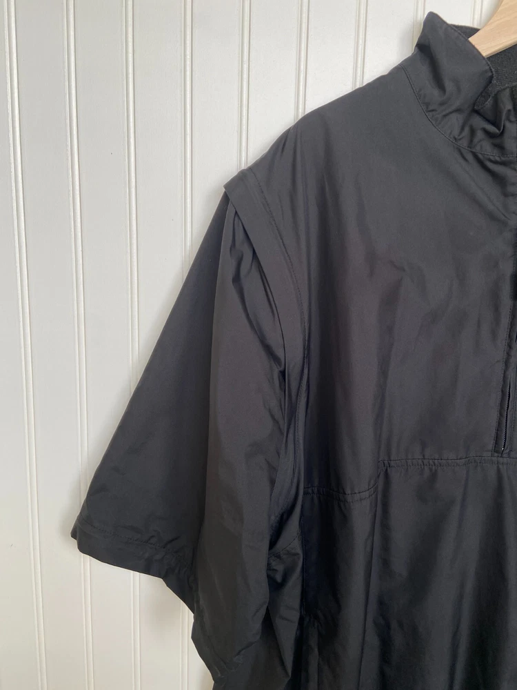 Elevate your golf game with this stylish and comfortable Walter Hagen Men's Pullover Shirt in size 2XL. The shirt is made of high-quality polyester material that is both durable and machine washable. It features a solid black color with a high neck and a pullover closure for easy wear. This shirt is perfect for any golf enthusiast who wants to look and feel great on the course. It comes with removable short sleeves that make it perfect for warm weather and a 1/4 zip closure that adds a touch of sophistication. The shirt is waterproof and perfect for any sports activity. Get ready to impress your golf buddies with this stylish and functional shirt. Removable sleeves (they zip off) Perfect condition. Pit to pit: 28" Length: 28"