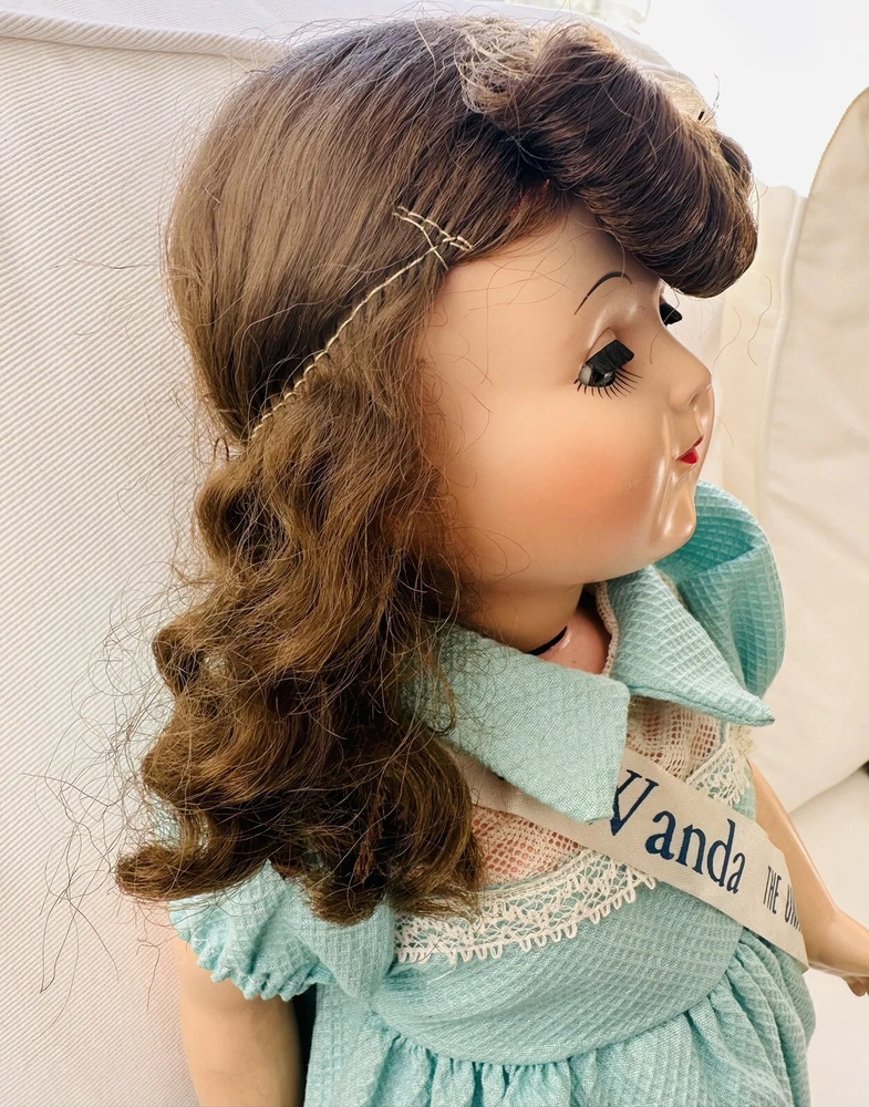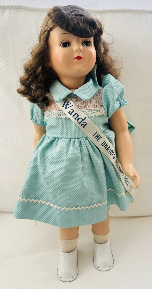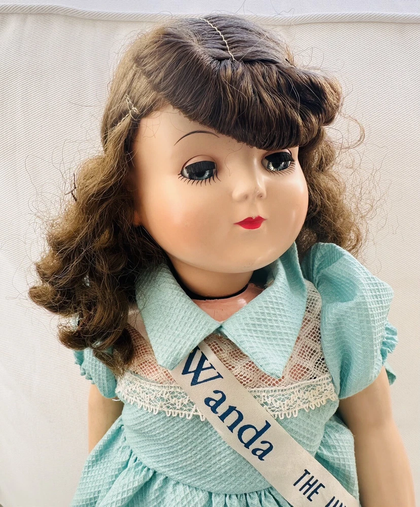 Doll Eye Color:BlueOccasion:All OccasionsDoll Hair Type:WavyMaterial:Hard PlasticSet Includes:DollFeatures:Collector Toy, Eyes Open and Close, Interactive, No Battery Used, Removable Clothes, Special Edition, Timeless Treasure, WashableTime Period Manufactured:1950-1959Handmade:NoCountry/Region of Manufacture:United StatesUPC:does not applyBrand:Advance Doll & Toy CoType:Play/Collector Dol + Small 7.5" dollgtin13:does not applyYear Manufactured:1950Character:WandaVintage:YesItem Length:18 inSigned:NoDoll Complexion:LightOriginal/Licensed Reproduction:OriginalDoll Gender:Girl DollAntique:YesEthnicity:CaucasianUnit of Sale:Single UnitDoll Hair Color:Brown