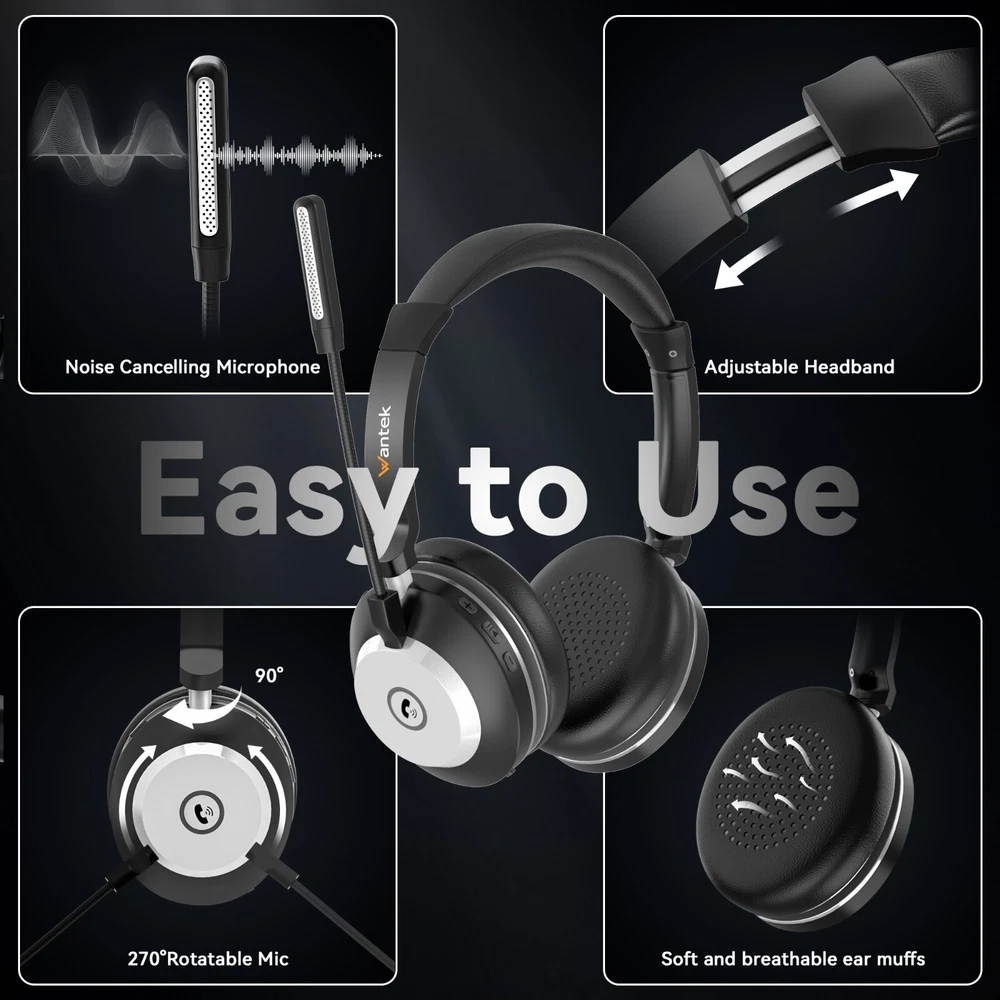 About this item ✅【AI Intelligent Noise Reduction Microphone】Wantek wireless headset for computer with AI environmental noise cancelation microphone, it can eliminate up to 99.99% of the ambient noise. So you can hear and be heard clearly wherever you are ✅【Bluetooth Headphones】On-ear headphones connect quickly to your phone or tablet via Bluetooth. Phone headset with built-in audio sound card ✅【Adjustable Headset】The padded headband of the wireless headset is adjustable and stretchable to fit your head perfectly, suitable for both children and adults. Soft protein memory foam ear cushions are made with premium breathable material, ROHS certified material prevents ear heat and sweat(The microphone return to home position can mute the function only applies to the call state) ✅【Battery Power】The Bluetooth headset provides up to 14 hours of continuous talk and 200 hours of standby time on a single charge, plus 2 hours of work time with a 10-minute quick charge. Long battery life brings convenience to your life ✅【24 Months Warranty】Maybe we can't be 100% satisfied with our electronic products, but we will try our best to be 100% satisfied