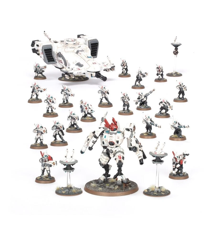 Warhammer 40K Combat Patrol Tau Empire - NEW 2024 Release - 2 DAY SHIPPING T'au The T'au Empire employs advanced firepower and complex metastrategies in its quest to enlighten the galaxy, each suited to different environments, objectives, and enemies. The Sudden Dawn Cadre specialise in the philosophy known as Mont'ka – the Killing Blow. Skilled Pathfinder scouts mark vital targets, Breachers mobilise with swift grav-transport technology, and Commander Cloudspear uses her powerful Enforcer Battlesuit to lead high-risk, high-reward tactical raids deep into hostile heartlands. Fight for the Greater Good with Combat Patrol: T'au Empire! This boxed set is loaded with a balanced force of versatile units, offering enough mobility and firepower to sweep the battlefield clear. This box also allows you to save money compared to buying each kit individually, making it an excellent way to start your army or expand an existing collection. These miniatures can also be used as a complete T'au Empire force for Combat Patrol games of Warhammer 40,000 – the Combat Patrol rules are available as a free download on the Warhammer Community website . This set includes the following multipart plastic models: - 1x Commander in Enforcer Battlesuit (can alternatively build 1x Commander in Coldstar Battlesuit) - 1x Devilfish - 10x Breacher Fire Warriors (can alternatively build 10x Strike Team Fire Warriors) - 10x Pathfinders - 7x Drone models for use as tokens, including 5x Tactical Drones, 1x Recon Drone, and 1x Support Turret - 3x T’au Empire Infantry Decals transfer sheets - 1x T’au Empire Vehicle Decals transfer sheet All models come with their appropriate bases. These miniatures are supplied unpainted and require assembly – we recommend using Citadel Plastic Glue and Citadel Colour paints.