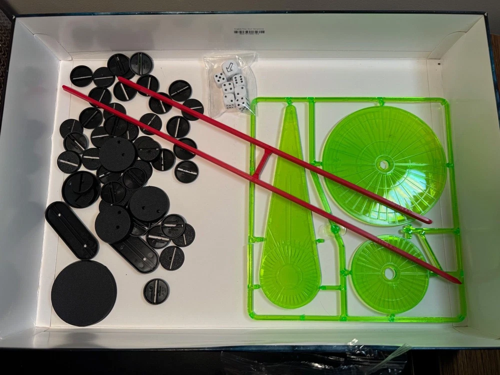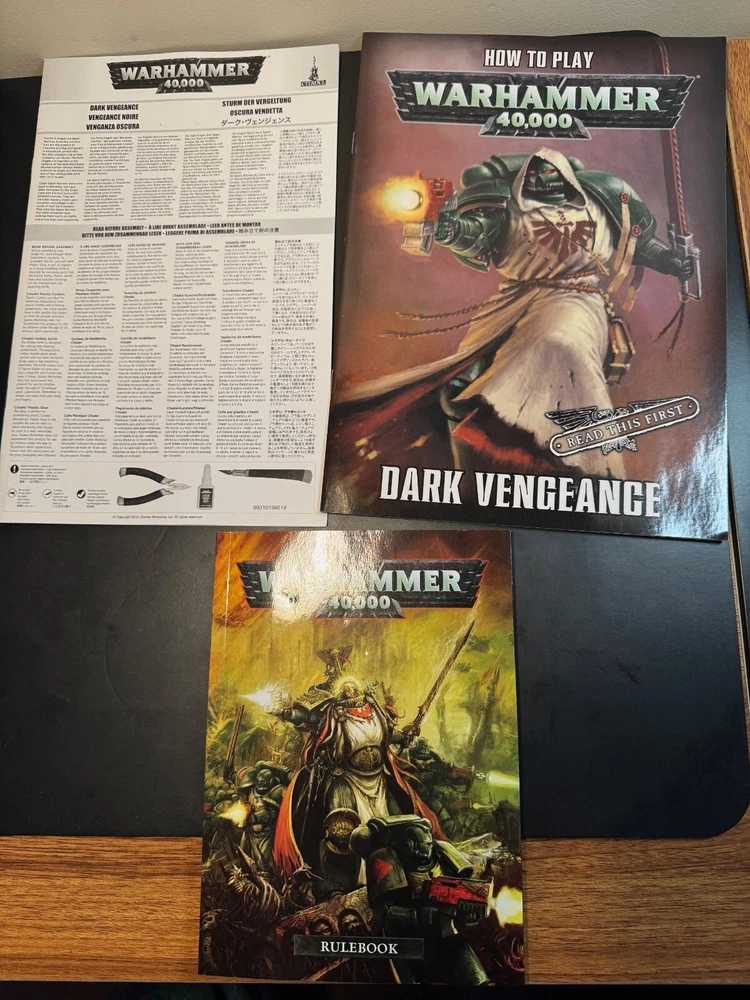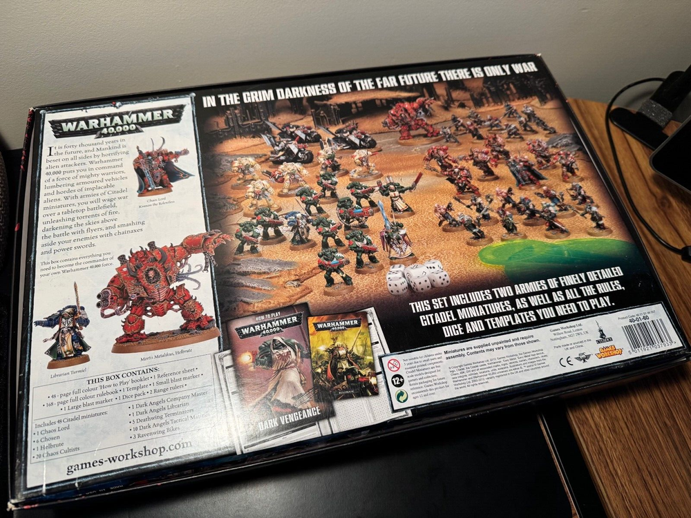 This Warhammer 40k Dark Vengeance box set is complete, with very unit still on sprues with the exception of 1 Tactical Marine (who is primed with Abaddon Black and included in the package). Contains: 1x Warhammer 40,000 168-page Mini Rulebook 1x Dark Vengeance 48-page How to Play booklet 21x Dark Angels Space Marines: 1x Limited Edition Dark Angels Interrogator-Chaplain Seraphicus 1x Dark Angels Company Master 1x Dark Angels Librarian 5x Dark Angels Deathwing Terminators 10x Dark Angels Tactical Space Marines 3x Dark Angels Ravenwing Bikes 28x Chaos Space Marines: 1x Chaos Space Marines Lord 6x Chaos Chosen Space Marines 1x Chaos Space Marines Hellbrute 20x Chaos Space Marines Cultists 1x Dice Pack 1x Warhammer 40,000 Templates Set 2x Range Rulers