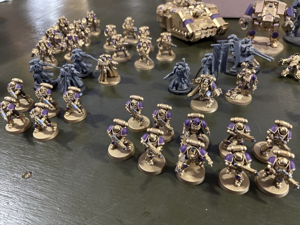 Warhammer 40k space marine army. MSRP ~ 1400 Includes: Gravis CPT Chaplain Ancient Apothecary X2 Librarians X2 Phobos Librarians X4 LTs X17 Reivers X10 infiltrators X10 intercessors X5 Hellblasters X6 Eradicators X6 Aggressors X3 inceptors X3 Suppressors X3 Eliminators Invictor warsuit Redemptor Dreadnought Firestrike servoturret Repulsor