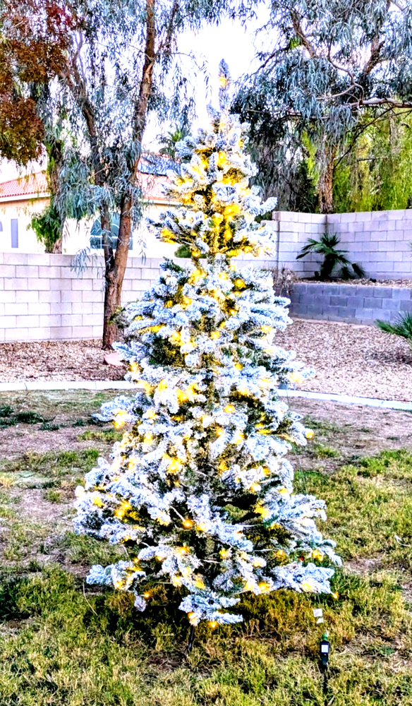 Excellent Used Condition-Fully functional, no broken pieces, and no missing pieces. Glitzhome quality construction and design. Measures 7.5ft tall and approximately 5ft wide in diameter. Pre-Lit 400 Warm White LED Lights. Full size holiday snow flocked fir Christmas Tree. Includes stand, 3 piece separating easy-to-store tree with interconnecting plug for connecting each tree segment to enable the white LED lights. Simply take the stand out and slide it to the x-form support, then slide the 3tree segments into each other to form the 7.5ft tree, plug each tree part into the included electric extension cord, connect the plug and plug into a standard US socket and the tree is ready for display and further decoration-set up is less than 5mins. 16G
