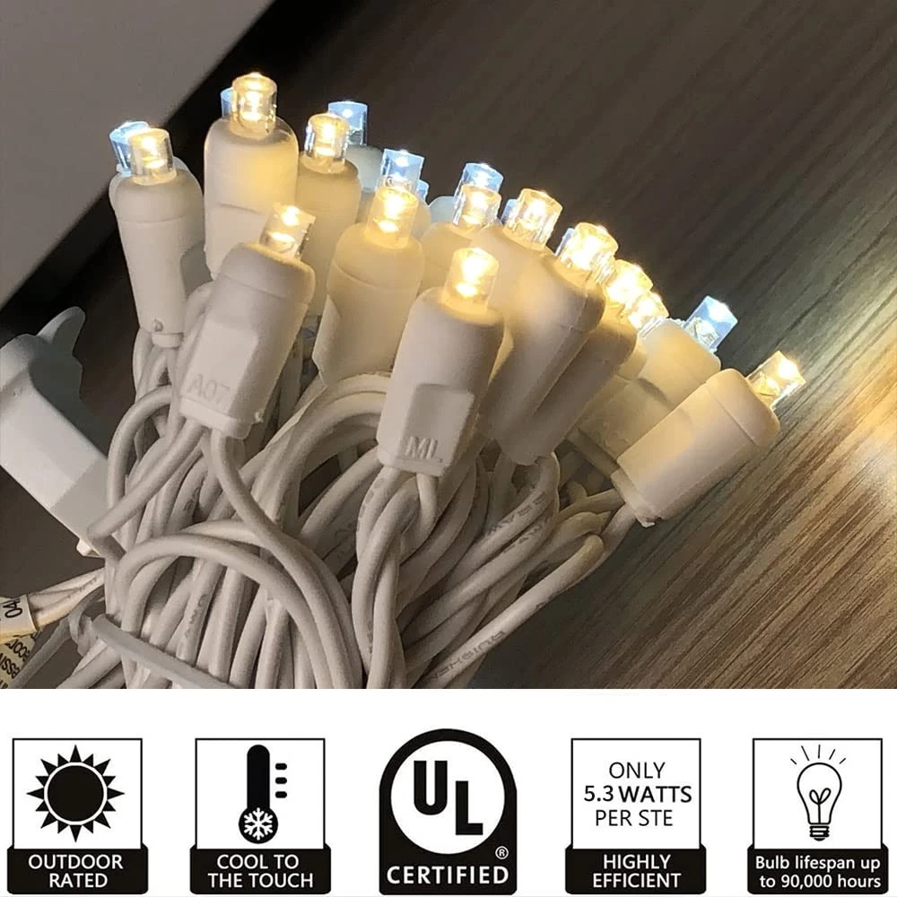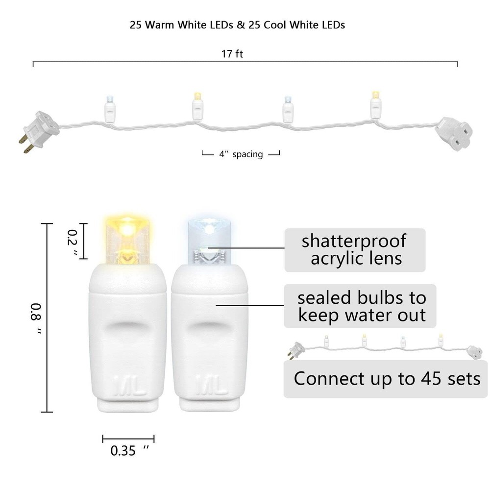 Warm White & Cold White Mini Christmas String Lights,17" UL Listed 5MM Wide Angle LED White Wire Lights, 2 colors in one String Lights for Wedding, Patio, Holiday, Party, Home, Indoor & Outdoor Decorations 【5MM Wide Angle Christmas Lights】When the Warm White & Cold White LED Christmas lights glow in the dark, everything becomes tender, romantic and dreamy. Mini Christmas String Lights are a great decoration for engagements, weddings, parties, stages, Valentine's Day, Christmas, New Years and more. 【Energy Saving, IP64 Waterproof】5MM wide-angle Christmas lights with IP64 commercial grade waterproof design, ideal for indoor and outdoor decoration. 5.3 watt LED mini light, energy saving up to 90%, super bright and low power consumption, eco-friendly, light up all year round, easy to save money. 【Extensible End-to-End Connection】The total length of 17 feet of LED lights allows you to connect up to 40 groups (2,000 lights) end-to-end, if one of the strings burns out, the rest of the strings remain on, for extra peace of mind , each light string comes with extra bulbs and replacement fuses, so you don't have to worry about burning out or overloading your bulbs. 【LONG LIFE AND SAFETY】Our 5MM wide-angle LED Christmas lights are designed with a sturdy PC light bulb housing, so even if you work for a long time, it will not burn your hands and will not flicker. These mini Christmas lights have a lifespan of up to 25,000 hours and the string lights are UL listed to ensure and maximize safety. 【100% Satisfied Service】 100% support all our products and provide lifetime service. Make sure you are satisfied with our products and services, if you are not completely satisfied with your purchase, please feel free to contact us and we will fix it as soon as possible. until you are satisfied. If you have any questions, please email us through Amazon.