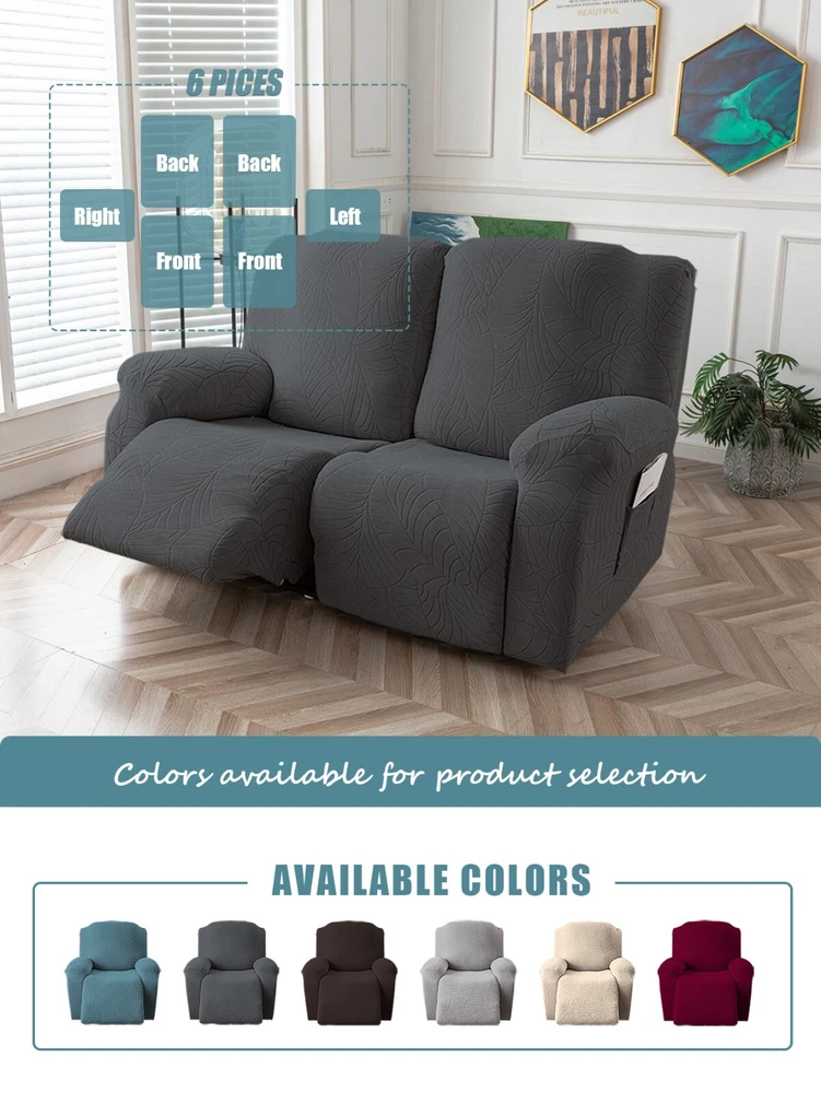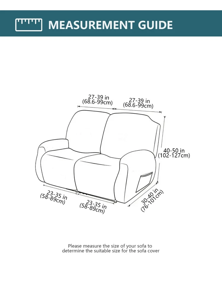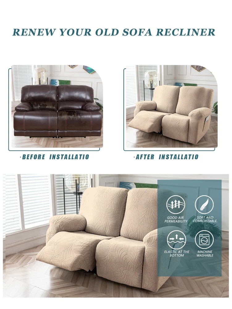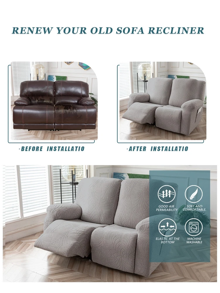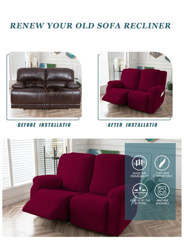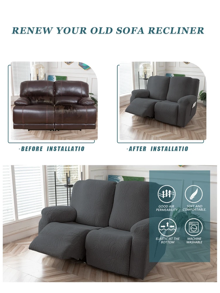 Great Quality Material: Recliner cover made of 88% polyester and 12% spandex jacquard fabric. The fabric is thick, highly elastic, and soft to the touch, providing excellent protection against stains, spills, scratches, and tears. The recliner chair couch cover gives your recliner sofa a luxurious and elegant new look. Fit Size:The slipcover has extra stretch that makes it suitable for most two-seater recliners, including regular recliners and those with consoles. The recliner slipcovers fits recliner that measure 48”-65” inches(center console not included). It's essential to follow the measurement guide details to confirm the size before purchasing. Easy to Install:This recliner cover is easy to install with the user manual provided. With its different colors, it's a quick and easy way to update the color or fabric of your existing furniture, making it a great and affordable way to redecorate on a budget. It's perfect for families with kids, pets, or worn-out couches. Thoughtful Design:The loveseat recliner cover is designed thoughtfully with two reclining chair covers and one center console cover, which can be purchased separately for convenient free combination. The cover stays in place with a bottom elastic strap, ensuring it doesn't move around. The pocket design on one side is also handy for placing your remote control, glasses, or any small items for easy access. Easy Care:This cover is easy to care for, protecting your furniture from accidental dirt such as water or dust. It maintains its fresh look after multiple washes and can be washed by hand or machine. The washing temperature is about 30 degrees Celsius, and mild detergent is recommended. It's important not to bleach or iron the cover.