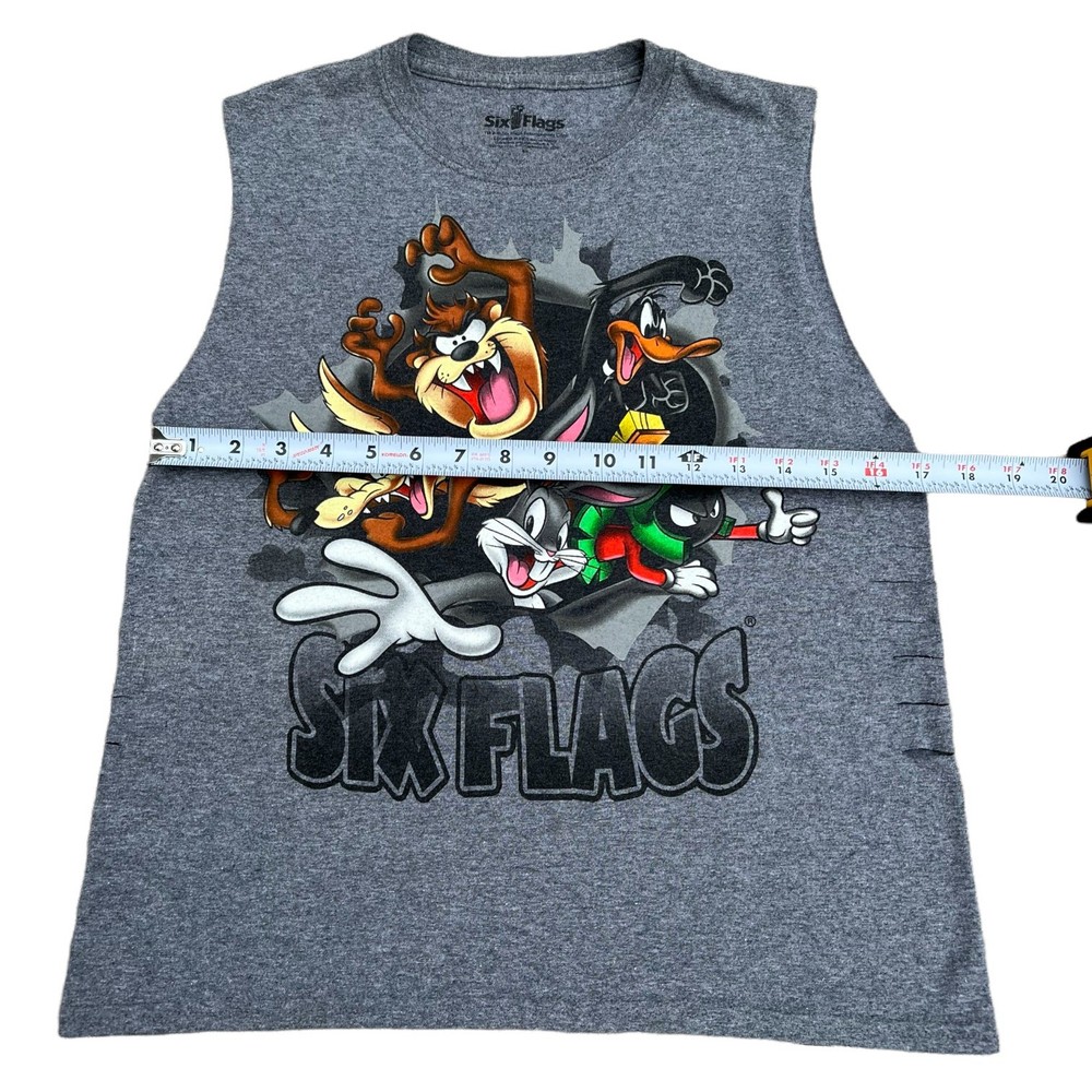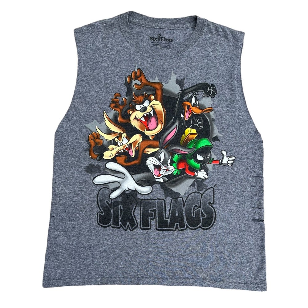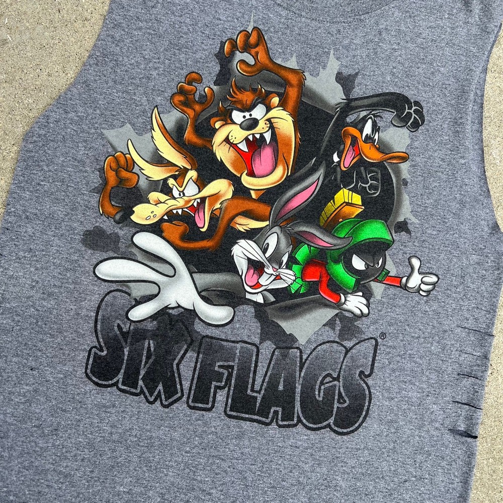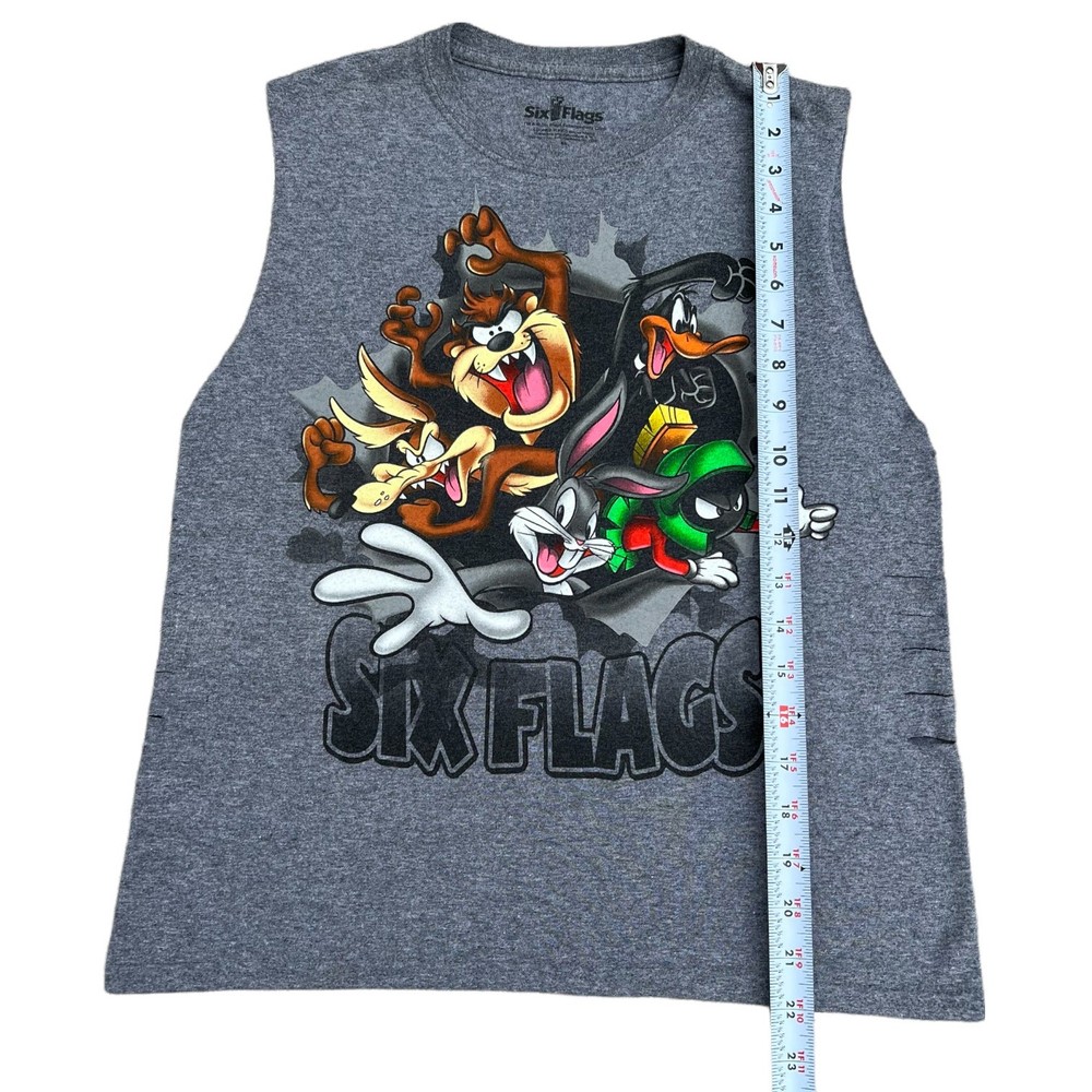 Warner Brothers WB Looney Tunes Six Flags 2015 Reimagined Double-sided Character Sleeveless Shirt Kids Sz M Upcycled sliced sleeves - cuts on side - photos are pre-washed (will share additional photos once washed) - all of the favorite characters: Wil E. Coyote, Taz, Daffy Duck, Marty Martian, and Bugs Bunny tearing through the front of the shirt with SIX FLAGS spelled-out Shop our many other Looney Tunes and reimagined listings!