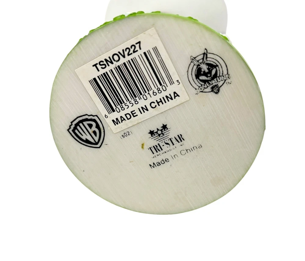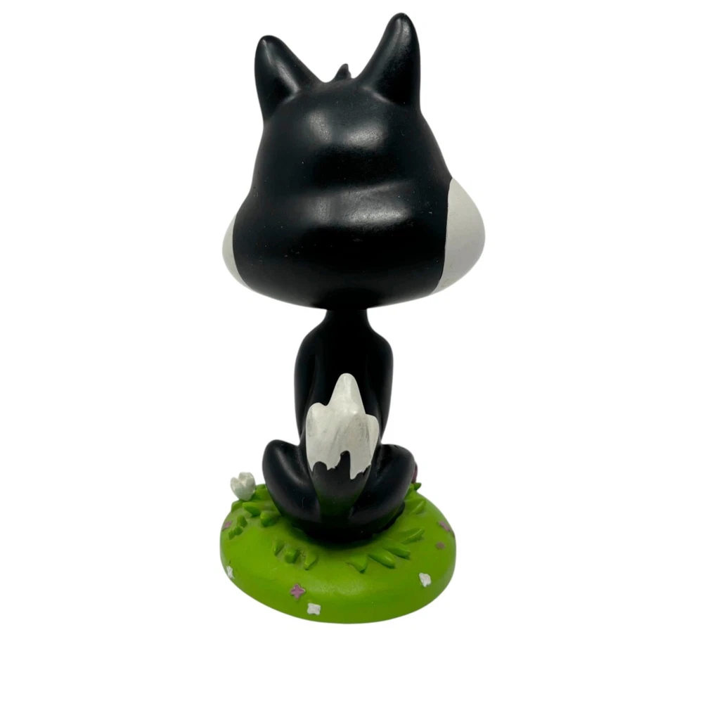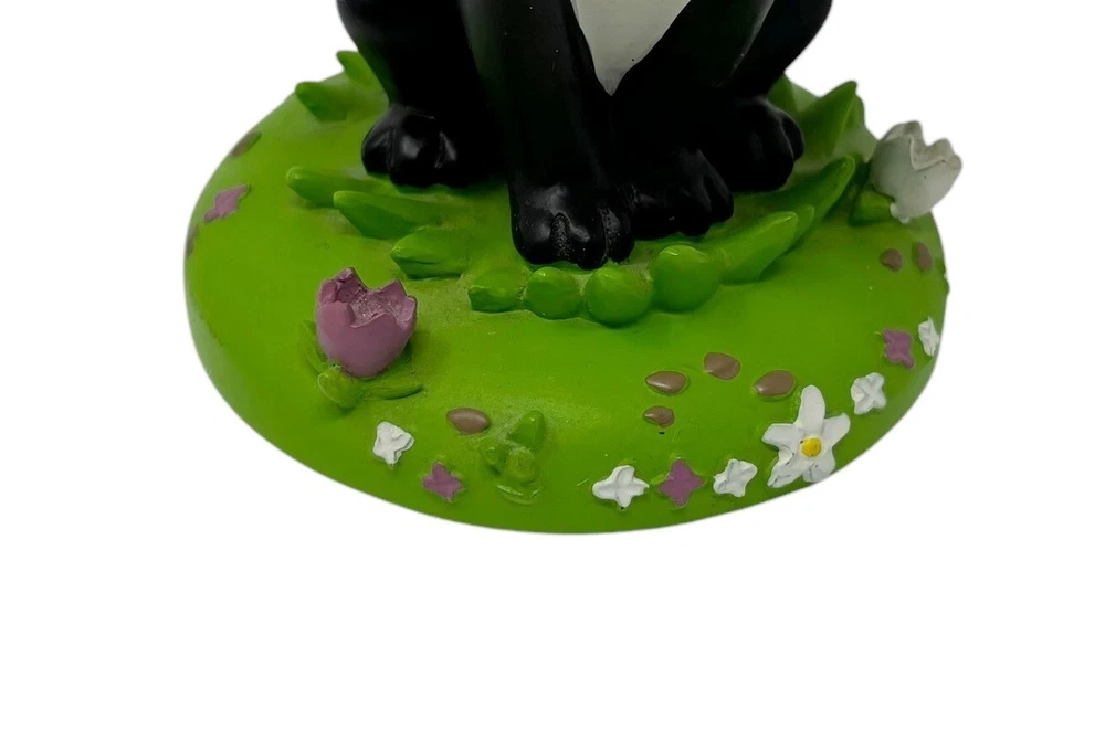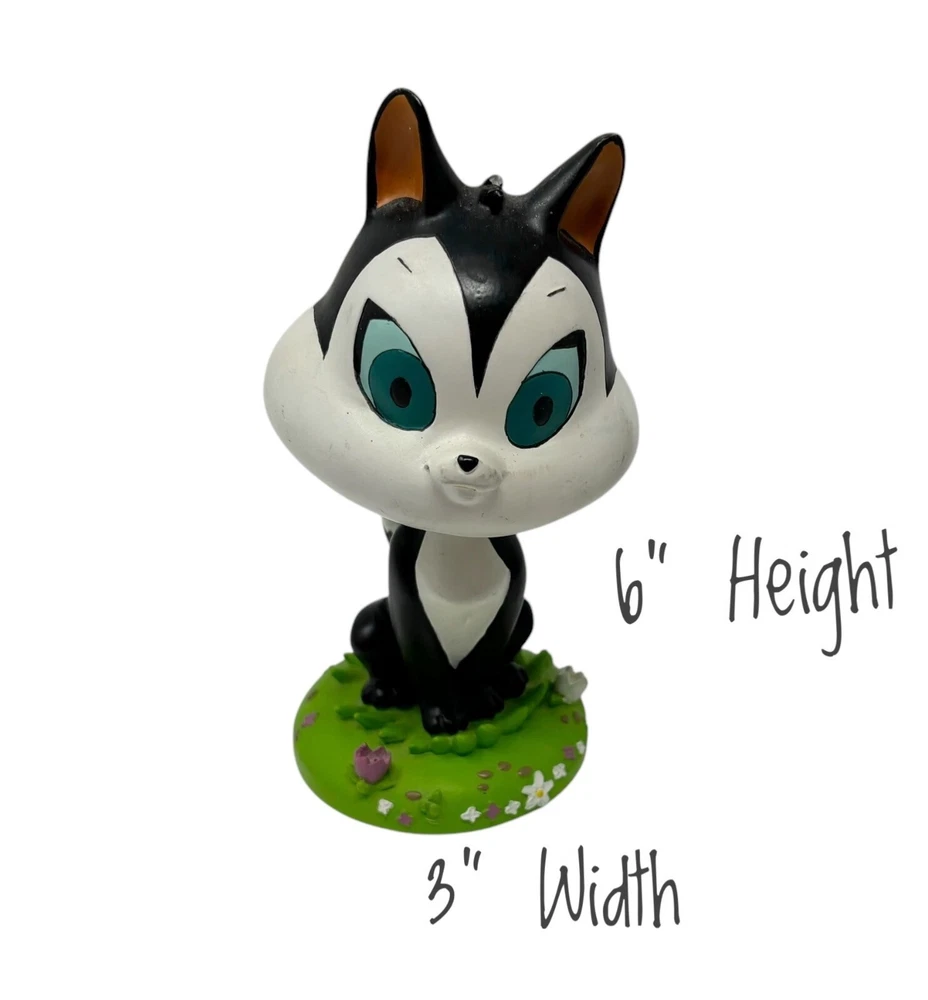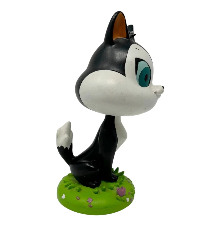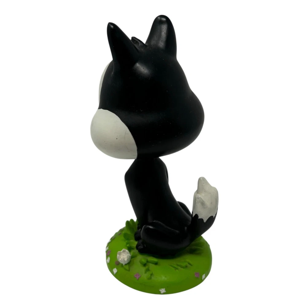 This Warner Bros Pepe Le Pew Penelope Bobble Head figurine features the skunk character sitting on a green base adorned with flowers. Ideal for collectors. • 6" height • 3" width • Flower-decorated base • Collectible item