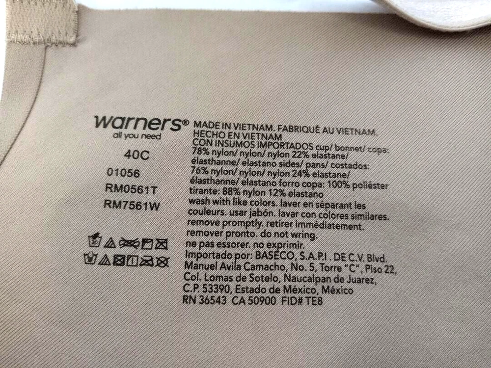 Warners Bra Womens Size 40C Beige Wireless Padded Adjustable Straps Soft Comfy *** Item Specifics *** Brand - Warner's Condition - *** Pre-Owned *** Excellent Condition *** Has Been Soaked, Washed, Cleaned And Disinfected With Lysol Type - Bra Color - Beige Size - 40C Material - Nylon, Polyester, Spandex Gender - Women Pattern - Solid Care - Machine Washable Made In - Vietnam PLEASE READ CAREFULLY !!! *** All Photo's Are Of The Actual Item(s) That You Will Receive Guaranteed *** *** Please Inspect Your Items That You Receive To Assure That They Arrived Safely *** We Ship From The U.S ***(1 Or Same Day Handling Time) If Item(s) Are Purchased On Or Before 1 PM EST Your Item(s) Will Be Shipped The Same Day Of Purchase.. We Offer FREE 30 Day Money Back Guarantee Returns On All Items ... UNDAMAGED Unless Its The Carriers Fault Please Contact Us In A Timely Manner Of Any Issue.. Thank You For Stopping By And Have A Great Day!! HAPPY AND SATISFIED CUSTOMERS ARE OUR # 1 PRIORITY !!!