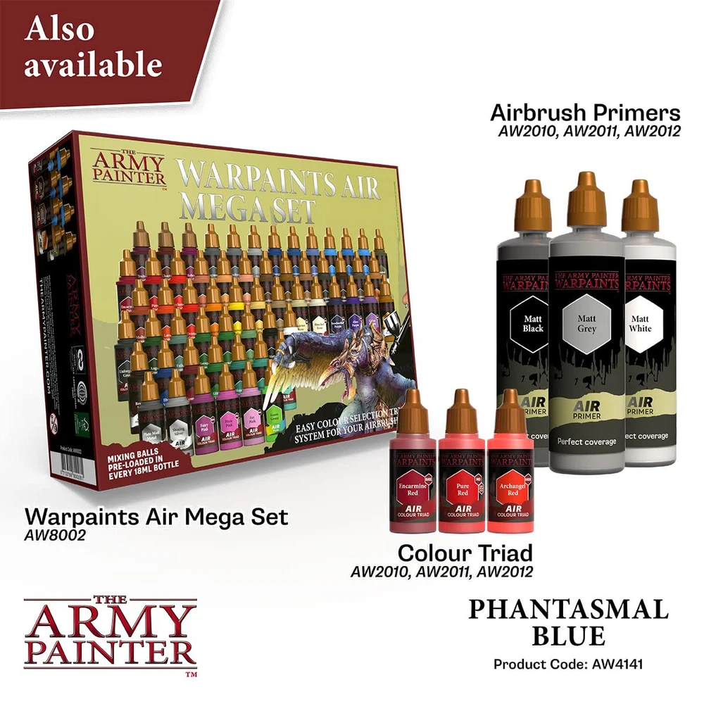 All Warpaints Air are pre-mixed and airbrush-ready right out of the bottle and made from ultra-filtered vibrant pigment. The Warpaints Air range has been developed in a unique and innovative Triad System – each matching Warpaints Acrylics colour has a corresponding Base and Highlight colour. This makes highlighting and zenithal shading a breeze and army painting even faster and more cohesive. To make things easier Warpaints Air comes pre-loaded with steel Mixing Balls. READY TO USE AIRBRUSH PAINTS - The Warpaints Air Acrylic Paints are designed to be ready to use right out of the bottle with perfect consistency for use in your airbrush. We use heavy pigments which optimal coverage, allowing you to paint with fewer layers for a quicker paint application. INNOVATIVE COLOUR TRIADS – The Warpaints Air range has been organized into matched colour triads for easy colour selection and matching. Simply choose your triad and you have shadow, midtones and highlights all laid out for you. The paints are of unparalleled quality due to the nature of the high coverage offered by the specially chosen and ultra-filtered vibrant pigments. This, combined with a very stable and matchless resin solution, is paint science at its best! PRECISE AND EASY-TO-SQUEEZE BOTTLES – Our airbrush paints come in soft 18ml bottles pre-loaded with mixing balls. All with precise dropper design, making it easy to administer medium in exact quantities. The dropper bottle makes our paints very convenient for using in airbrushes. NON-– Our Acrylic Warpaints are non-and safe to use for anyone just starting out miniature painting, as well as for the advanced hobbyist concerned with their without compromising on the quality of their tools. BORN FROM GAMING – is the brainchild of wargaming and painting veterans of many years Bo Penstoft and Jonas Færing – We wanted to produce a product line that could have carried us all the way from the level of novice to experienced painters and gamers when we first started out. With our aim is to help you get awesome painted models on the table, and still get more time for Gaming!