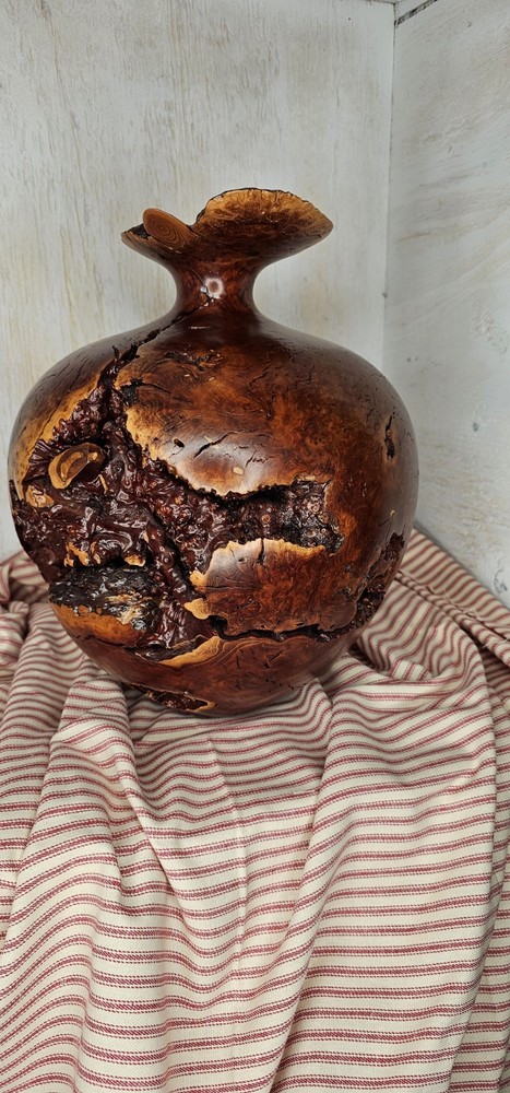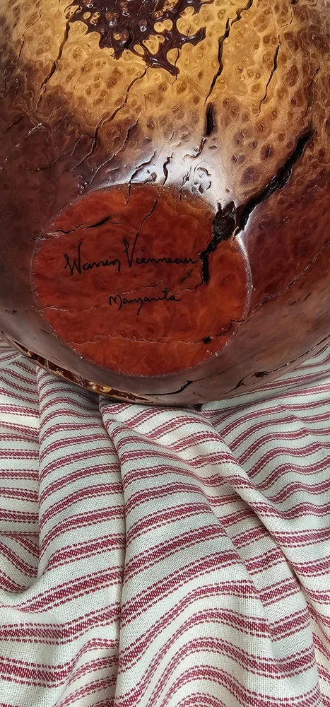 Warren Vienneau Manzanita Burl Wood Vase 11 inch tall 10 inch round signed by artist on bottom One of a kind has very cool voids cracks and holes all occurring naturally from the growth of the tree! The top is unusual as it's not symmetrically turned it's a natural shape oblong with a 3/4 inch approximately hole in center!