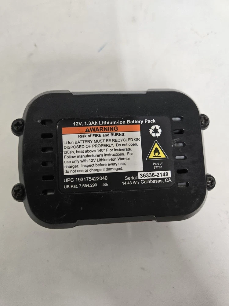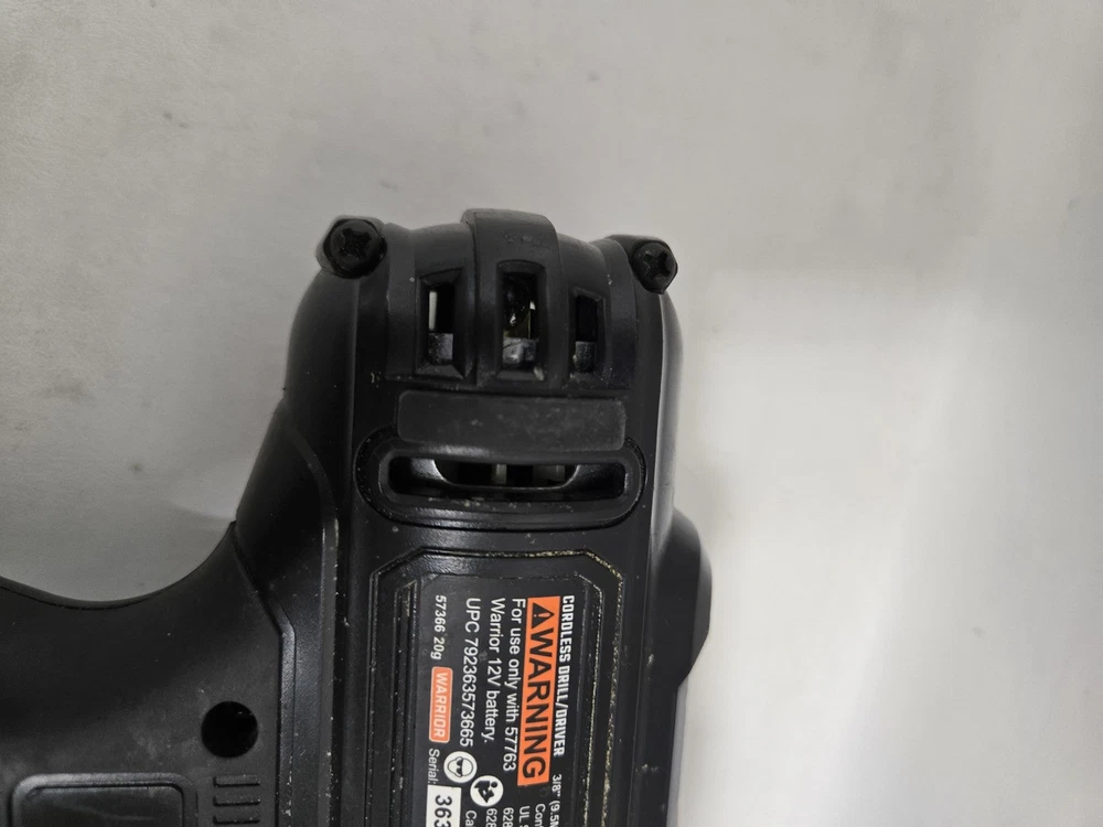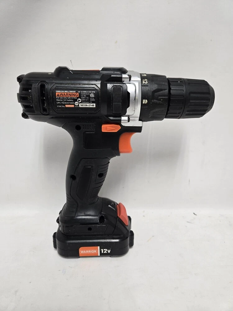 Set Includes:TOOL, BATTERYBrand:WARRIORMPN:Does not ApplyNumber of Items in Set:2Battery Technology:LITHIUM-IONBattery Included:YesMotor Type:BRUSHEDModel:57366Voltage:12VNumber of Batteries:1Maximum Torque:132 IN/LBAuxiliary Handle:NoType:DRILLChuck Type:KEYLESSBattery Capacity:1.3AHPower Source:BATTERYColor:BLACKChuck Size:3/8Speed:550RPM