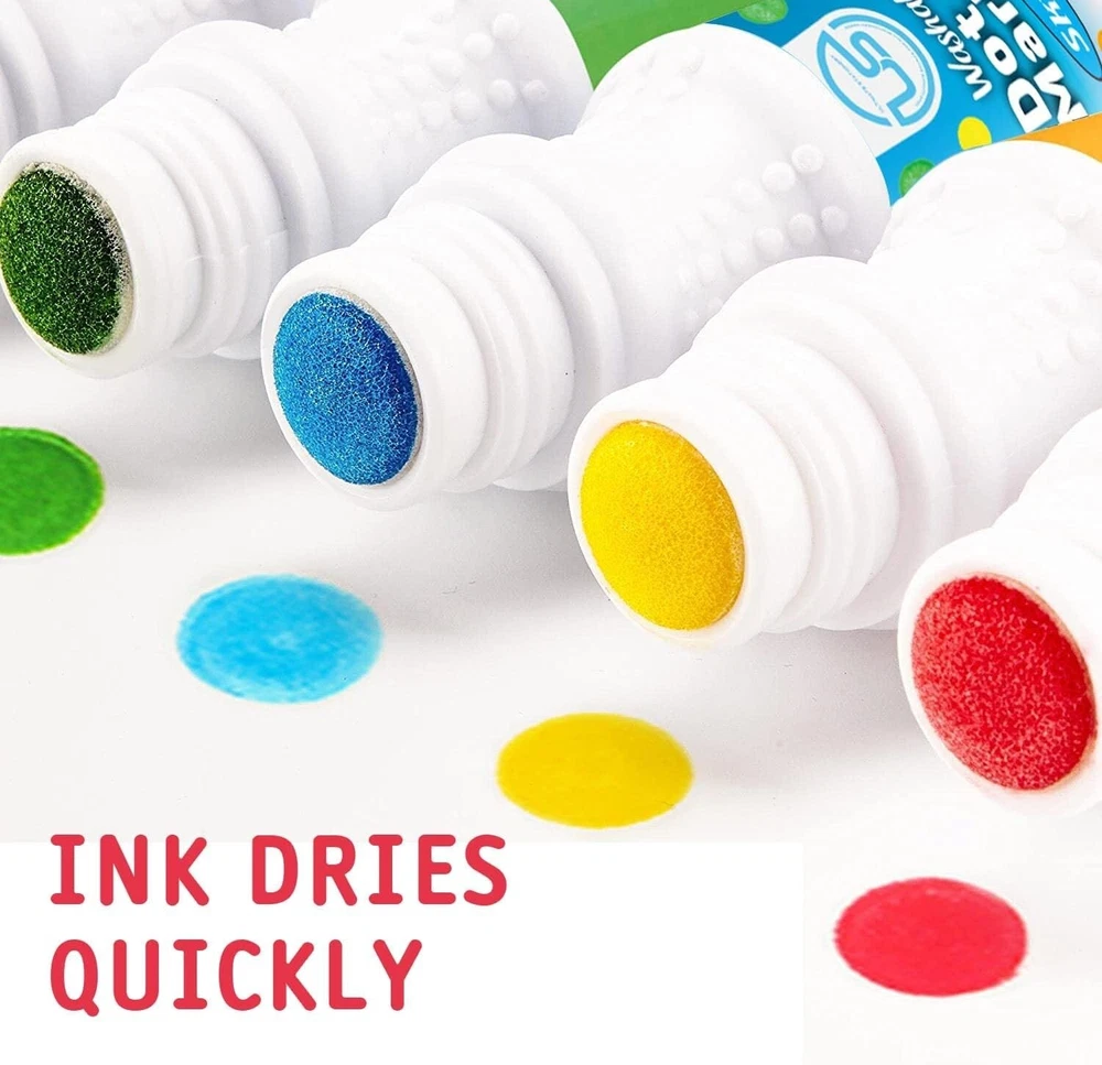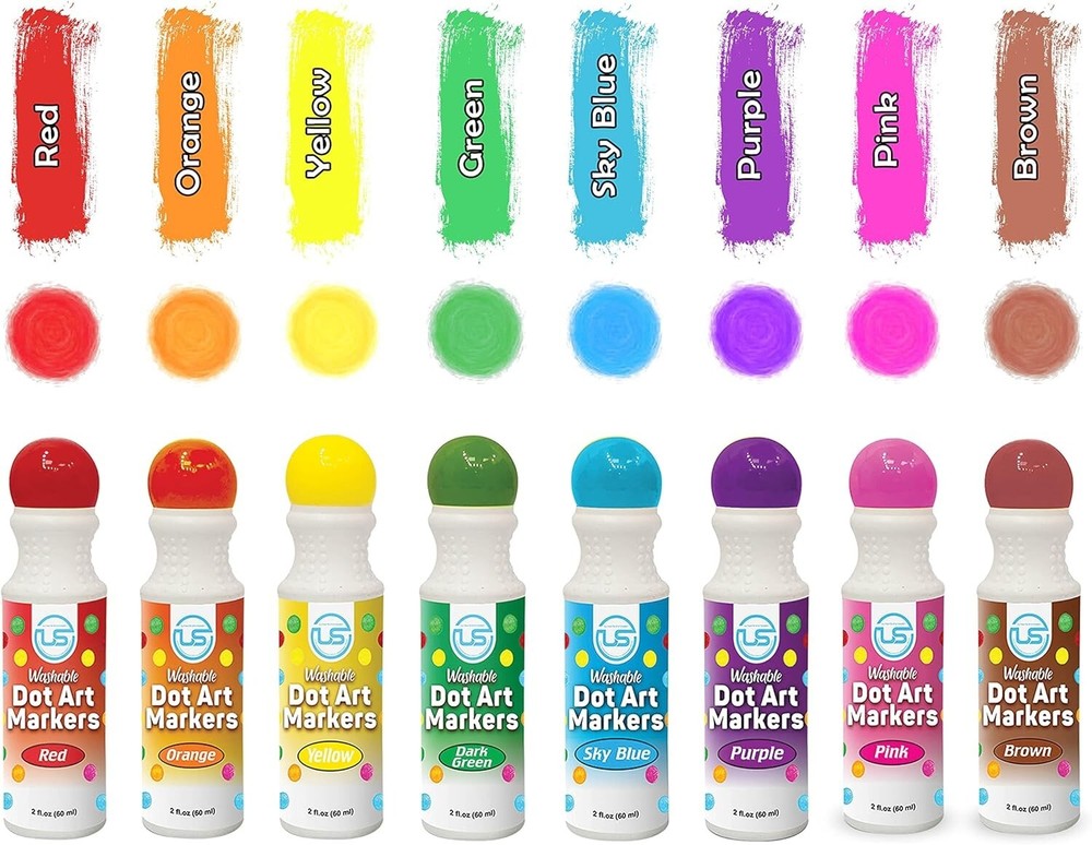 Dot Markers | Bingo Daubers | Washable 8 Colors Dot Markers for Toddlers and Kids Dot Art. Toddler Arts and Crafts DOT MARKERS BOX Includes 8 Bright Color Washable Dot Markers for toddler art supplies and kids of all ages to create colorful artwork. NO MESS, LEAK FREE: Toddler activities Dot Paint for toddlers is the best toddler art activity fun that is washable, clean and mess free with minimal clean up! BINGO MARKERS: larger dauber sponge tip will not dry out and makes washable paint dab pens fun for kids, toddler painting and toddler craft. EASY TO GRIP BOTTLES: Our 2-ounce bottle dabber are professionally designed to be easy gripped for little hands. A Perfect Washable Paint Set that can be sent as a Holiday gift for kids! Easter Gifts - Dot paint makes a great gifts for girls, boys and kids of all ages, young artists will love to receive their own paint set as christmas gifts for kids, birthday, holiday or special event. TODDLER ART DOT COLORING IS FUN, CREATIVE AND EDUCATIONAL: Coloring with dot pens helps toddlers develop important skills - like shape and color recognition, hand-eye coordination, focus, and memory - while having fun!