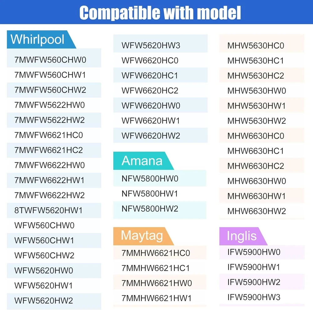 W11314648 Washer Door Boot Seal Compatible with whirlpool duet washer door seal:W11314648 washer boot seal replacement for W11314648, W10897390, 4931032, AP6835703, PS12711495, EAP12711495 whirlpool washer replacement parts. Upgraded Maytag W11314648 boot seal fixes the following symptoms: A: Door seal cracked and damaged; B: Door seal prevents washing machine door from closing tightly; C: Continuous water leakage from the door seal during operation; D: Mould on door seals and bad smells; E: Abnormal noise. W11314648 Door Boot Seal:Durable whirlpool front load washer door seal W11314648 boot seal compatible with Whirlpool, Maytag, Amana, Inglis front load washer boot seal.Compatible with Whirlpool 7MWFW560CHW0 7MWFW560CHW1 7MWFW560CHW2 7MWFW5622HW0 7MWFW5622HW2 7MWFW6621HC0 7MWFW6621HC2 7MWFW6622HW0 7MWFW6622HW1 7MWFW6622HW2 8TWFW5620HW1 WFW560CHW0 WFW560CHW1 WFW560CHW2 WFW5620HW0 WFW5620HW1 WFW5620HW2 WFW5620HW3 WFW6620HC0 WFW6620HC1 WFW6620HC2 WFW6620HW0 WFW6620HW1 WFW6620HW2 washing machine. W11314648 Washer Door Seal Gasket:Upgraded w11314648 washer door bellow fit various washer models.Compatible with Maytag 7MMHW6621HC0 7MMHW6621HC1 7MMHW6621HW0 7MMHW6621HW1 MHW5630HC0 MHW5630HC1 MHW5630HC2 MHW5630HW0 MHW5630HW1 MHW5630HW2 MHW6630HC0 MHW6630HC1 MHW6630HC2 MHW6630HW0 MHW6630HW1 MHW6630HW2 washing machine.Compatible with Amana NFW5800HW0 NFW5800HW1 NFW5800HW2 washing machine.Compatible with Inglis IFW5900HW0 IFW5900HW1 IFW5900 HW2 IFW5900HW3 washing machine.