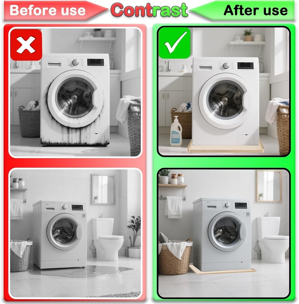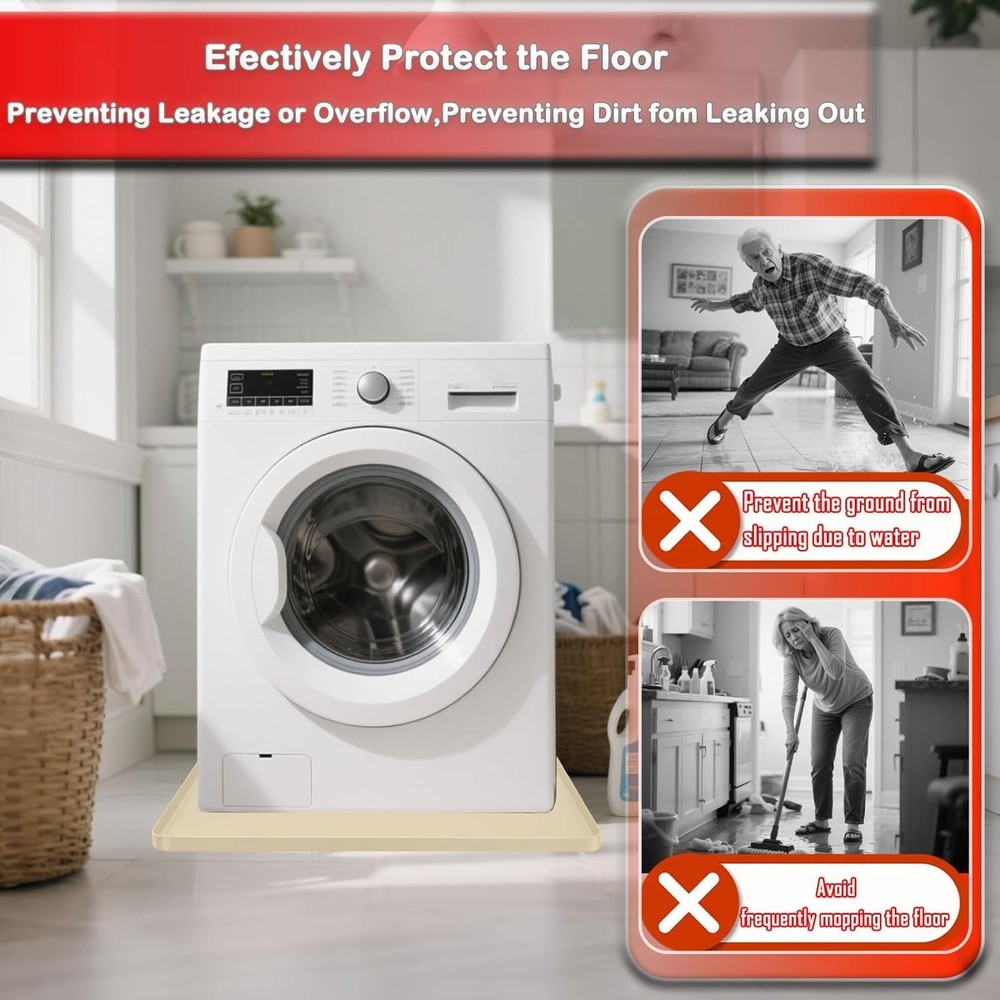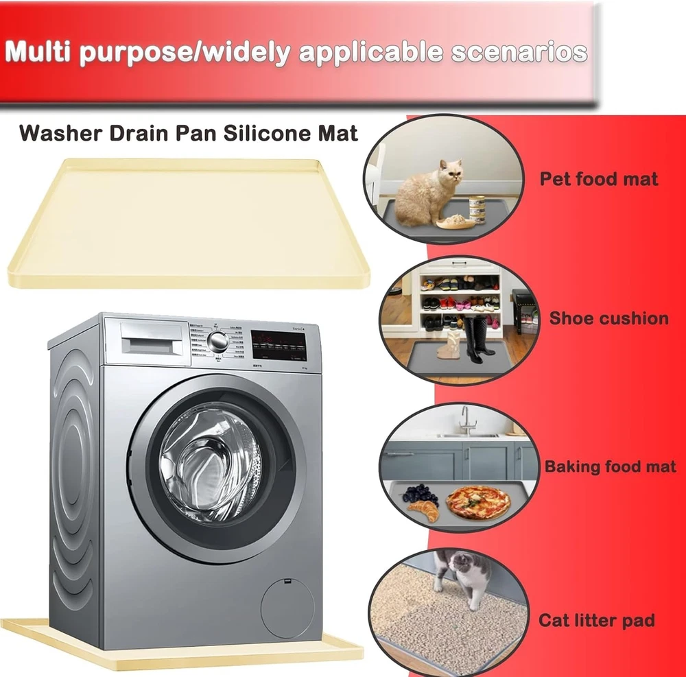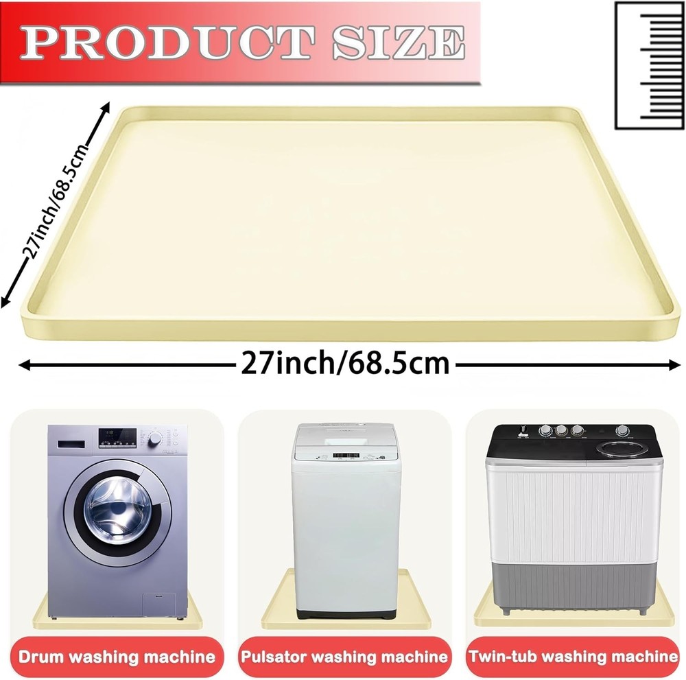 High Quality Silicone: Our Washing machine silicone pad mat has good flexibility, can be folded and rubbed at will for easy storage. Silicone material is heat-resistant, even in high temperature conditions can ensure intact. it can fit perfectly on the bottom of the washing machine, and can also be used as a storage tray for various items Anti-Slip and Leak-Proof: Portable washing machine mat is designed with high edges all around 0.79inch/2cm, which can hold a large amount of water, preventing leakage or overflow, preventing dirt from leaking out, which can effectively protect the floor or cabinet Anti-Vibration & Non-Slip Design: The washing machine mat is a non-slip and waterproof backing, prevents water or other liquids from flowing on the floor. Our silicone washing machine tray absorbs vibrations and reduces noise during operation. Its non-slip bottom prevents washer movement and protects floors from scratches and damage Widely used: This mat Ideal as the bottom of washing machine, refrigerators, dishwashers, dryers, wine cabinet, juicer coffee machine, or other household appliances, they can also be used in bedrooms, kitchens, living rooms, offices, bars and entertainment venues Easy to clean: Clean up easily by rinsing, or simply wipe down the mat with a wet cloth. Dries up quickly and is dishwasher safe, The size of our silicone mat is 27''x27''. Please be sure to measure the size of washing machine before purchasing to ensure it fits The Washer Drain Pan is a versatile and practical accessory for your kitchen. Made of silicone and measuring 27x27 inches, this non-slip drip tray is perfect for catching spills and drips from your electric washer. The glossy white finish adds a sleek look to your countertop, while the included components make it easy to set up and use. Designed for maximum convenience, this multi-function tray is a must-have for any home chef looking to keep their kitchen clean and tidy.