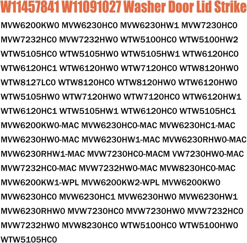 Washer Lid Lock Replacement Maytag Whirlpool Door Latch Parts 2 Pack Description 【W11457841 washer lid strike】 【W11457841 washer lid strike】Compatible with: Whirlpool,Kenmore,Maytag KitchenAid,Magic Chef,Jenn-Air, Amana,Roper, Admiral,Norge, washing machine. Replacement : W11091027, 4959179, AP6987306, PS16218028, EAP16218028, PD00061788. 【W11091027 Washer Lid Strike】 Fits washing machine models :MVW6200KW0 MVW6230HC0 MVW6230HW1 MVW7230HC0 MVW7232HC0 MVW7232HW0 WTW5100HC0 WTW5100HW2 WTW5105HC0 WTW5105HW0 WTW5105HW1 WTW6120HC0 WTW6120HC1 WTW6120HW0 WTW7120HC0 WTW8120HW0 WTW8127LC0 WTW8120HC0 WTW8120HW0 WTW6120HW0 WTW5105HW0 WTW7120HW0 WTW7120HC0 WTW6120HW1 WTW6120HC1. 【Replacement Washer Lid Strike】 Fits washing machine models :MVW6200KW0-MAC MVW6230HC0-MAC MVW6230HC1-MAC MVW6230HW0-MAC MVW6230HW1-MAC MVW6230RHW0-MAC MVW6230RHW1-MAC MVW7230HC0-MACM VW7230HW0-MAC MVW7232HC0-MAC MVW7232HW0-MAC MVW8230HC0-MAC MVW6200KW1-WPL MVW6200KW2-WPL MVW6200KW0 MVW6230HC0 MVW6230HC1 MVW6230HW0 MVW6230HW1 MVW6230RHW0 MVW7230HC0 MVW7230HW0 MVW7232HC0 MVW7232HW0 MVW8230HC0 WTW5100HC0 WTW5100HW0 WTW5105HC0 WTW5105HC1 WTW5105HW1 WTW6120HC0. 【Premium Quality】 Washer Door Strike It has a durable plastic construction for reliable strike W11457841 attaches to the washer lid and activates the lid switch when the lid closes. If your washer lid or door won't close, or won't start at all, you likely have a faulty door strike. 【Easy to Install】 Installation is simpler than you'd expect. To replace, rotate counter-clockwise to break the retaining tab and pull install, rotate clockwise until you hear the retainer tab click into place. Features: 【Wide Compatibility】W11457841 washer lid strike Suitable for washing machines from brands such as Whirlpool, Kenmore, Maytag, and KitchenAid, ensuring that your device can be perfectly matched. 【Washer Lid Lock】lid lock for maytag washer Replacement : W11091027, 4959179, AP6987306, PS16218028, EAP16218028, PD00061788. Durable Maytag Washer Lid Lock - Secure Your Laundry with Confidence! 【High Quality Materials】Our Maytag washing machine door locks are made of durable materials, ensuring worry free long-term use. W11457841 lid lock attaches to the washer lid and activates the lid switch when the lid closes. 【Security Protection】This maytag lid lock can firmly lock the washing machine door to prevent accidental opening, ensuring that your clothes are always safe and reliable during the washing process. 【Easy to Install】w11457841 lid lock Installation is simpler than you'd expect. To replace, rotate counter-clockwise to break the retaining tab and pull back.To install, rotate clockwise until you hear the retainer tab click into place. Product Details: Brand: Kscjdg Color: 2 Pack Material: Plastic Style: Above Ground Item Weight: 0.31 Ounces Manufacturer: Kscjdg Brand Name: Kscjdg Model Info: W11457841 Washer Lid Lock Item Weight: 0.31 ounces Package Dimensions: 2.48 x 2.44 x 1.38 inches Item model number: W11457841 Washer Lid Lock Part Number: W11457841 Material Type: Plastic Included Components: washer lid strike Batteries Included?: No Batteries Required?: No Brand: Kscjdg Color: 2 Pack Material: Plastic Style: Above Ground Item Weight: 0.31 Ounces Manufacturer: Kscjdg Handling We will ship all orders within 3 business day of payment. Delivery We take pride in offering fast and reliable delivery for your orders! We are committed to getting your products to you as quickly as possible. Generally, we would like to inform you that all orders will be delivered to you within 1-3 business days after processing.However, in some cases, delivery times may vary depending on the buyer's location. Especially in remote or rural areas, the expected delivery time may be extended. In such situations, we do our best to ensure that your order reaches you as quickly as possible.If there are any delays, we will be happy to contact you to explain the situation. Our goal is to enhance your satisfaction with our fast delivery times. We work diligently to ensure that your order arrives safely.Trust us and enjoy our speedy delivery! Return Policy All items qualify for returns within 30 days of receipt. Buyer is responsible for return shipping on any item that is not damaged. Feedback We take our reputation seriously, we buy and sell online, so we understand the value of trust. If you are unsatisfied with your order, please contact us and we will work with you to resolve it to your satisfaction.
