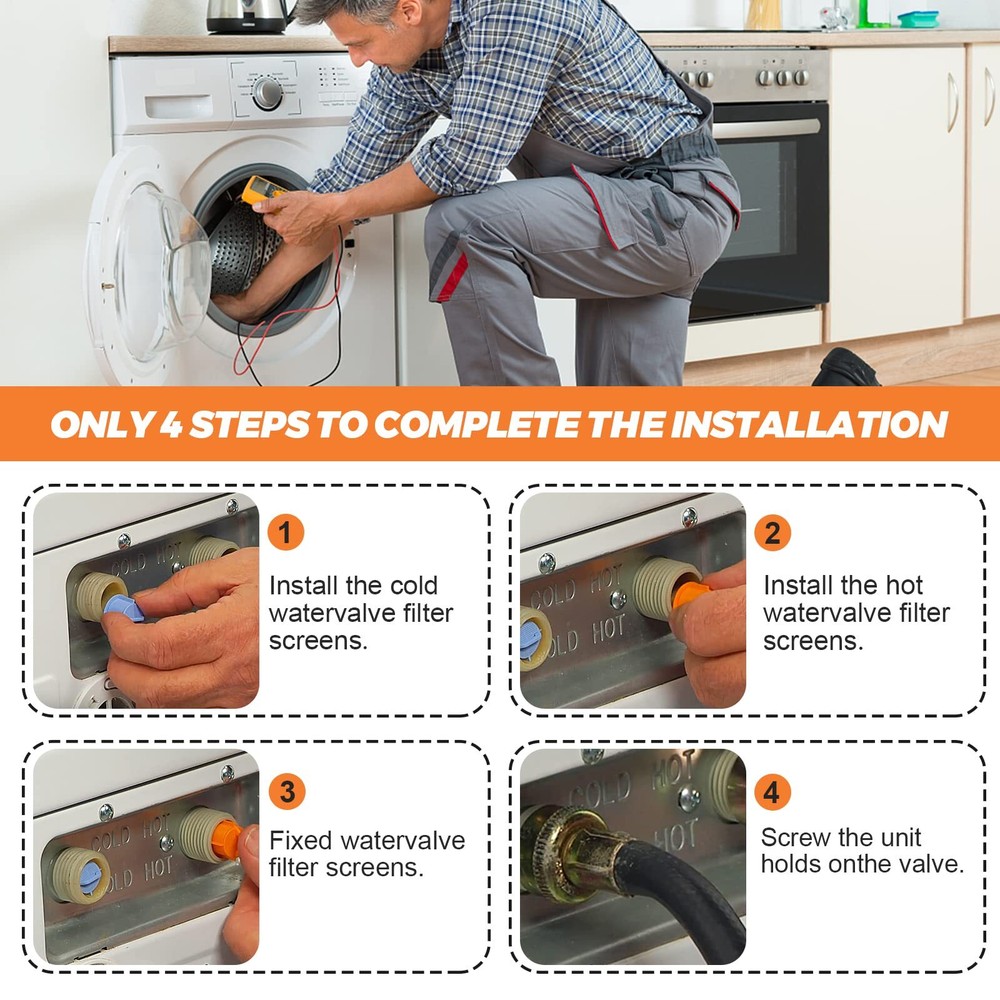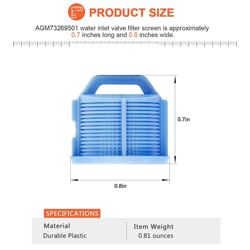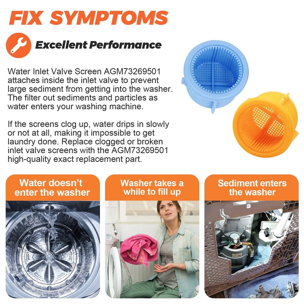 Replacement Washer Water Inlet Valve Filter Screen for Washing Machine 【AGM73269501 WASHER WATER INLET VALVE FILTER SCREEN】--- Water Inlet Valve Screen AGM73269501 attaches inside the inlet valve to prevent large sediment from getting into the washer. It filters out sediments and particles as water enters washer. If the AGM73269501 washer filter screens clog up, water drips in slowly or not at all, making it impossible to get laundry done. Replace clogged or broken inlet valve screens with the AGM73269501 high-quality exact replacement part. ➤AGM73269501 washing machine filter screen SOLVES THE FOLLOWING PROBLEMS: ①The Washer inlet water flow becomes small. ②No water enters the washer. ③Filter blockage. ④Impurities in the water flow due to broken filters 【HIGH QUALITY】--- The package includes 2 x hot water filter screens and 2 x cold water filter screens. The AGM73269501 washer inlet filters are made of high quality ABS plastic and color-coded for easier installation, makes stronger, less likely to break, and is reusable. The hot water filter screen is orange and the cold water filter screen is blue. The inlet valve filters are identical except for the colour of the plastic, and you can use either colour. ➤It is recommended that these ABS plastic screens be used instead of rubber gasket type moulded steel mesh screens, which can break down due to rust and corrosion after a period of time 【180 DAYS GUARANTEE】--- The AGM73269501 Water Inlet Valve Filter Screen supports 180 DAYS AFTER-SALES SERVICE. Within 180 DAYS from the date of purchase, if the AGM73269501 washing machine water inlet valve filter has a quality problem or other reasons, you can ask for after-sales service. The agm73269501 washer inlet filter screen will help to keep the water clear and prevent any dirt, rust or sediment from entering the washer, reducing the likelihood of blocking valves and hoses. The AGM73269501 washing machine water inlet screen is not easy to deform 【WIDE COMPATIBLE】--- AGM73269501 Washer Water Inlet Valve Filter Screen fits for LG, Kenmore and Sears washer. AGM73269501 Washer Water Screen Replace: 1810261, AP5202486, PS3618281, EAP3618281, EA3618281, AH3618281, etc. If you are not sure whether AGM73269501 Water Valve Filter Screen is right for your model, please contact us and we will confirm it for you. ➤The AGM73269501 washing machine filter screen is resistant to deformation. Older cold water filters are more likely to become clogged with calcium deposits, sand etc, which can affect the performance of your washing machine. Please replace them promptly to maximise the water flow and performance of your washing machine 【EASY TO INSTALL】--- Disconnect the power and shut off the water supply before installing this AGM73269501 washer valve filter screen part. Wear work gloves to protect your hands. The installation needs to use a pair of gloves and screwdriver. Simply place the AGM73269501 filter screen on the water valve where it connects to the water pipe and then secure the water pipe to the valve. Be careful not to install the filter screen upside down when installing. NOTE: Use ABS plastic filters instead of steel mesh filters because steel mesh filters are prone to rust and corrosion, which is more likely to cause rust to block the mesh holes or corrosion leading to steel mesh breakage Shipping We offer FREE shipping on all orders! We ship within Three business days of payment, usually sooner. We use a selection of shipping services such as UPS, FedEx, USPS etc. We only ship to the lower 48 states, no APO/FPO addresses or PO Boxes allowed. Local pickups and combined shipping options are not provided at this time. Return You can return a product for up to 30 days from the date you purchased it. Any product you return must be in the same condition you received it and in the original packaging. Please keep the receipt. Payment We accept payment by any of the following methods: PayPal Please pay as soon as possible after winning an auction, as that will allow us to post your item to you sooner! Feedback Customer satisfaction is very important to us. If you have any problem with your order, please contact us and we will do our best to make you satisfied. Contact Us If you have any queries, please contact us via ebay. We usually respond within 24 hours on weekdays. Please visit our eBay store to check out other items for sale! Thank you for shopping at our store.