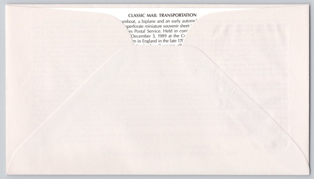 First Day Cover, 25¢. First Day Cover with a 25¢ USA "Classic Mail Transportation" commemorative stamp, cancelled Washington, DC, Nov 19, 1989 (20066). Left cachet reads "20th Universal Postal Congress / 1989 World Stamp Exposition" and the envelope is marked "Caches Limited Edition." Back shows a printed explanatory insert headed "Classic Mail Transportation." No recipient address or handwritten message is present Notes for Cover Collectors: • High-resolution scans of front and back are provided; use zoom to inspect postmarks, cachet details, and backstamps. • No third-party grading; condition is shown in the images.